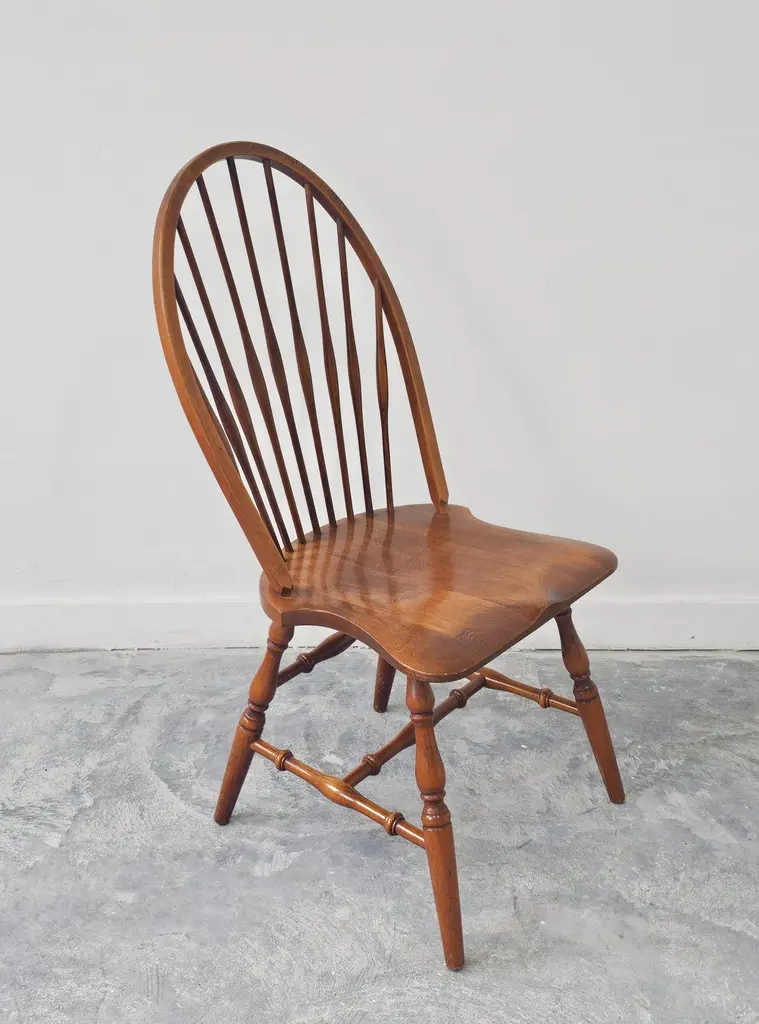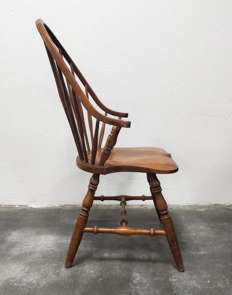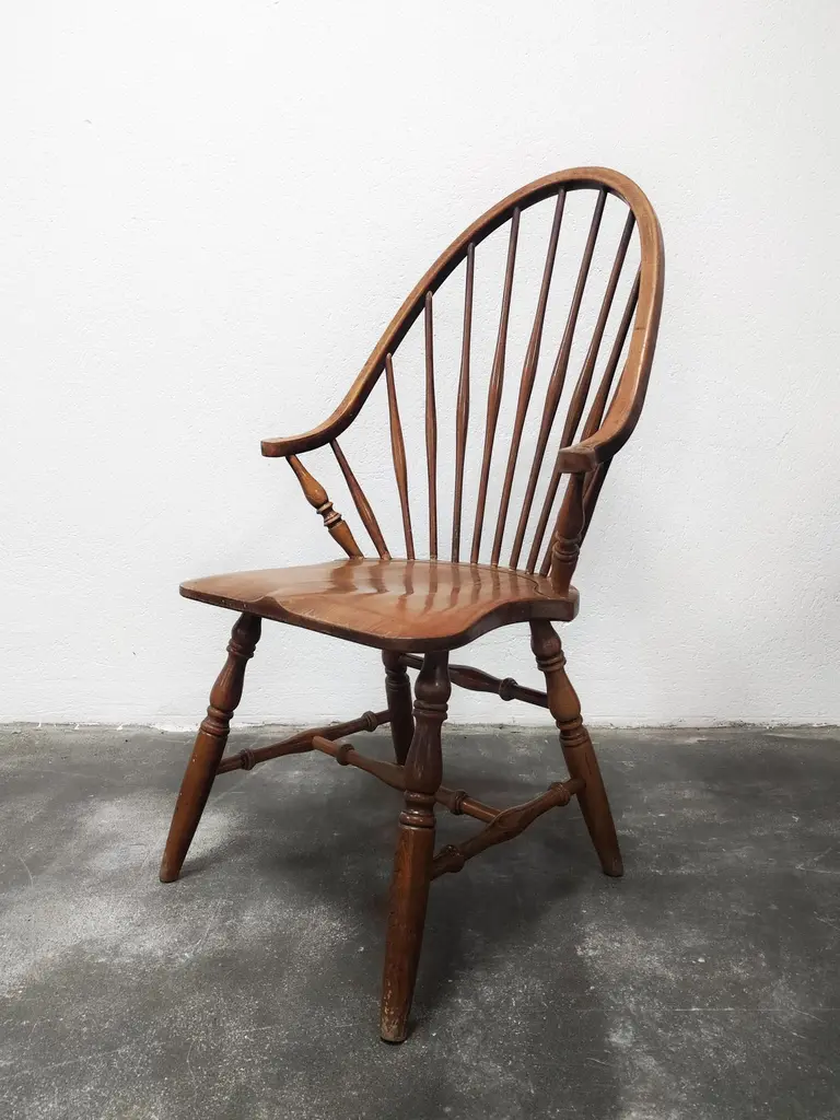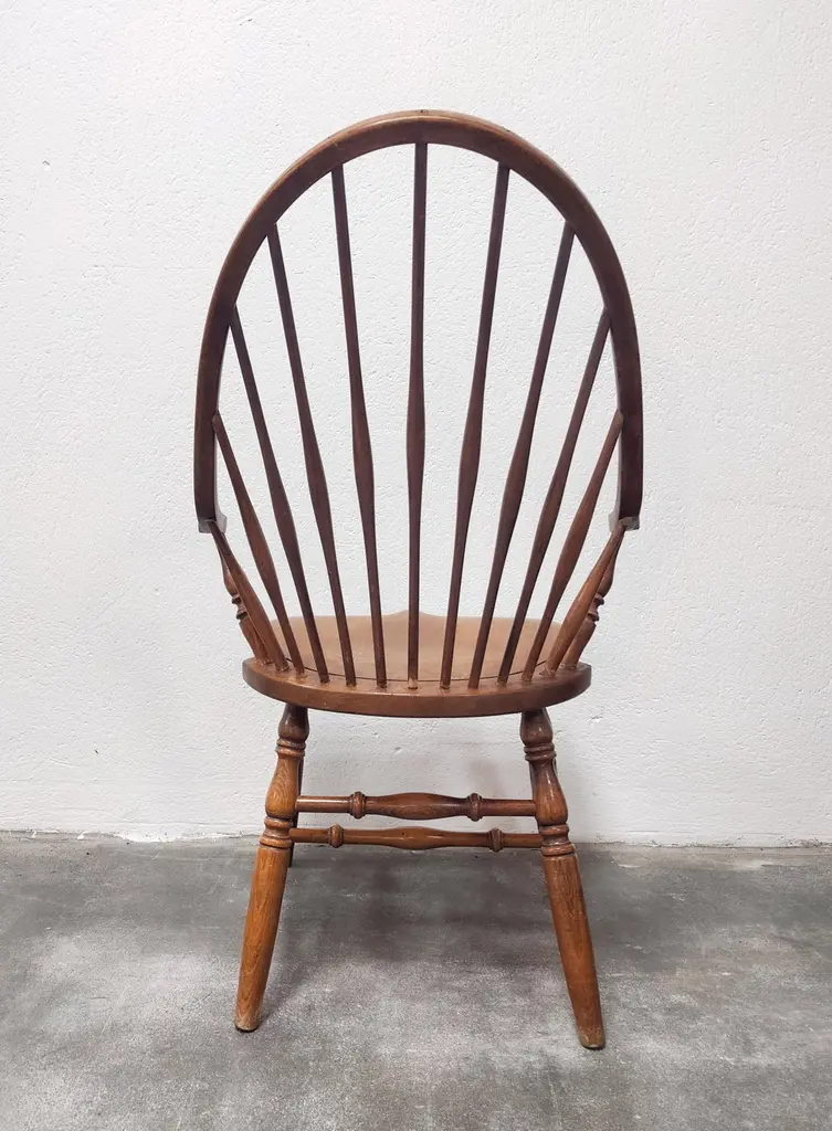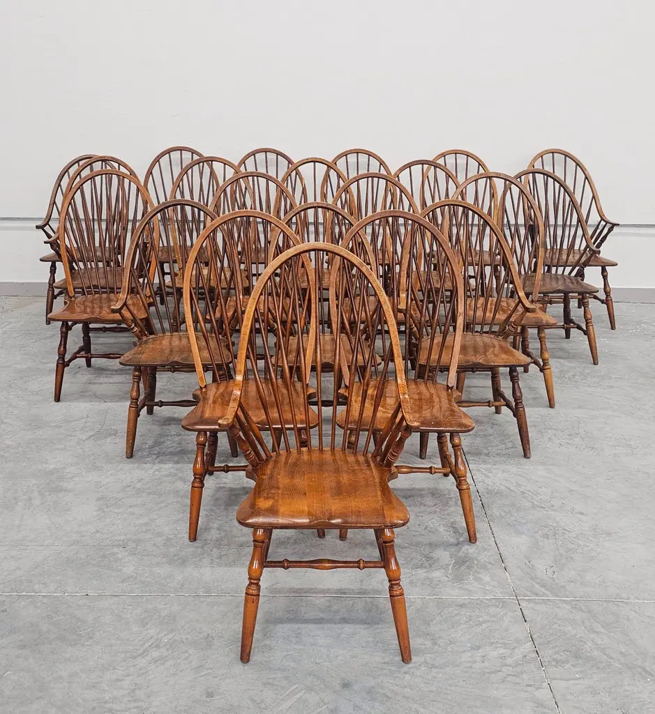 In this listing you will find 20 Windsor dining chairs and armchair done in solid Beech, manufactured in Yugoslavia in 1950s. There is 20 chairs available, out of which 9 are with and 11 without the armrests.They feature tall spindle back, making it one of the rarest models in the long line of Windsor chairs. The chair is done in solid beech wood and it is pretty heavy. Sings of time and use can be seen - dried out varnish, small chips and dents, fading. Despite all of it, chairs are sturdy and ready for use. Each chair has a stamp on the back of its seat that claims its origin - MADE IN YUGOSLAVIA. Please check the listed pictures to get an idea. If you are interested in purchasing more than one piece, please reach out for the adjusted shipping quote.