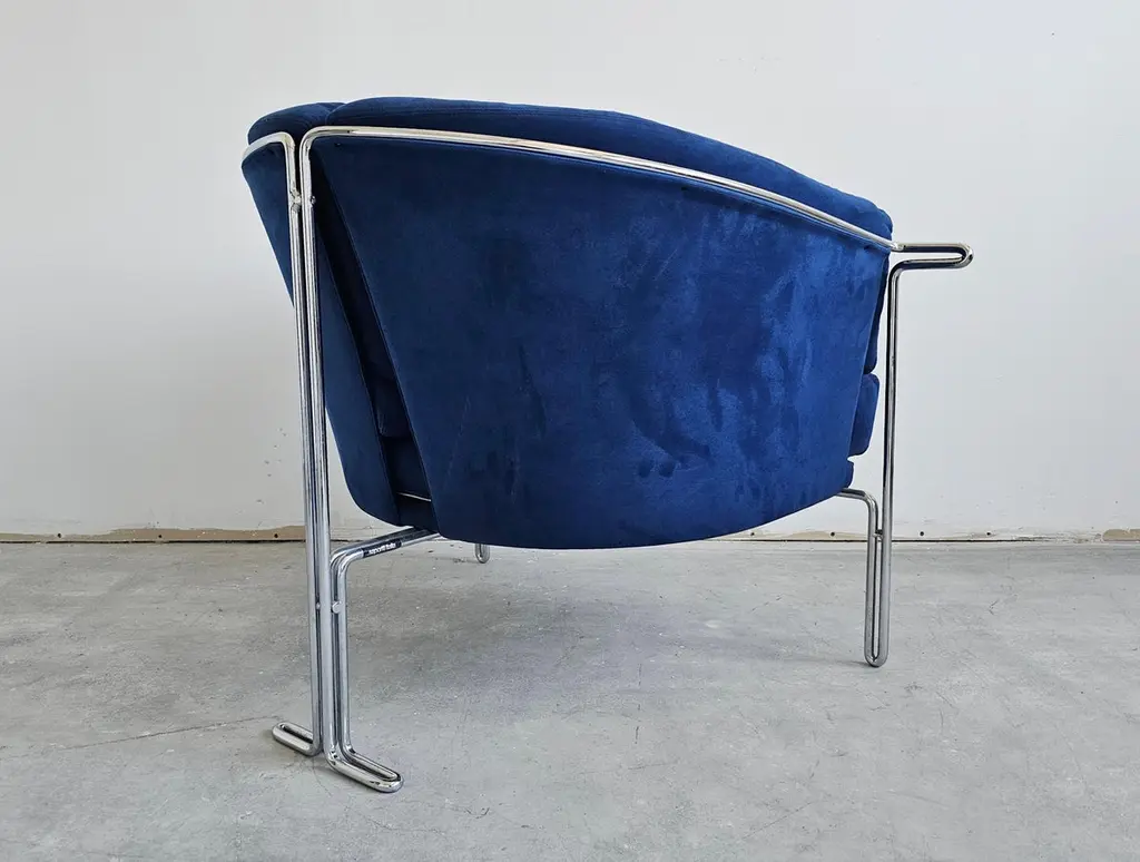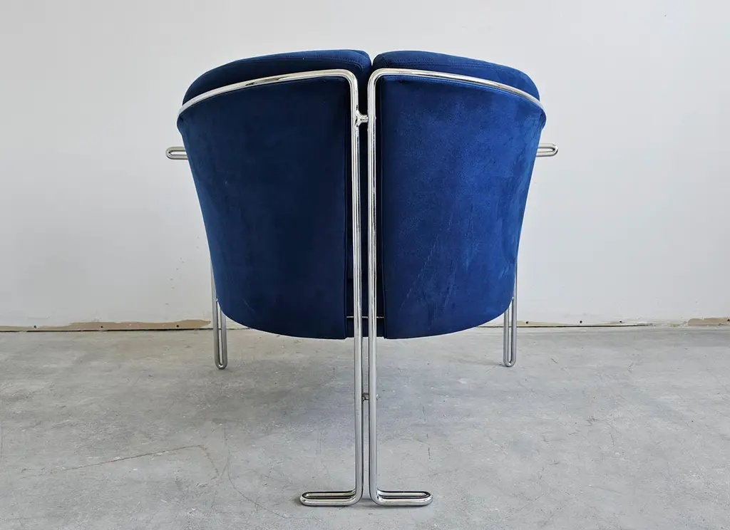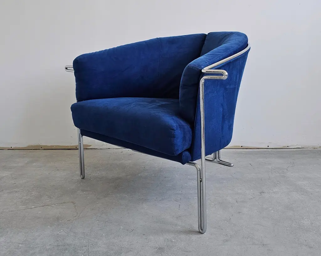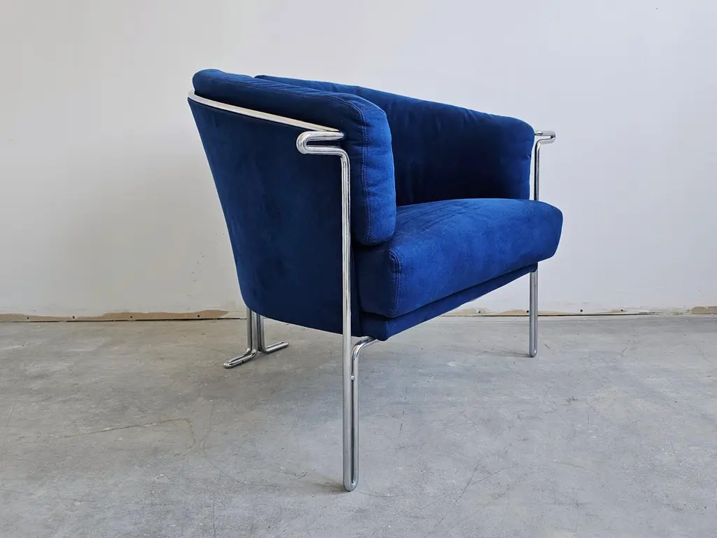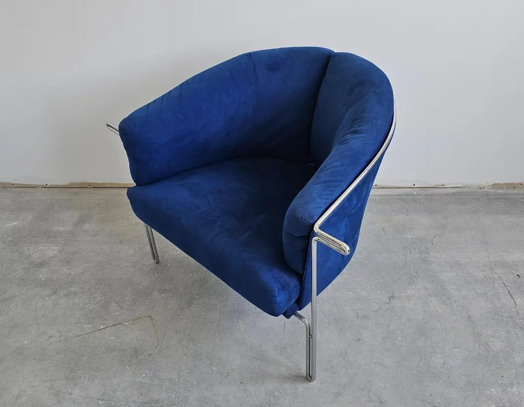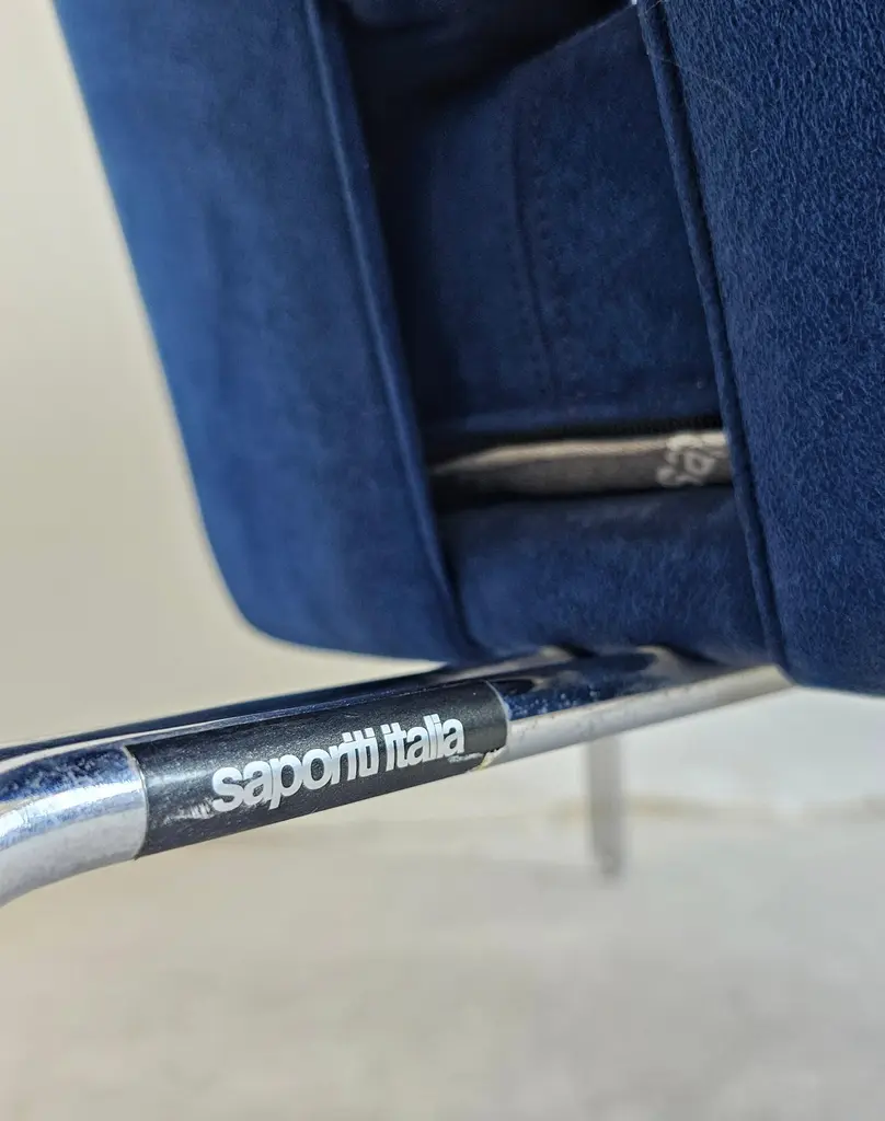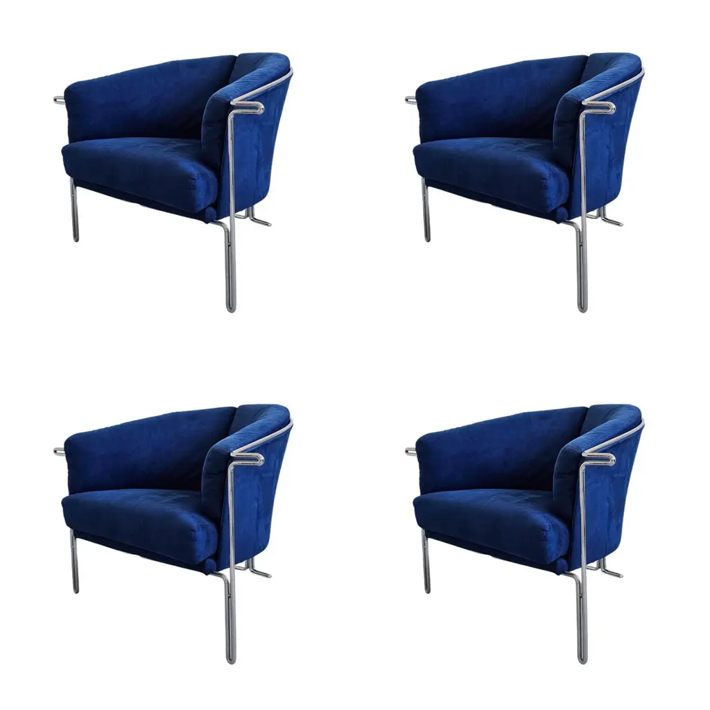 SOLD PER PIECE!In this listing you will find 4 exceptionally rare Mid Century Modern Side Chairs or Armchairs designed by architect John C. Portman for Saporiti in 1974. A single-piece, continuous, chromed steel frame holds the upholstered seat and back of this armchair. The refined work done to create the metallic frame adds a precious style to the pure lines of this chair.The chairs were designed as a part of the Entelechy Series, which feature characteristic shape of the armrest and legs done in chrome plated steel. Chairs are upholstered in blue velvet. Made in Italy in 1980s.Very good vintage condition with some signs of time and use. When purchased the chairs will be carefully wrapped up and packed in a way to avoid any damages in transport. As soon as shipped you will receive the tracking number for your package. If you have any additional questions regarding this piece please feel free to contact me. Happy shopping!