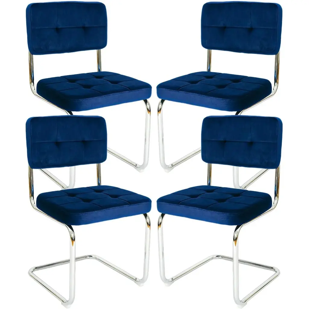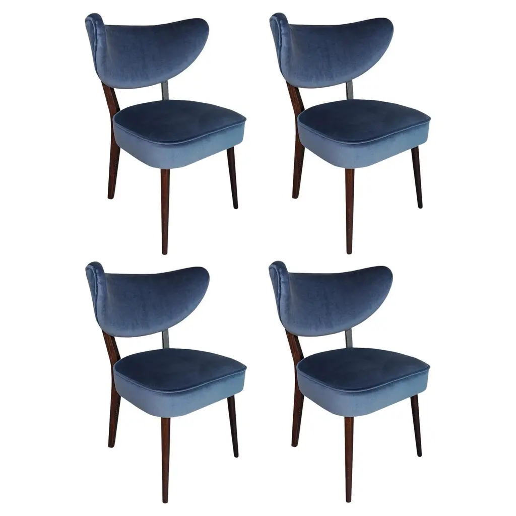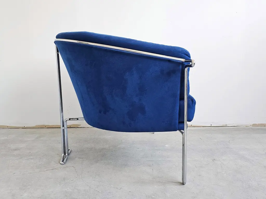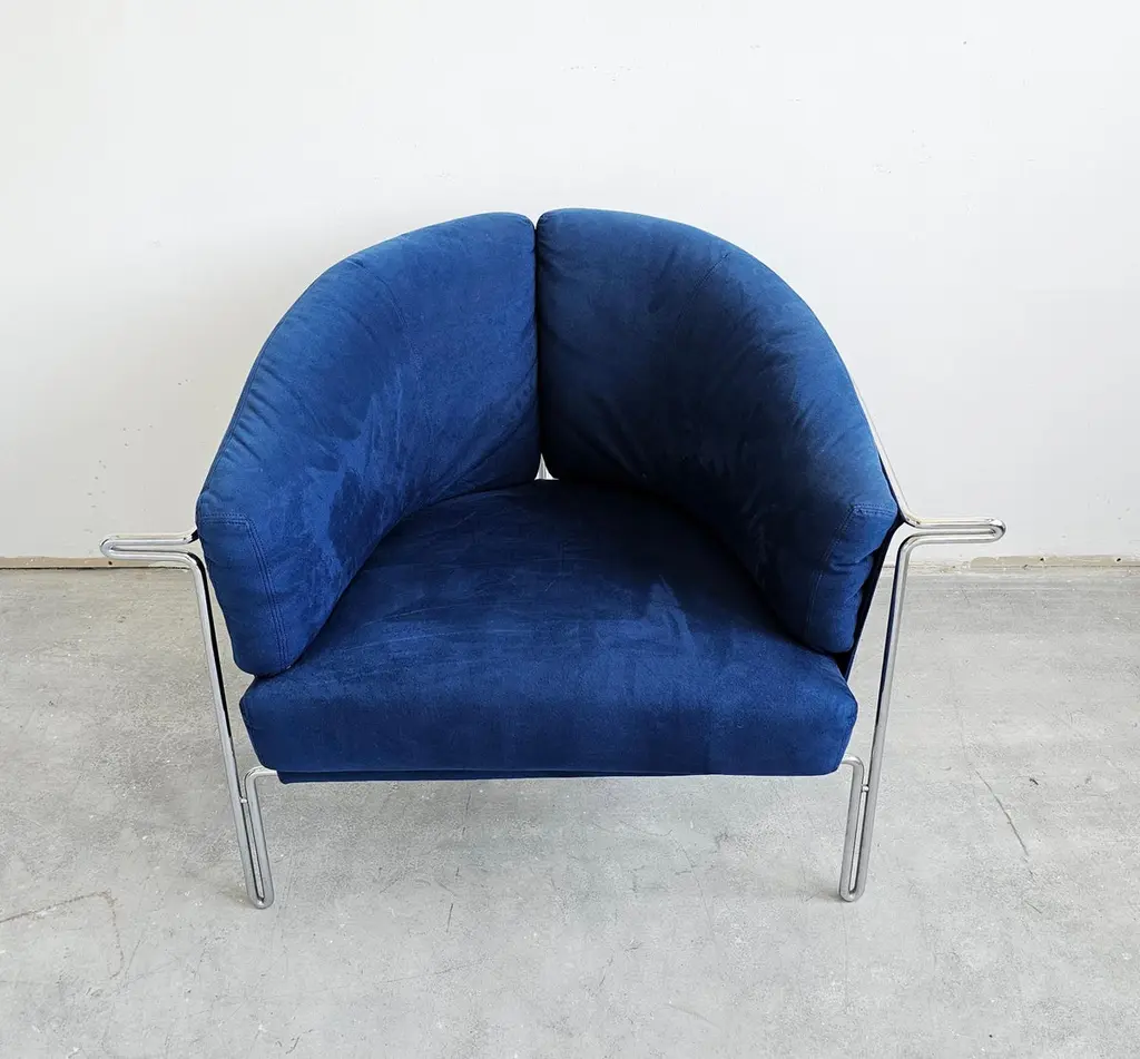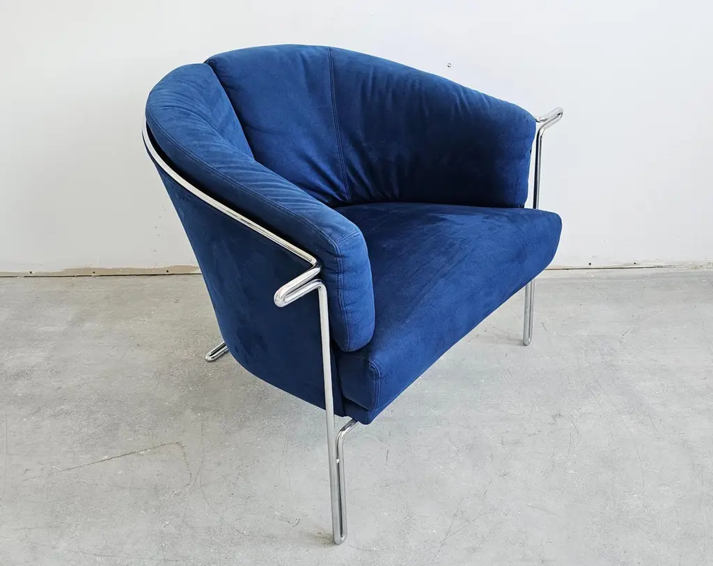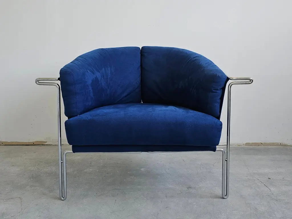 SOLD PER PIECE!In this listing you will find 4 exceptionally rare Mid Century Modern Side Chairs or Armchairs designed by architect John C. Portman for Saporiti in 1974. A single-piece, continuous, chromed steel frame holds the upholstered seat and back of this armchair. The refined work done to create the metallic frame adds a precious style to the pure lines of this chair.The chairs were designed as a part of the Entelechy Series, which feature characteristic shape of the armrest and legs done in chrome plated steel. Chairs are upholstered in blue velvet. Made in Italy in 1980s.Very good vintage condition with some signs of time and use. When purchased the chairs will be carefully wrapped up and packed in a way to avoid any damages in transport. As soon as shipped you will receive the tracking number for your package. If you have any additional questions regarding this piece please feel free to contact me. Happy shopping!