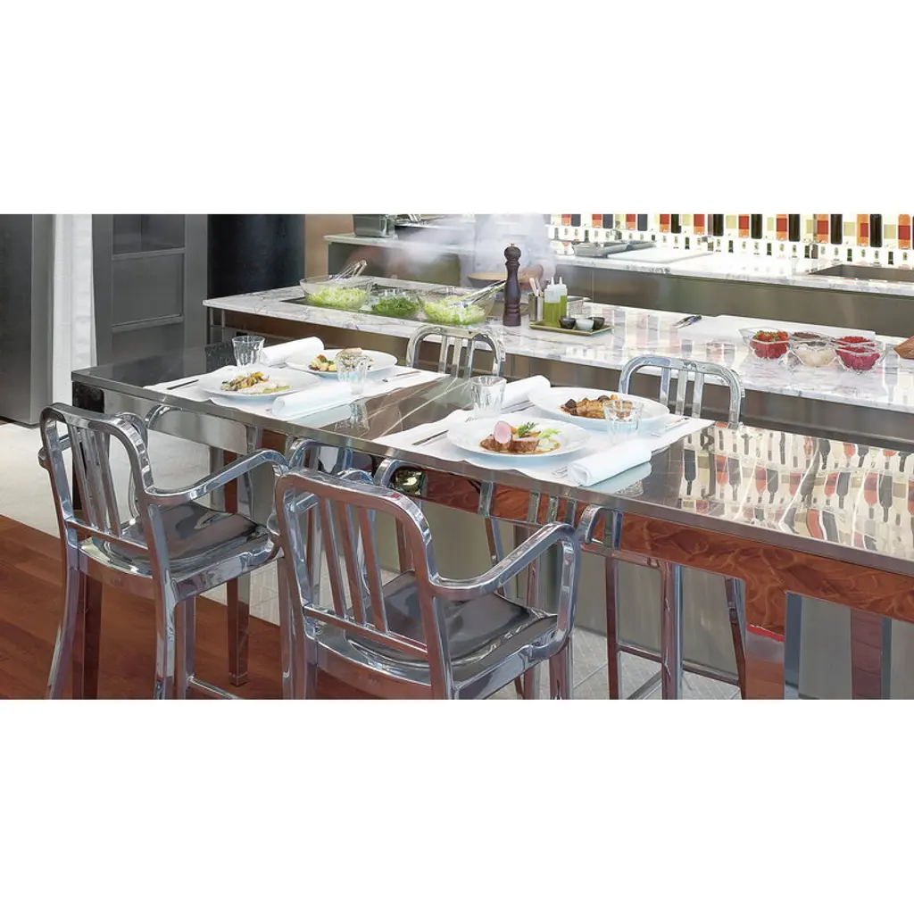 Emeco’s 1006 Navy chair is an extremely durable and functional choice for dining rooms as well as outdoor areas. The chair is handcrafted from recycled aluminum, and the manufacturing process has 77 different steps in total. The 1006 Navy chair has a lifetime warranty. Wilton C. Dinges, the founder of Emeco, designed the original Navy chairs in 1944 for the submarines of the United States Navy. Emeco was commissioned by the U.S. government to produce chairs that would withstand the ruthless sea conditions. Thanks to their modern and minimalist look, the Navy chairs are an excellent choice also for contemporary interiors and a wide range of styles. All Emeco products are manufactured in the USA, using mostly recycled materials.