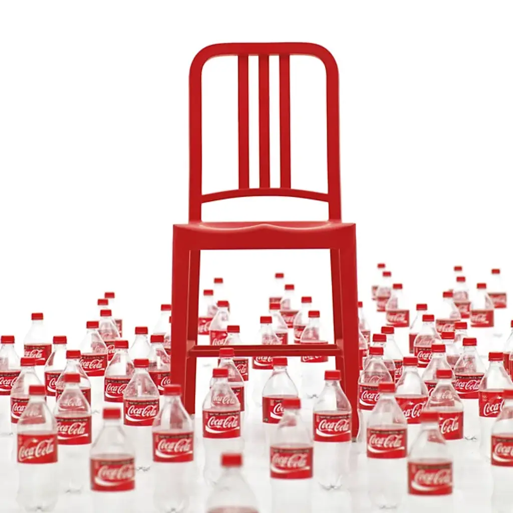 The 111 Navy® Chair carries the iconic silhouette of the original Navy® Chair built by Emeco, circa 1944, for use in submarines. Driven by awareness of today's environmental problems, Emeco and Coca Cola partnered together to form a chair made of up-cycled consumer waste. The 111 Navy® Chair is made of 111 recycled PET bottles, finished with a selection of versatile colors to complement modern-contemporary spaces.