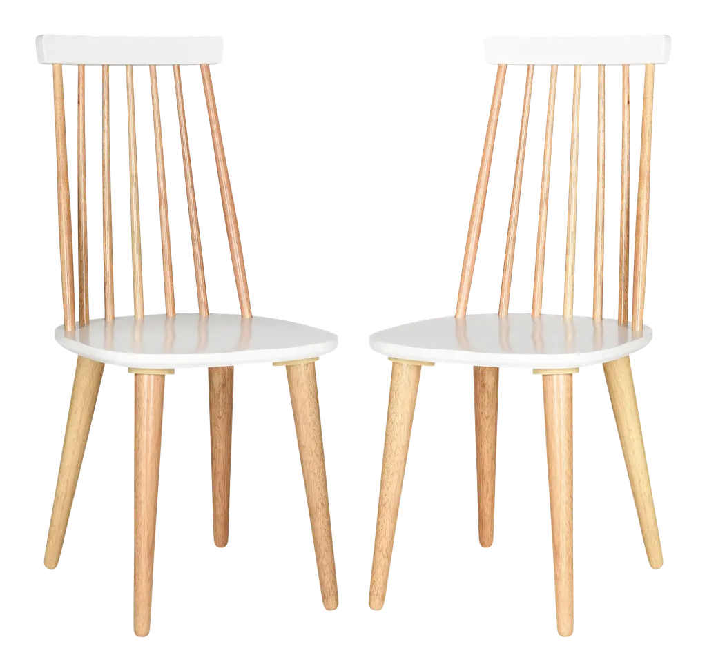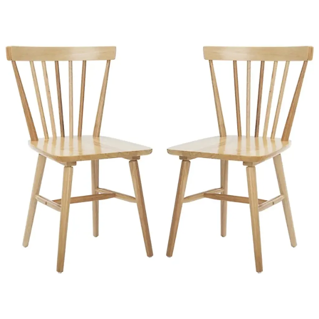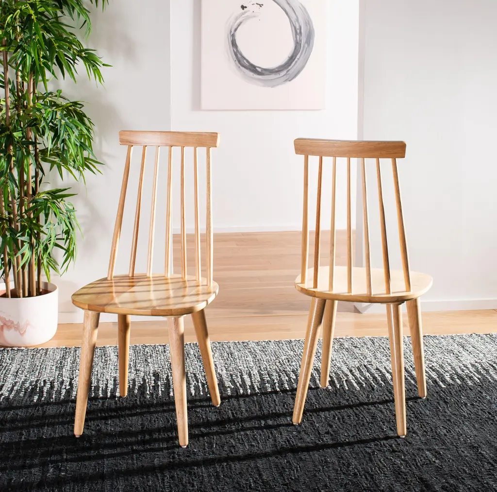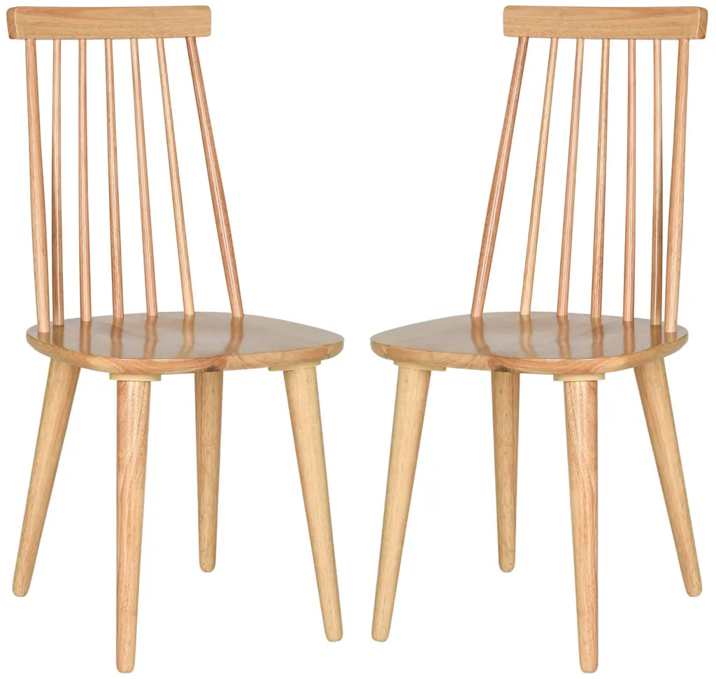 A perennial favorite, the classic Windsor dining chair gets a bit of transitional flair with the tapered back silhouette and natural finish of this sleek design.Crafted of sustainable rubber wood, this set of two brings comfort and style to the table. Wood is a natural material with variations of color shade, configuration, streaks, and grain structure. Each individual piece of furniture has characteristic markings that will differ from photo and showroom samples. Regular attention and maintenance of fine furniture can ensure it's beauty for years to come. Always use felt pads under all articles to prevent discoloration or softening of the lacquer. Plastic and rubber bases on items can discolor wood. Some assembly required.