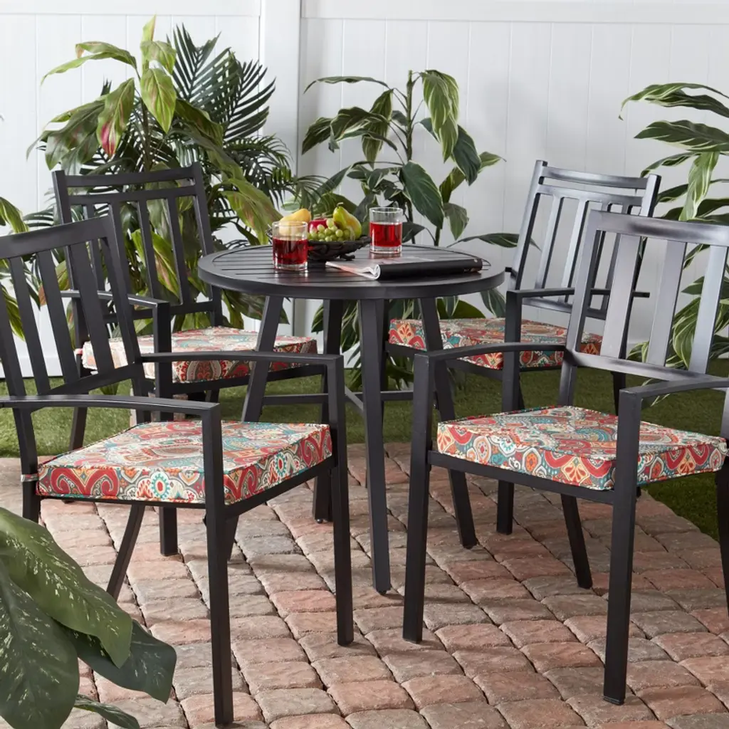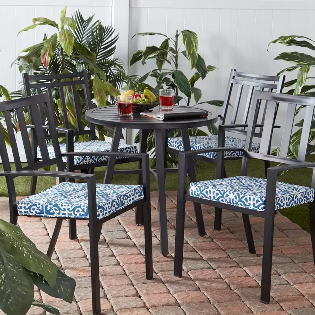 Add both comfort and style to your outdoor dining experience with this set of 4 square chair pads from Kensington Garden. A dense fiberfill insert gives this cushion a smooth finish, and eliminates any shifting for a more consistent comfort. Our durable outdoor polyester fabric resists fading, repels water, stains and spills, and is available in a wide variety of colors and patterns. Use with other KG cushions and pillows for a coordinated look. To prolong the life of our cushions and keep them looking beautiful, we recommend storing them indoors or covered when not in use.