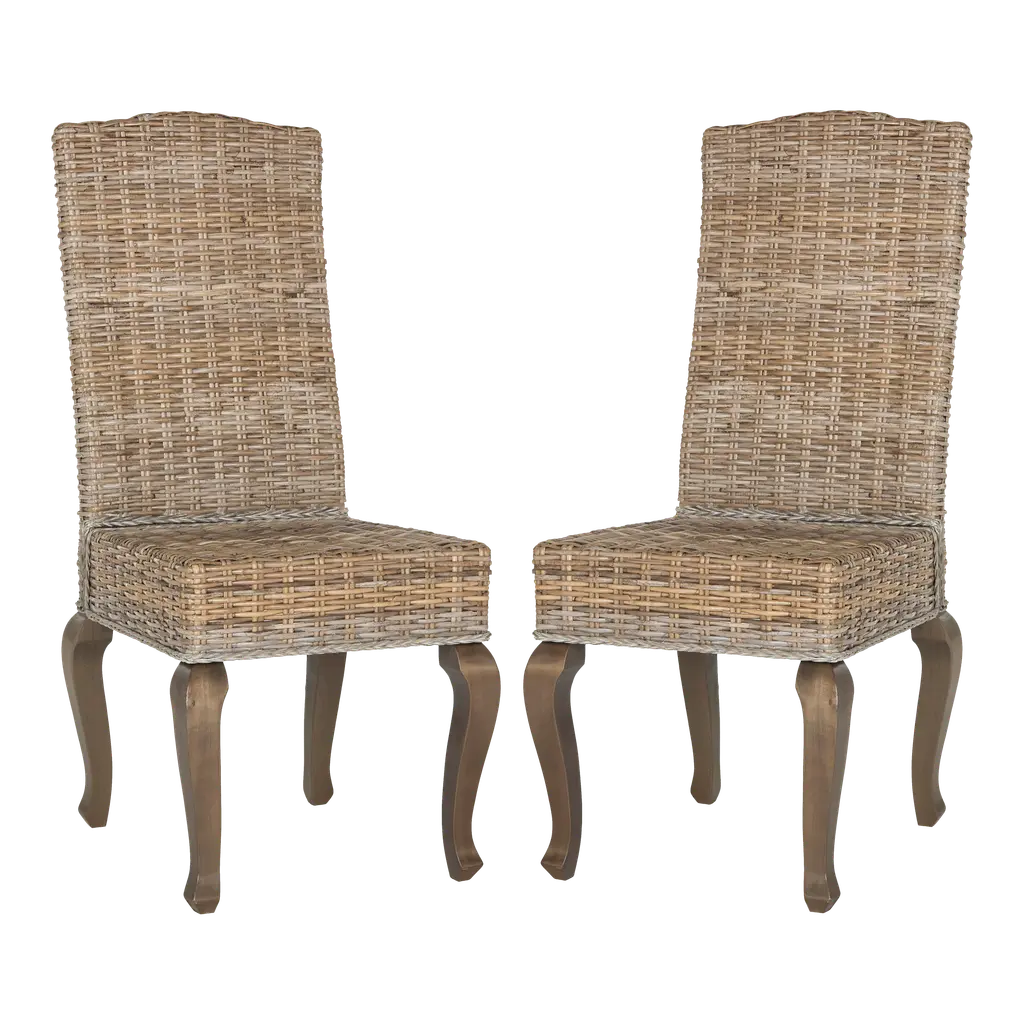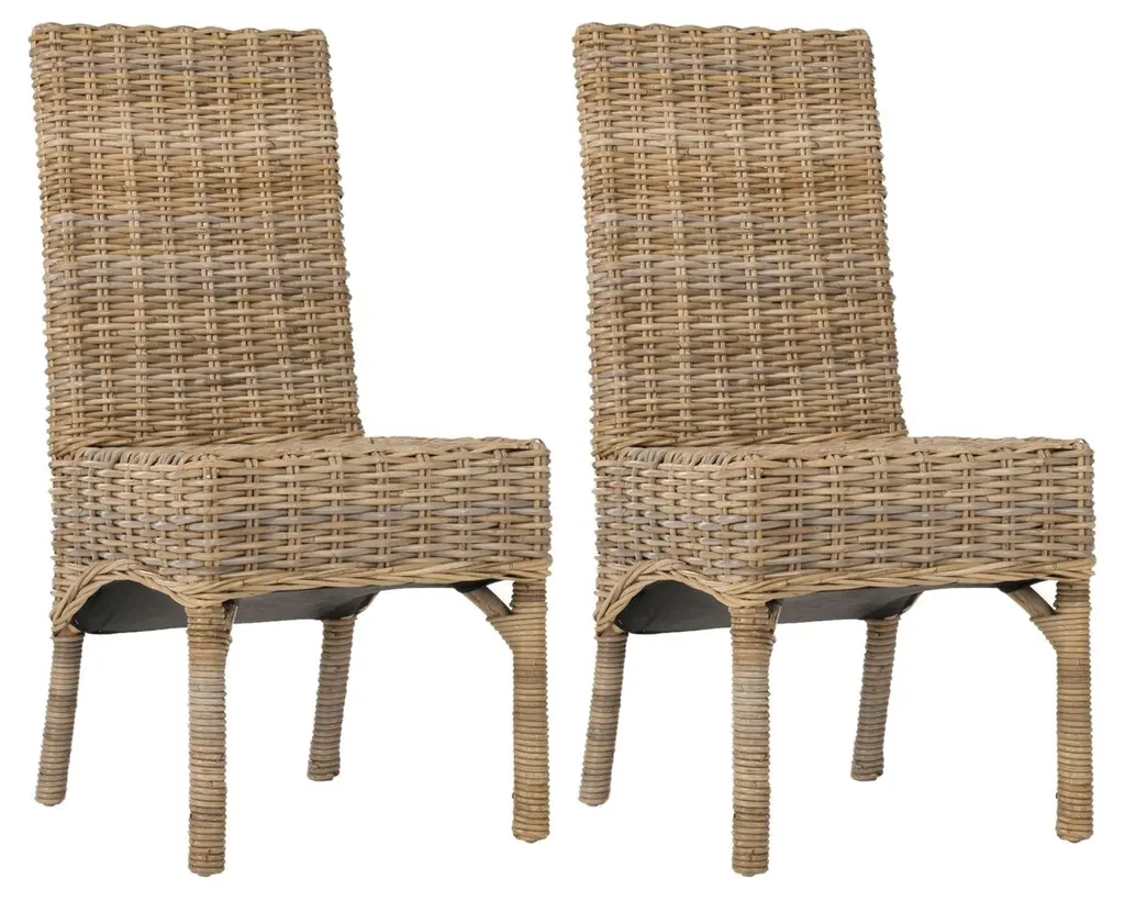 Classically French in silhouette, but with new tropical island flair, this set of two Kubu rattan dining chairs will adapt to casual urban and coastal interiors. Finished in whitewash, the natural shading of woven rattan imbues each chair with unique charm. Dust regularly with a soft, dry cloth. Never use oiled or treated cloths on lacquered finishes. Some finishes can be wiped with a damp (not wet) cloth, followed at once by rubbing with a dry cloth to remove fingerprints and smudges. For persistent spots, gently clean with a soft cloth and a solution of water and mild soap, make sure to wipe dry. Use adhesive felt pads, coasters and placemats to protect your furniture. Some assembly required.