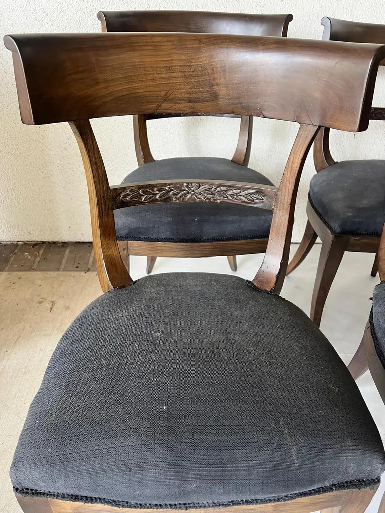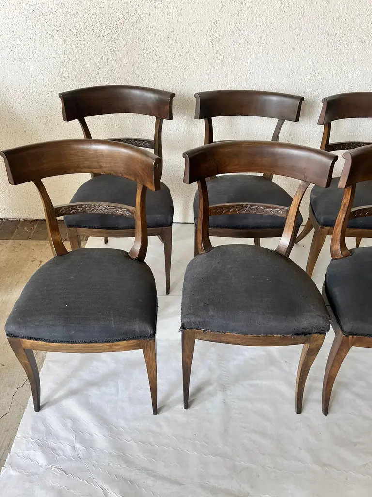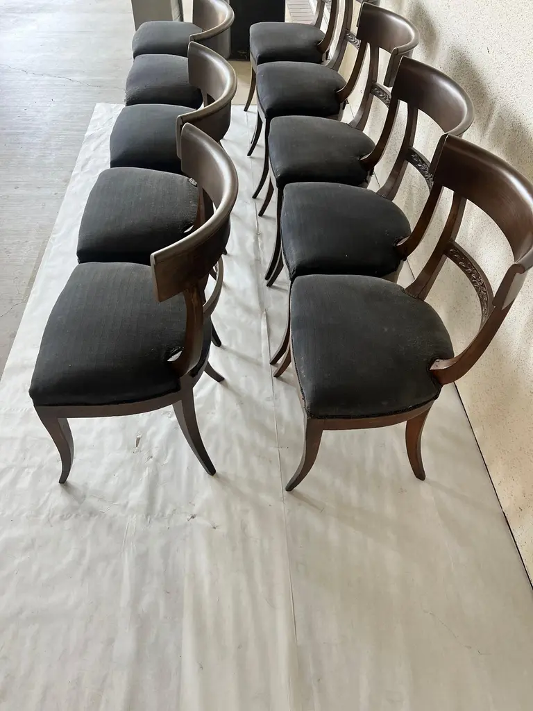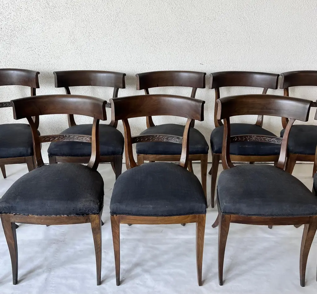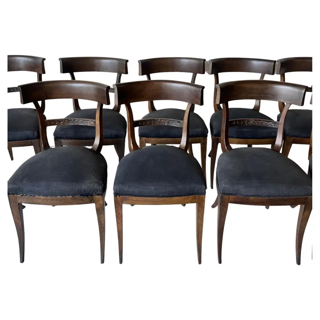 18th C Italian Klismos Chairs set of 10. Concave backrest with curved legs (Klismos). The Klismos style is timeless and classic and never goes out of style. The upholstery on the chairs is very distressed. Purchased In Lucca Italy from 1750's.