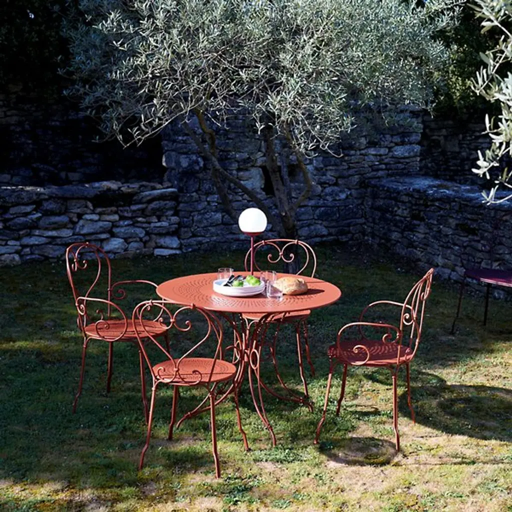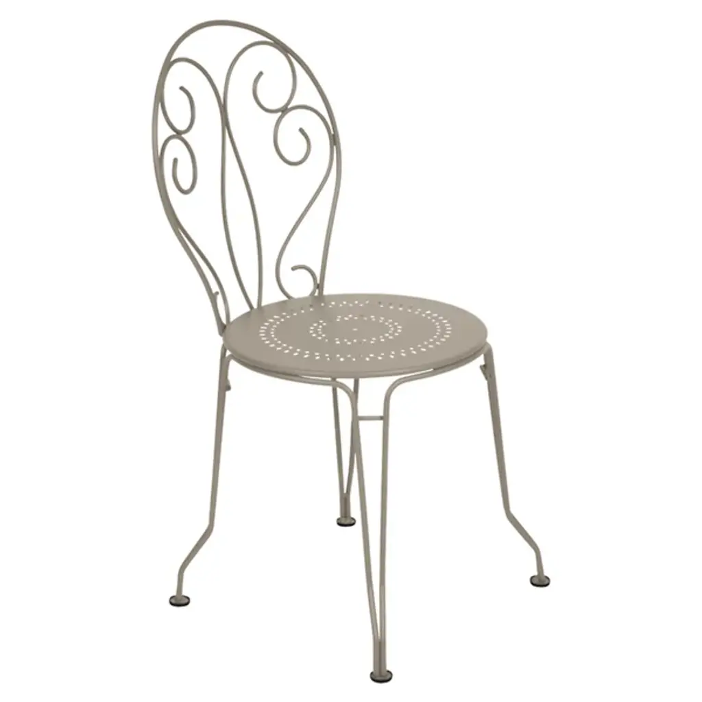 A side chair you're destined to love. Each of the Fermob 1900 Chair, Set of 2 is an elegant, classically-styled steel chair with a curvy heart motif for the back and a perforated round of sheet steel for the seat. The result at once delicate-looking, lightweight and exceptionally strong. When not in use, the chair is stackable up to 10 high.