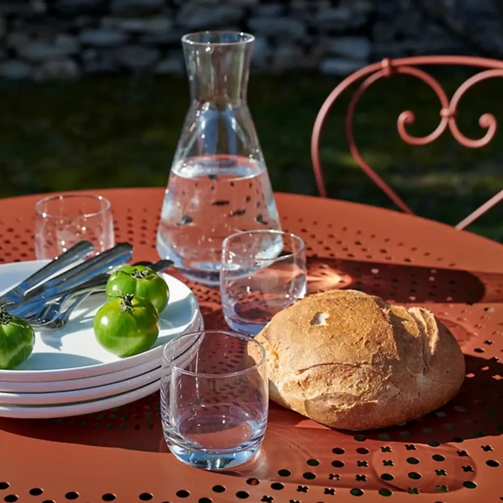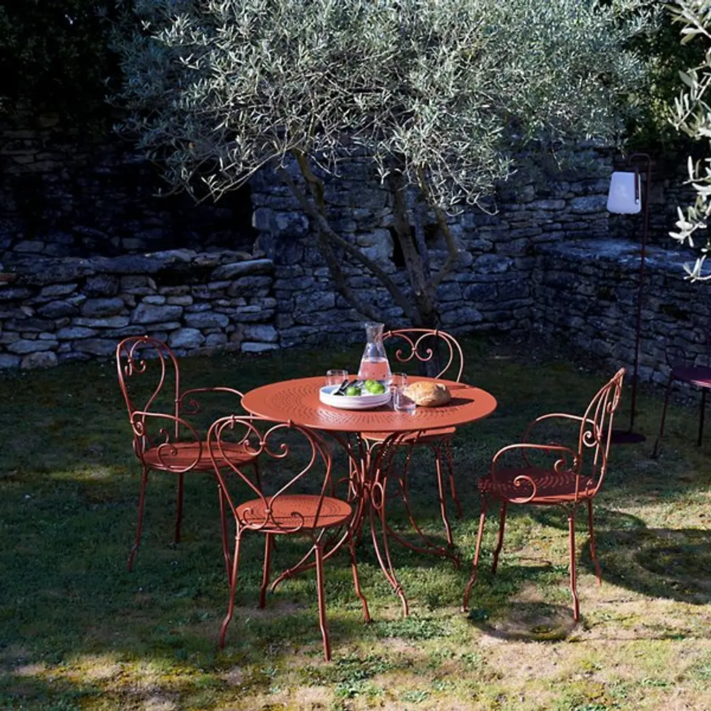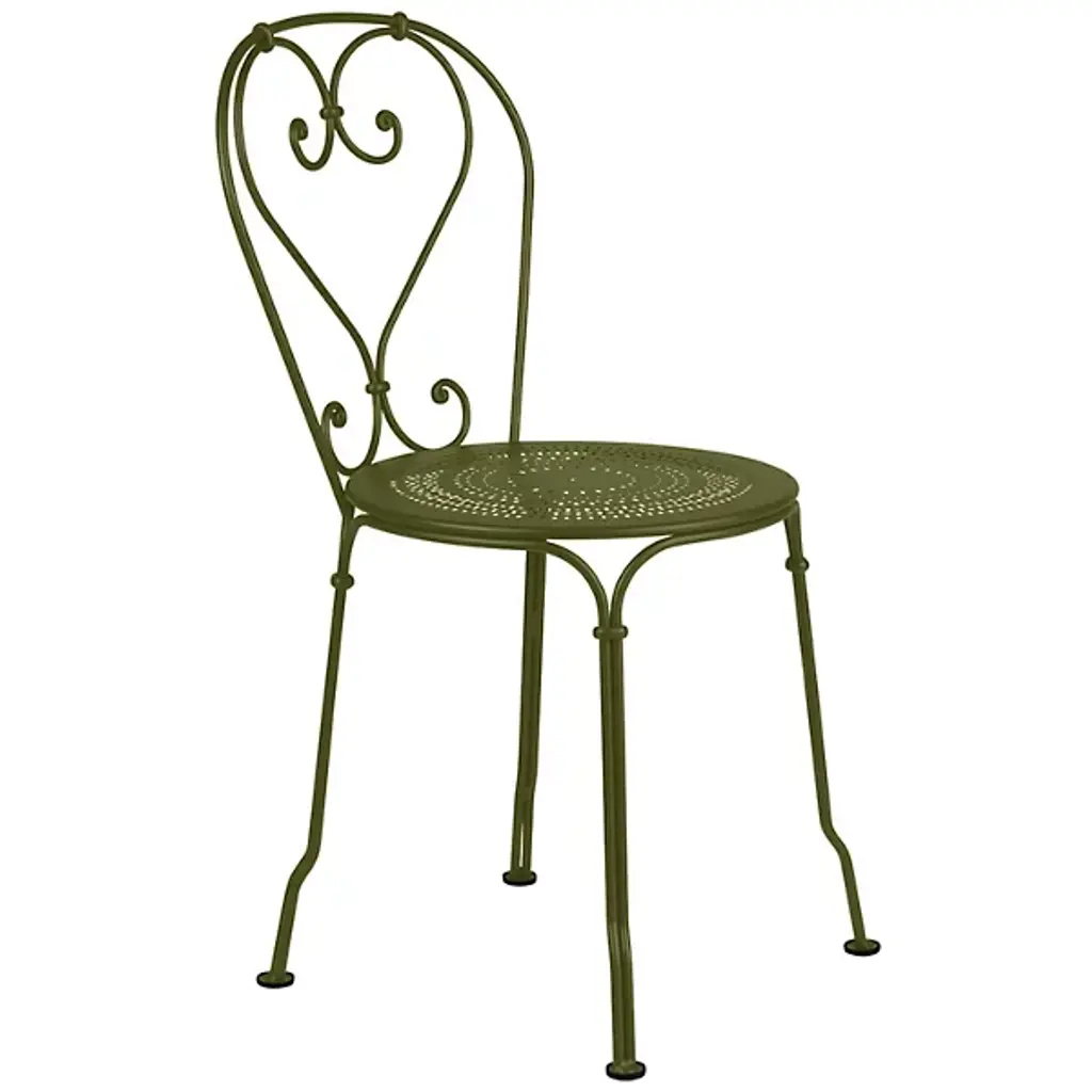 A side chair you're destined to love. Each of the Fermob 1900 Chair, Set of 2 is an elegant, classically-styled steel chair with a curvy heart motif for the back and a perforated round of sheet steel for the seat. The result at once delicate-looking, lightweight and exceptionally strong. When not in use, the chair is stackable up to 10 high.