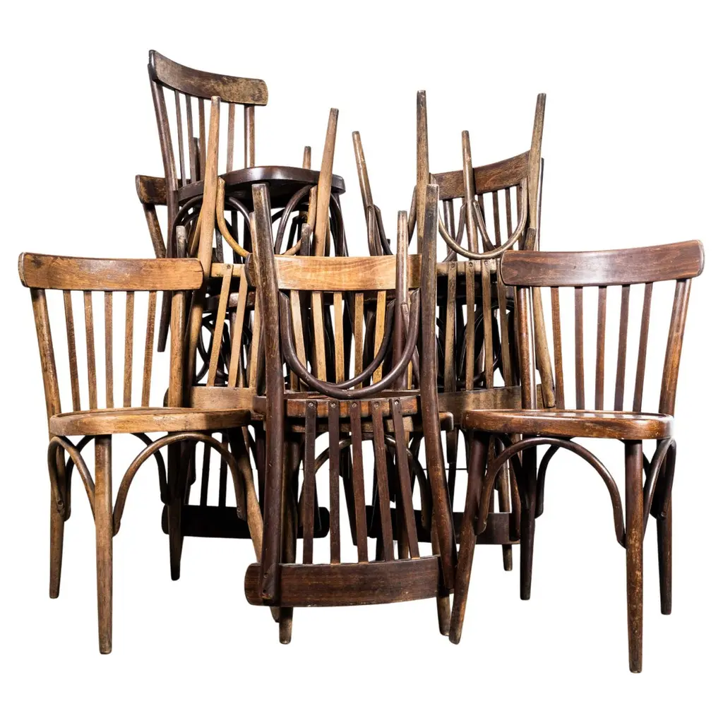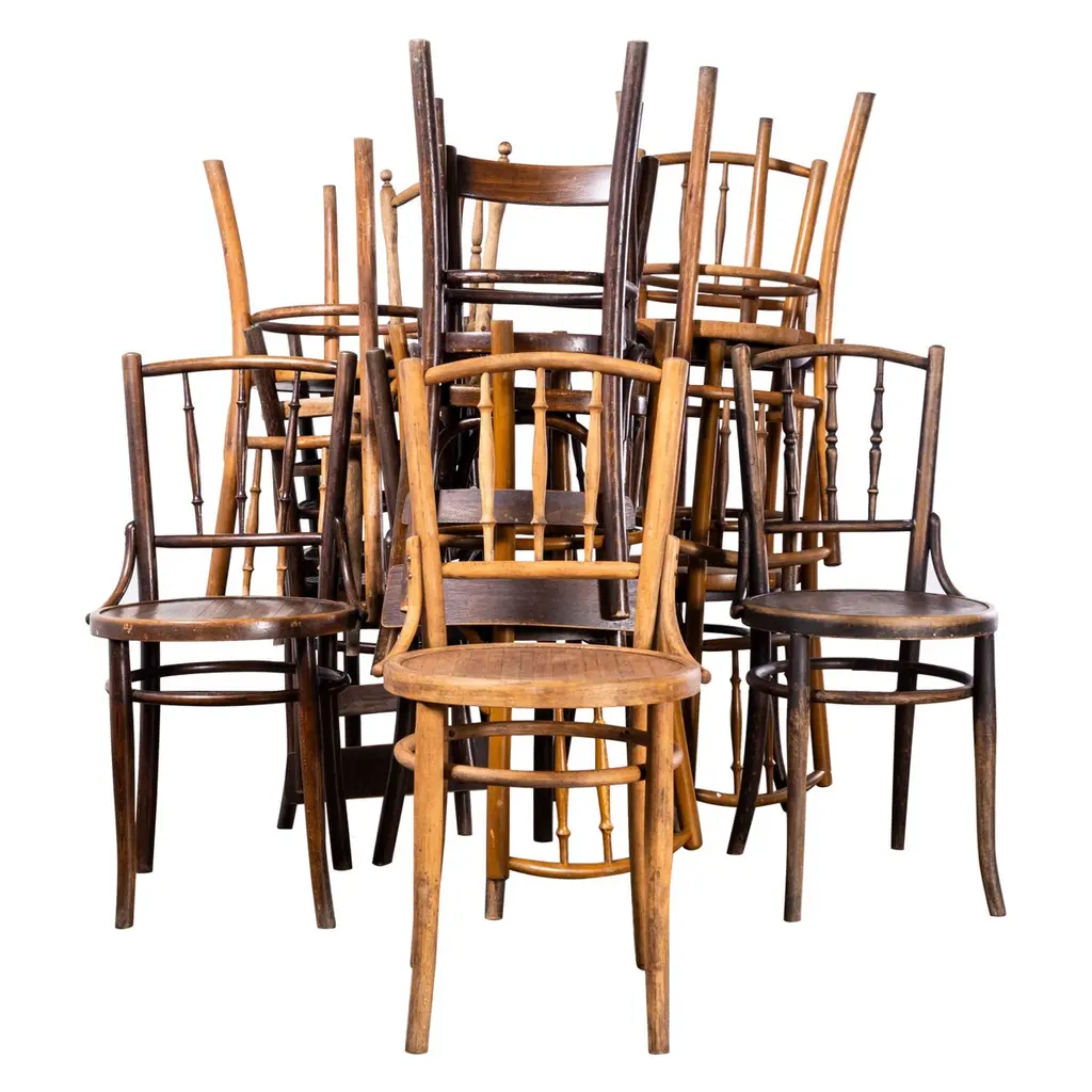 1920's Warm Honey Classic Bentwood Dining Chair - Various Quantities Available. Good quality batch of classic bentwood chairs with a classic shape and very rich warm brown colour. At the beginning of the 20th Century there were two (amongst others) competing bentwood producers, J&J Kohn and Mundus. Both produced chairs in various factories throughout the Austro Hungarian empire. Undoubtedly due to a combination of commercial pressure from the market leading producer Thonet and the political upheaval of the time, the firms merged in 1914. These chairs are from this 'joint' producer before it merged with Thonet in 1922, so very early chairs. Beautiful surviving and fascinating chairs. All our chairs pass through our own workshop where they are gently serviced, cleaned and waxed. Seat height 46cm.Workshop Report:Our workshop team inspect every product and carry out any needed repairs to ensure that everything leaves us serviced and maintained ready for many more years of life. All of our vintage products show the rich beauty and history of their life with the knocks and bumps of many years of use and we try to minimise restoration to keep every piece as original as possible.Date:1920'sMaker:Industrial Production – Eastern EuropeDimensions:50cm(w) x 46cm(l) x 78cm(h)