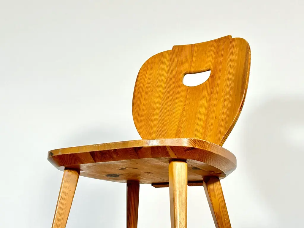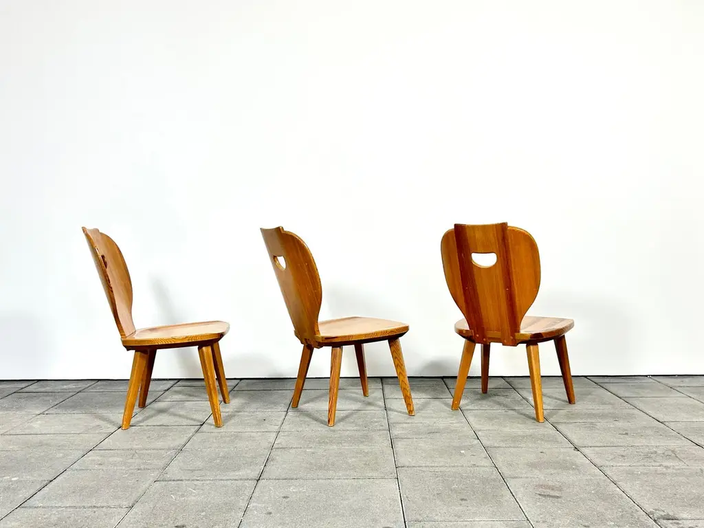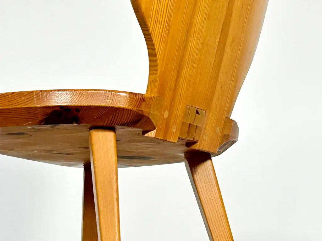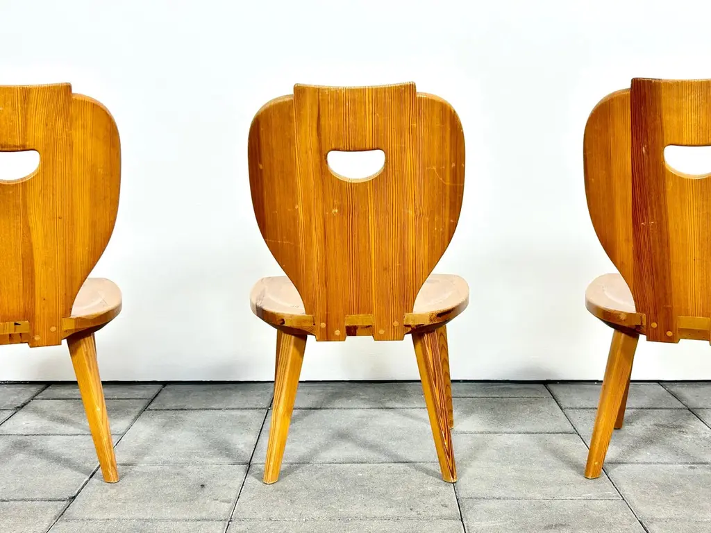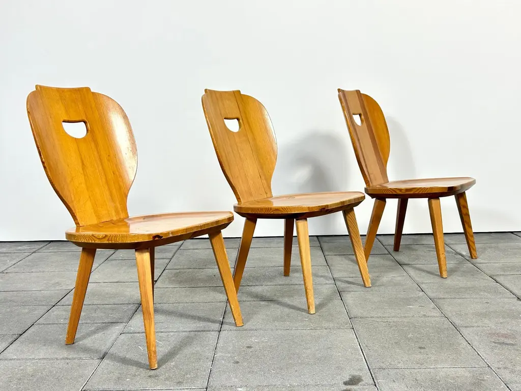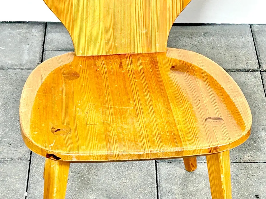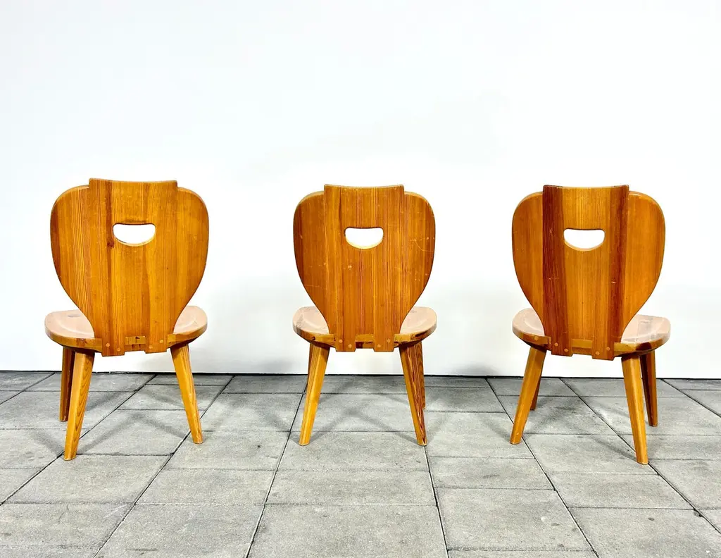 1950ies Sörgården dining chairs, designed by Carl Malmsten for Svensk Fur in solid pine wood The Sörgården chair was designed by Malmsten and manufactured by Svensk Fur in the 1950ies.Price per chair, up to three chairs available. Made from solid pine the chair has a rustic and wonderful esthetic appearance and will perfectly suit a brutalist or rustic interior. It offers a good seat comfort and it’s well-shaped seat and backrest clearly make it an impressive piece that would well accompany a seat corner or could be grouped in the best of a stove.Visually appealing is the wood connections that remain visible on top of the seat. The backrest has a small gap suitable to rails handle the chairs and to spontaneously place it wherever you need it.Chairs are in good vintage condition appropriate to their age. They do show patina and several sympathetic signs of wear that we refused to restore as it suits them very well. The seat height with 34 cm is rather low which makes them unique as well, but they will not fit the height of a regular dining table.Size per chair: W 45 cm x D 52 cm x H 74,5 cm, Seat Height: 34,5 cm.
