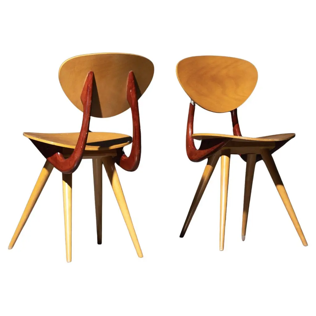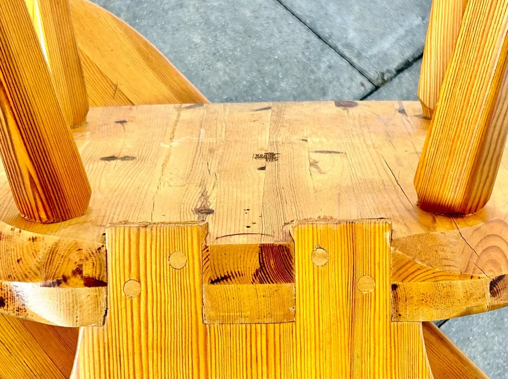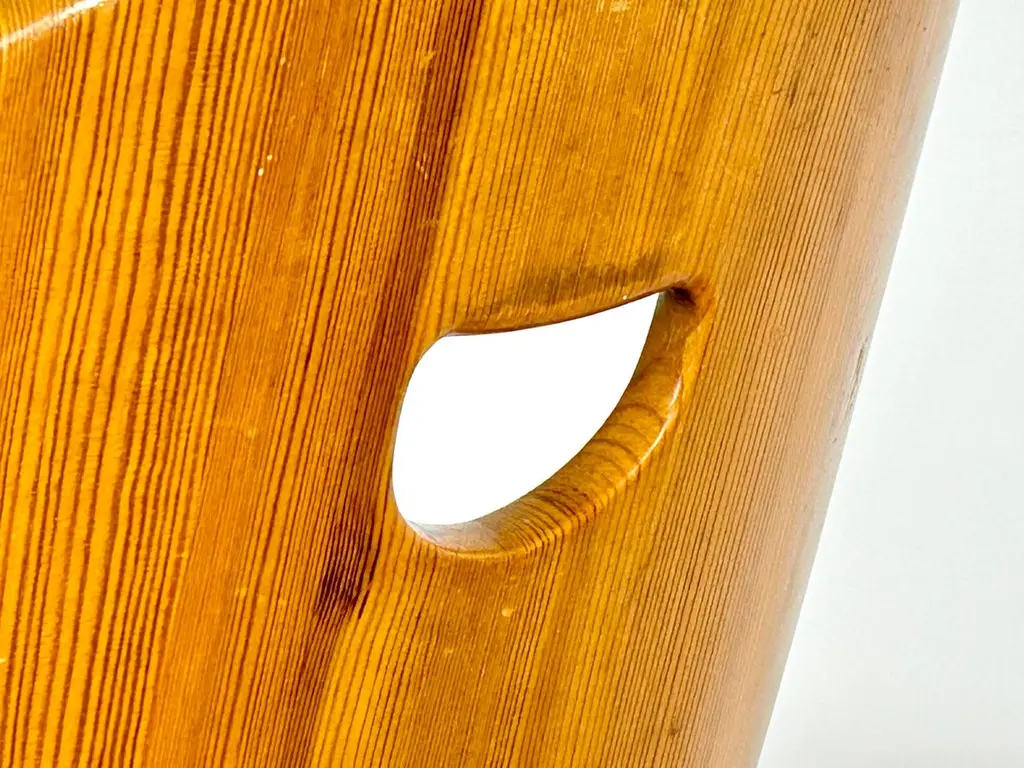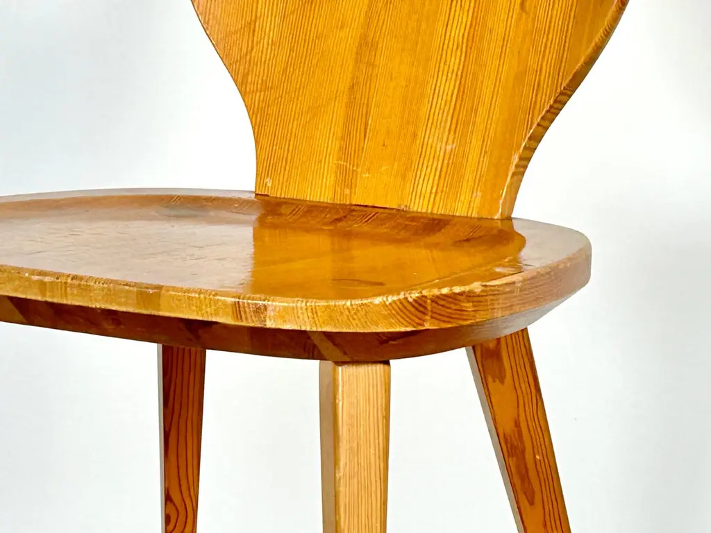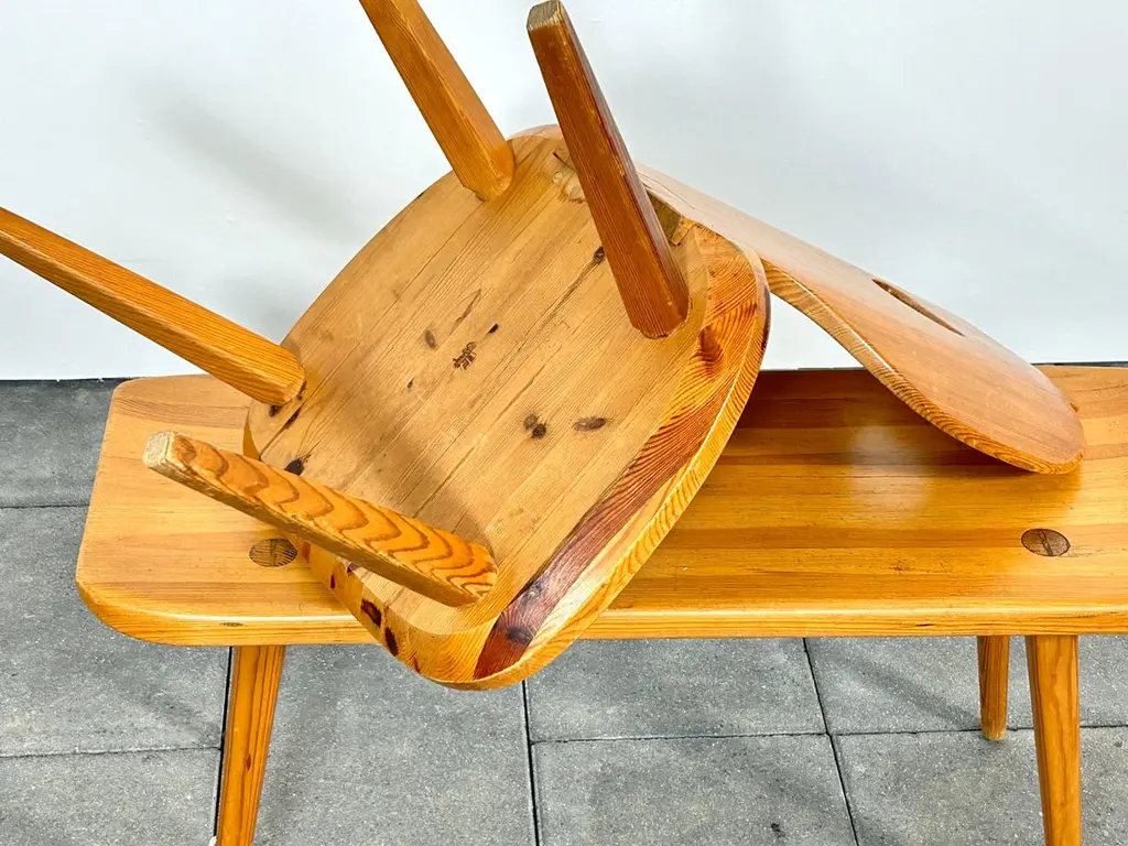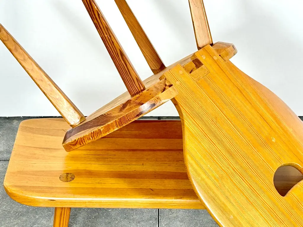 1950ies Sörgården dining chairs, designed by Carl Malmsten for Svensk Fur in solid pine wood The Sörgården chair was designed by Malmsten and manufactured by Svensk Fur in the 1950ies.Price per chair, up to three chairs available. Made from solid pine the chair has a rustic and wonderful esthetic appearance and will perfectly suit a brutalist or rustic interior. It offers a good seat comfort and it’s well-shaped seat and backrest clearly make it an impressive piece that would well accompany a seat corner or could be grouped in the best of a stove.Visually appealing is the wood connections that remain visible on top of the seat. The backrest has a small gap suitable to rails handle the chairs and to spontaneously place it wherever you need it.Chairs are in good vintage condition appropriate to their age. They do show patina and several sympathetic signs of wear that we refused to restore as it suits them very well. The seat height with 34 cm is rather low which makes them unique as well, but they will not fit the height of a regular dining table.Size per chair: W 45 cm x D 52 cm x H 74,5 cm, Seat Height: 34,5 cm.