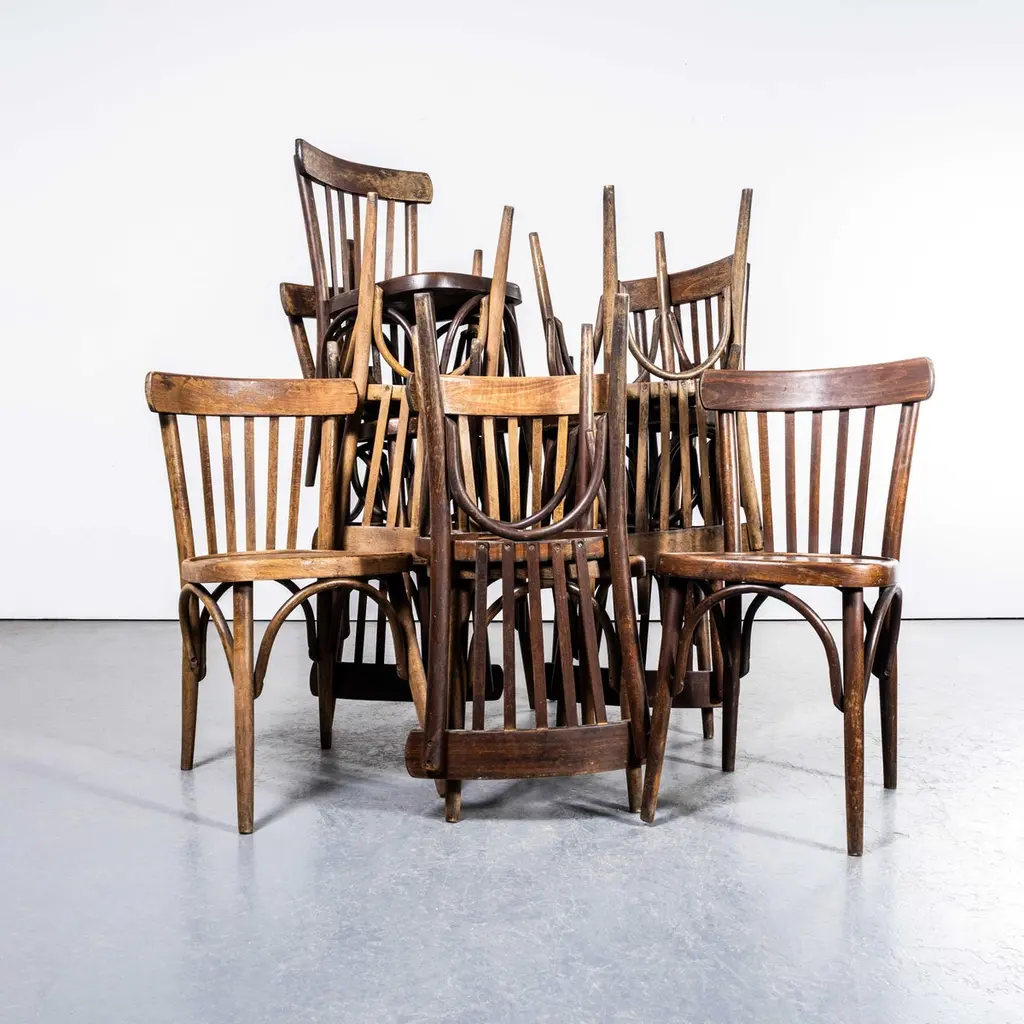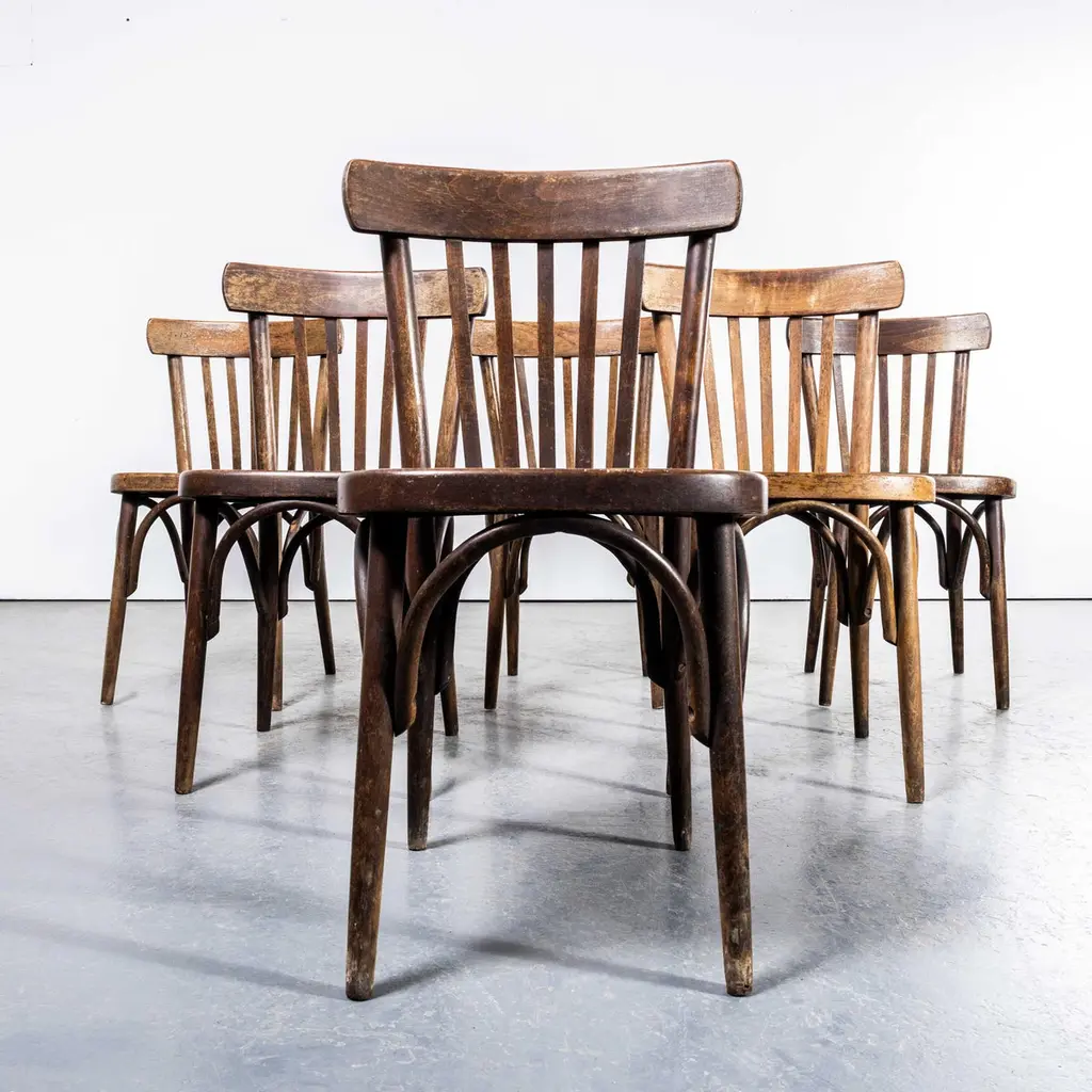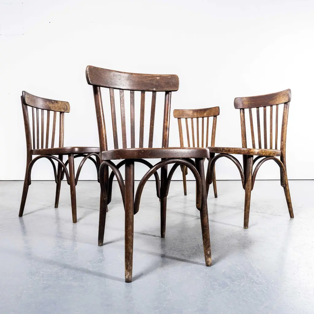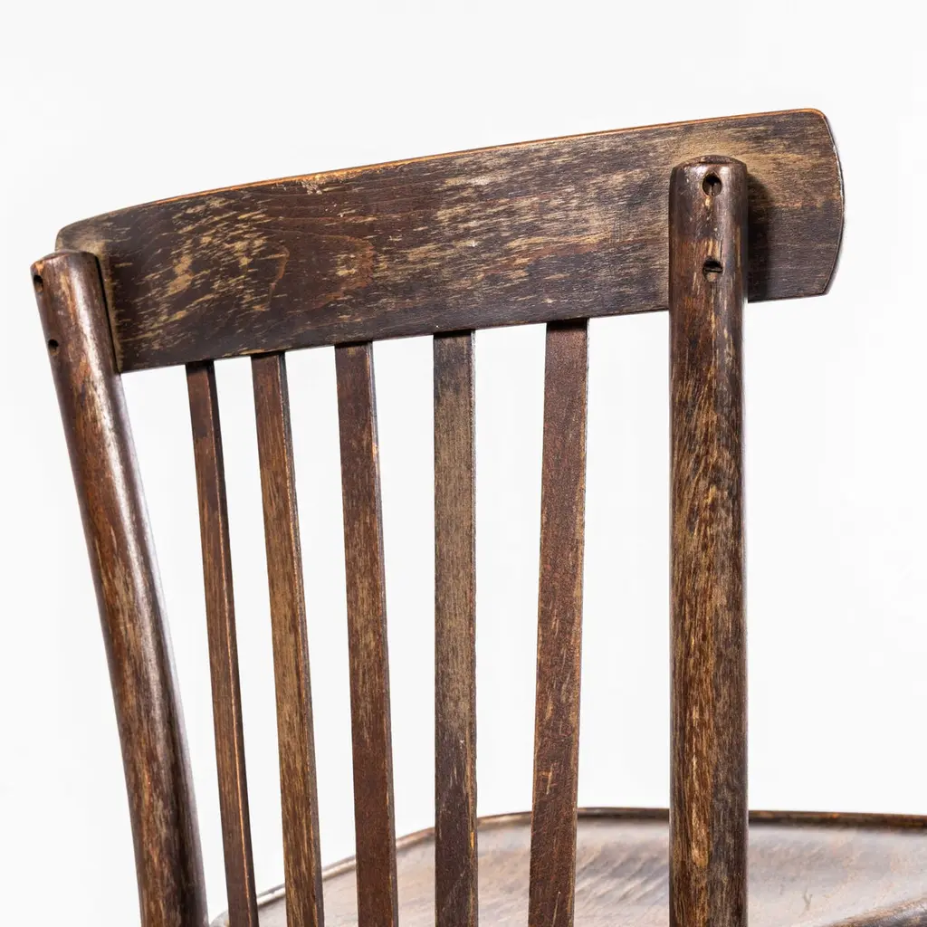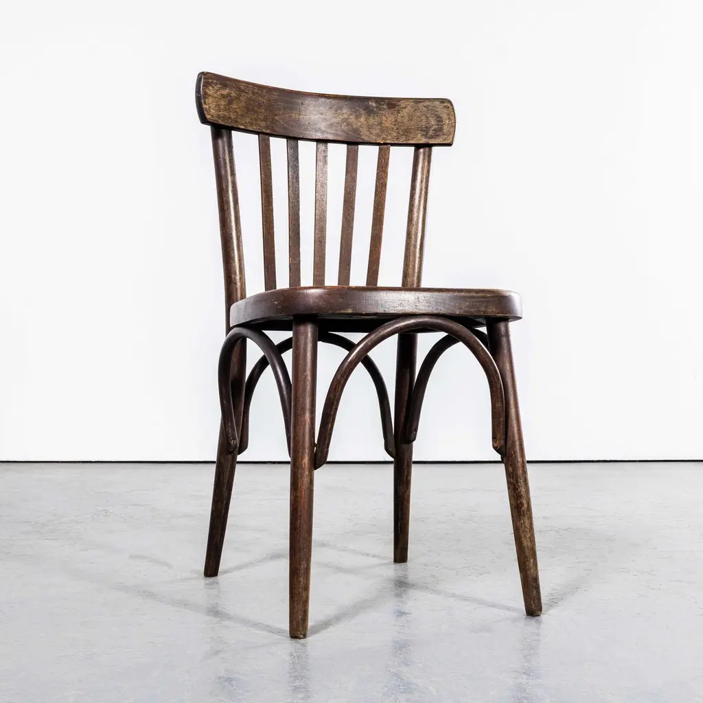 1950’s Dark Oak Bistro Bentwood Dining Chairs. Good quality classic bentwood chairs with a deep dark oak colour and classic slatted back bistro design. The chairs were made in Eastern Europe using solid steam bent beech, they are a good weight robust chair with a good wear and age. Our workshop services each chair, checking joints, cleaning and waxing them. Seat Height: 45cm.We hold large stocks of original vintage chairs for private and commercial use. The price listed is for one chair and you can order any quantity subject to the maximum available.Workshop Report:Our workshop team inspect every product and carry out any needed repairs to ensure that everything leaves us serviced and maintained ready for many more years of life. All of our vintage products show the rich beauty and history of their life with the knocks and bumps of many years of use and we try to minimise restoration to keep every piece as original as possible.Date:1950'sMaker:Industrial Production – Eastern EuropeDimensions:43cm(w) x 46cm(l) x 78cm(h)