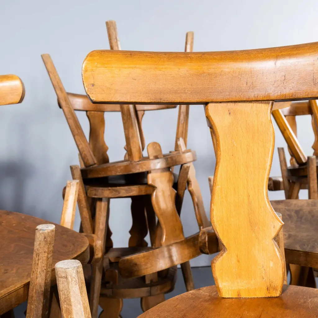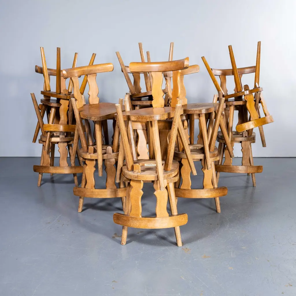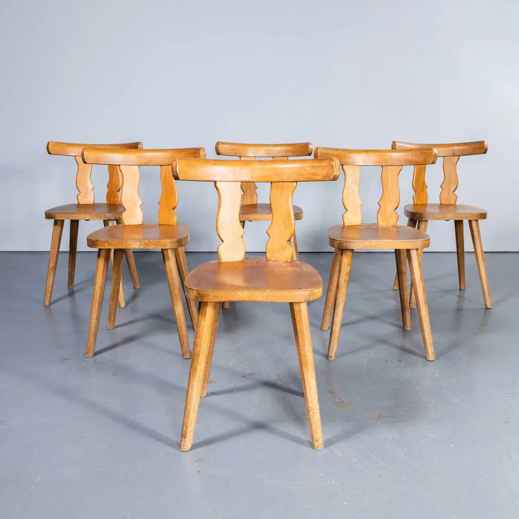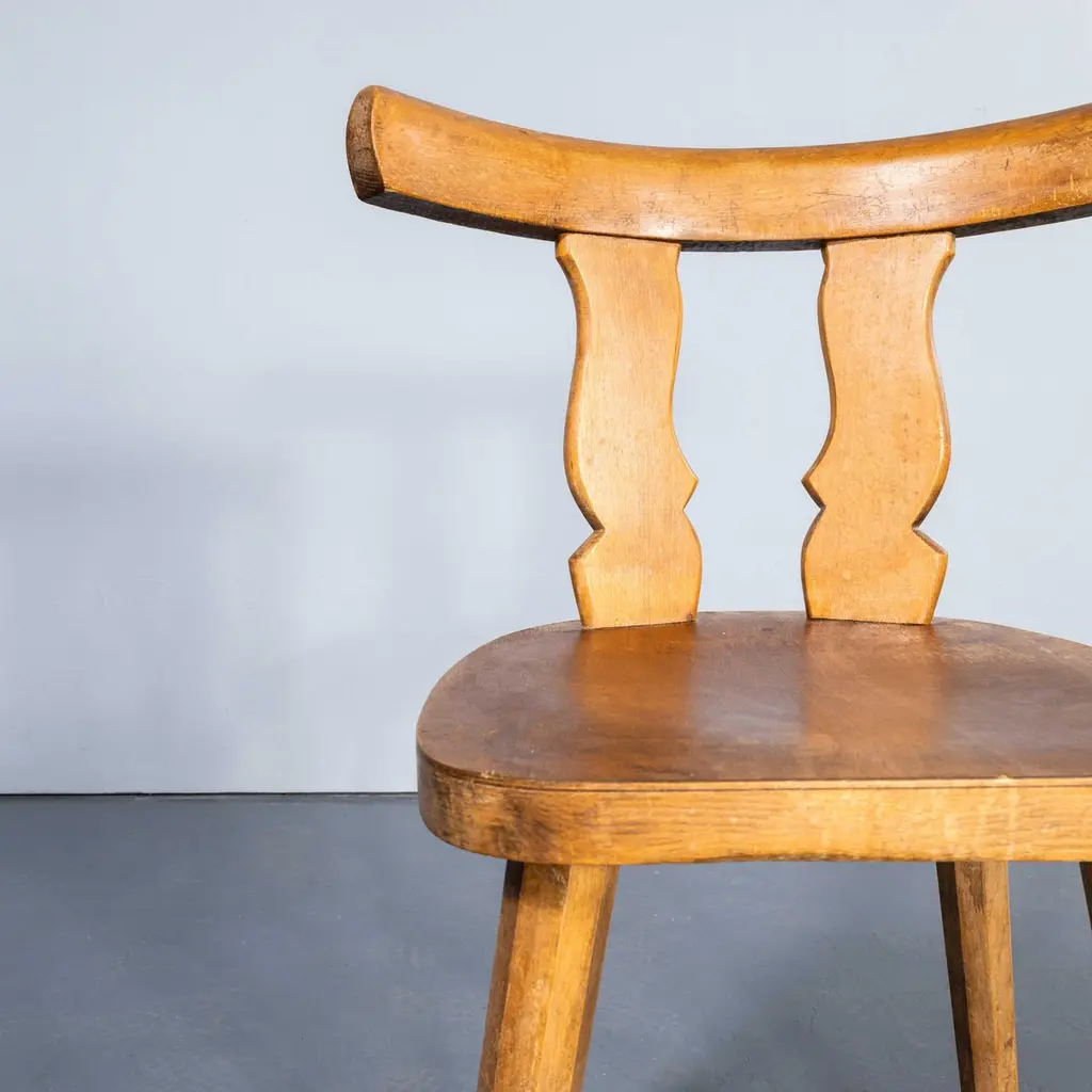 1950's Fischel French Ox Back Dining Chairs - Good Quantity Available. Fischel was founded in 1871 by Czech born David Gabriel Fischel, a successful vegetable oil merchant, using the first hand knowledge of his eldest son who had worked in one of Thonets Czech factories. First production was made in Germany in Niemes near the Danube. Later production moved to France in Alsace and sales offices were opened in most major French cities as Fischel became a major chair producer. These chairs date from the 1950's, an unusual shape for Fischel using mainly solid and not their traditional bentwood. Over scale Ox backs, chunky seats with a rich colour and character. We service and wax each chair before it leaves our workshop and we deliver chairs of excellent quality. Seat Height 47cm.Workshop Report:Our workshop team inspect every product and carry out any needed repairs to ensure that everything leaves us serviced and maintained ready for many more years of life. All of our vintage products show the rich beauty and history of their life with the knocks and bumps of many years of use and we try to minimise restoration to keep every piece as original as possible.Date:1950'sMaker:Fischel - FranceDimensions:51cm(w) x 43cm(l) x 80cm(h)