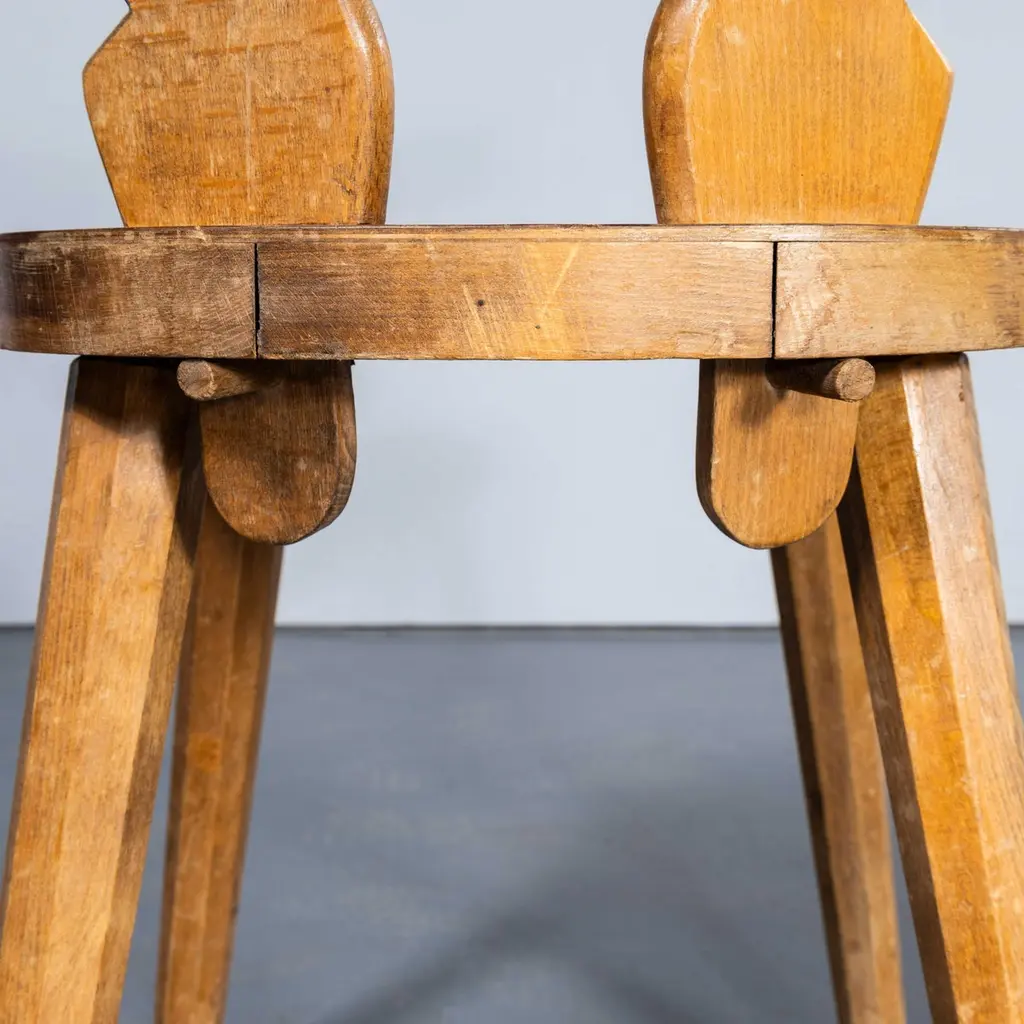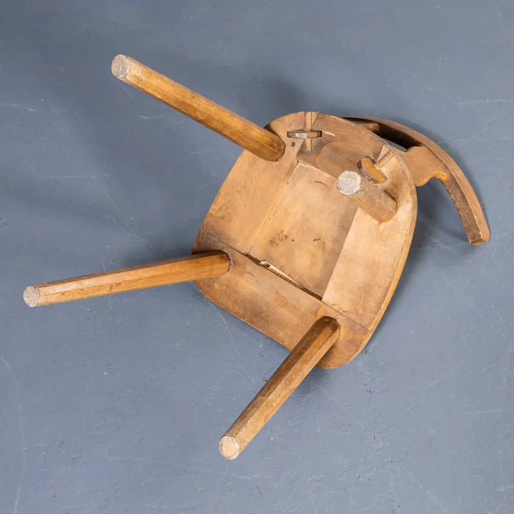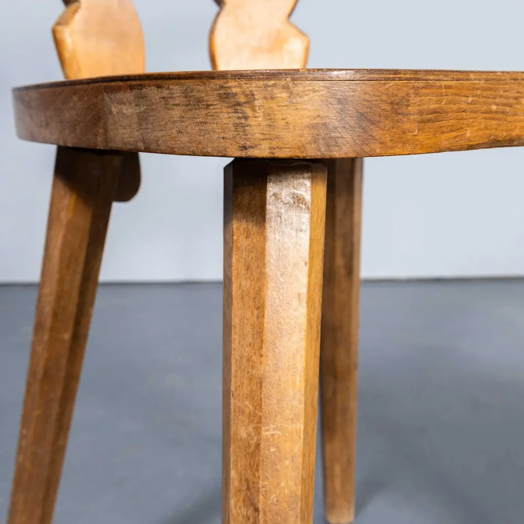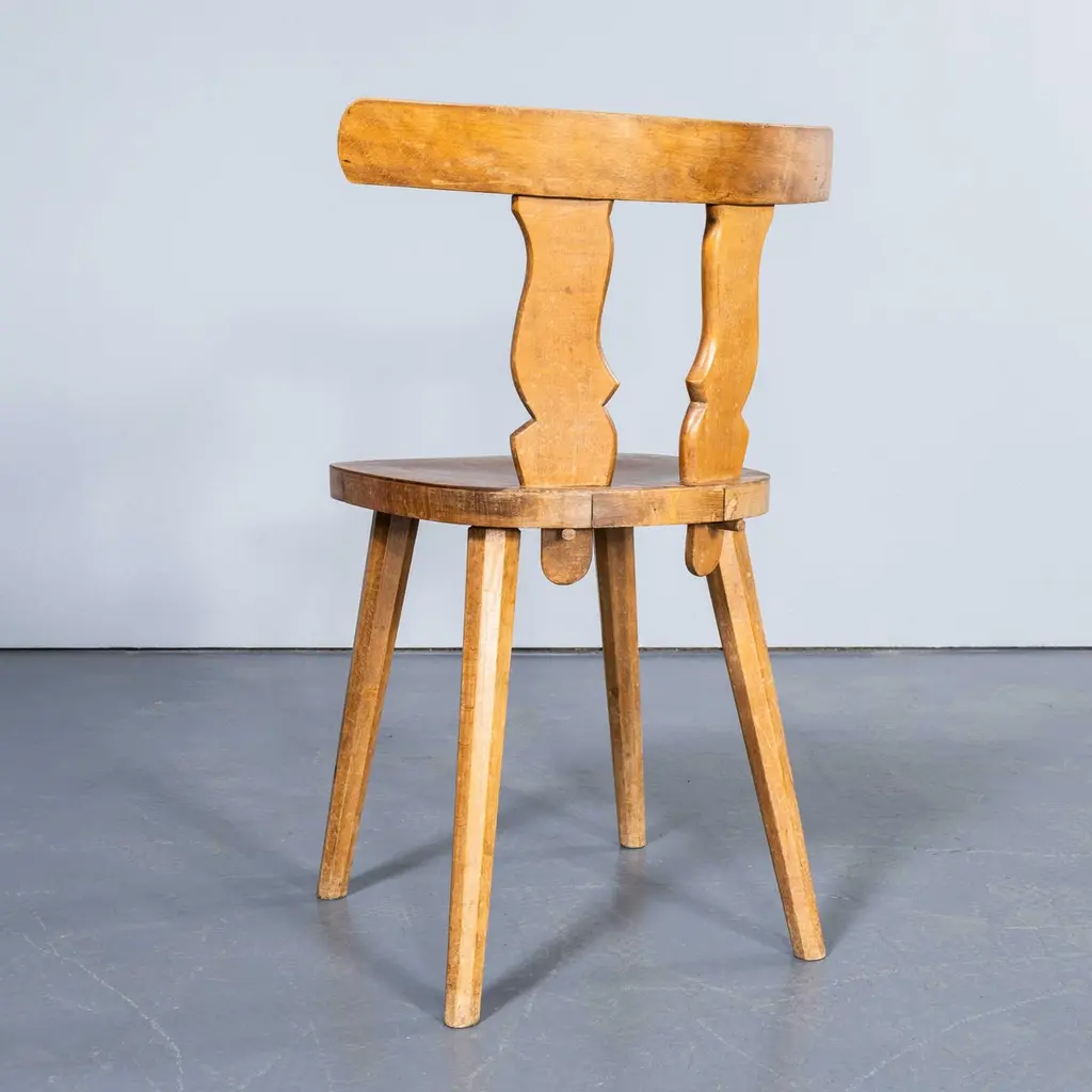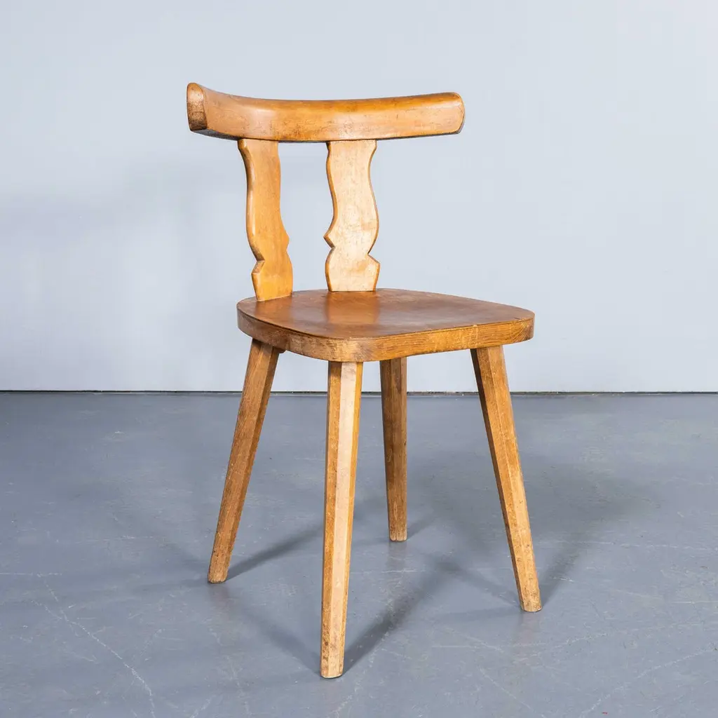 1950's Fischel French Ox Back Dining Chairs - Good Quantity Available. Fischel was founded in 1871 by Czech born David Gabriel Fischel, a successful vegetable oil merchant, using the first hand knowledge of his eldest son who had worked in one of Thonets Czech factories. First production was made in Germany in Niemes near the Danube. Later production moved to France in Alsace and sales offices were opened in most major French cities as Fischel became a major chair producer. These chairs date from the 1950's, an unusual shape for Fischel using mainly solid and not their traditional bentwood. Over scale Ox backs, chunky seats with a rich colour and character. We service and wax each chair before it leaves our workshop and we deliver chairs of excellent quality. Seat Height 47cm.Workshop Report:Our workshop team inspect every product and carry out any needed repairs to ensure that everything leaves us serviced and maintained ready for many more years of life. All of our vintage products show the rich beauty and history of their life with the knocks and bumps of many years of use and we try to minimise restoration to keep every piece as original as possible.Date:1950'sMaker:Fischel - FranceDimensions:51cm(w) x 43cm(l) x 80cm(h)