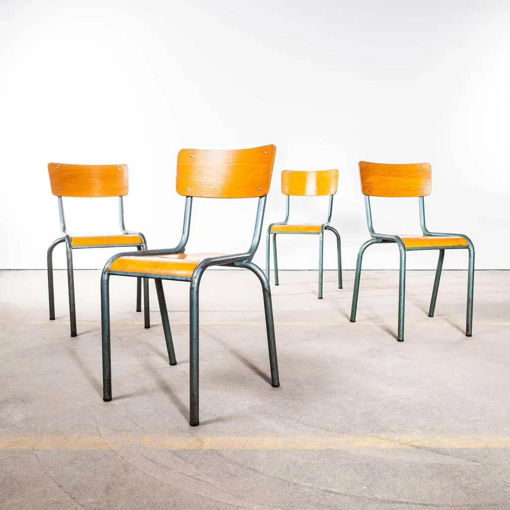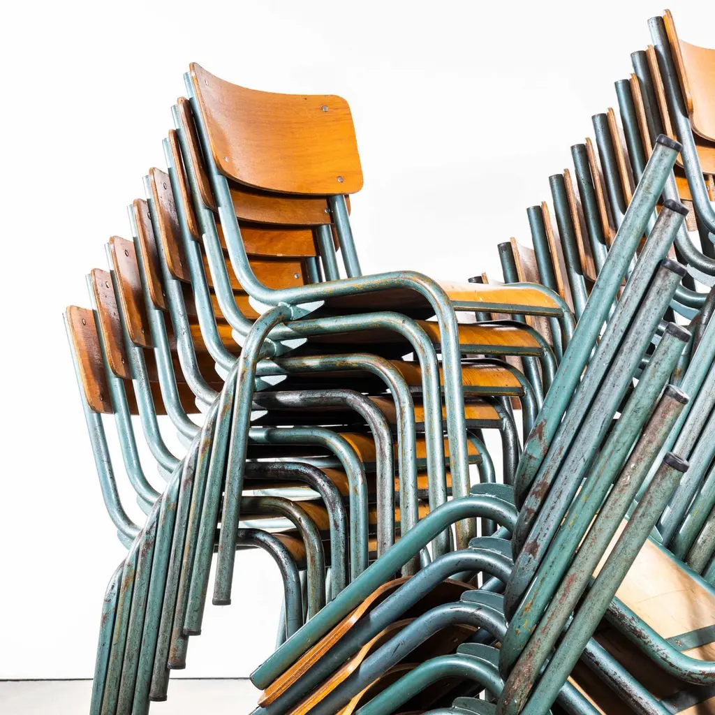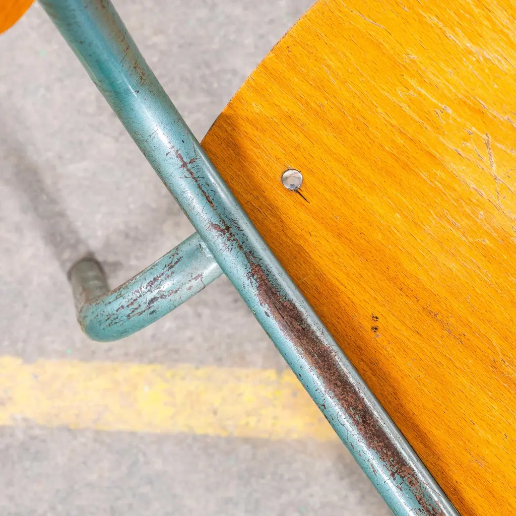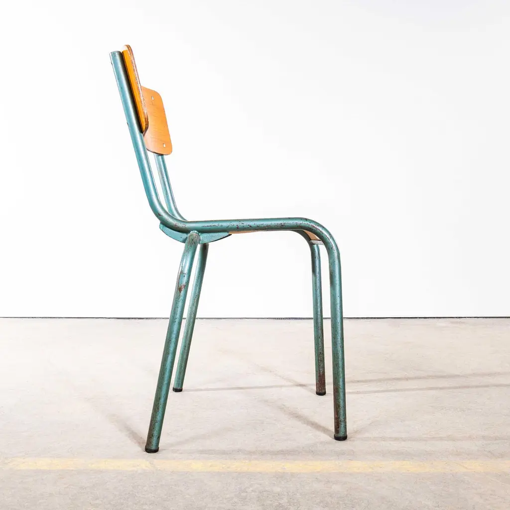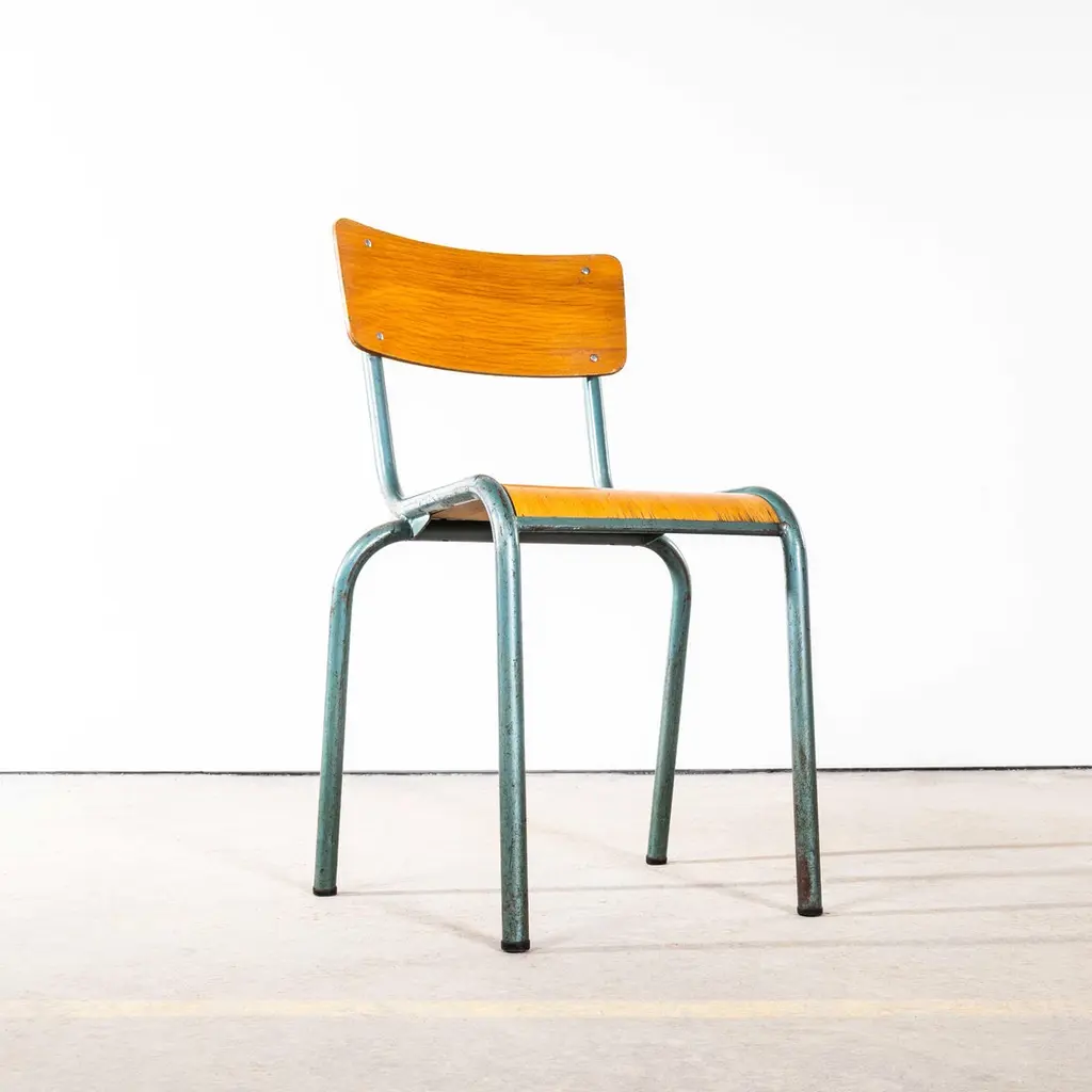 1950’s French 510 Mullca Aqua Stacking Dining Chairs – Large Quantity Available. One of our most favourite chairs, in 1947 Robert Muller and Gaston Cavaillon created the company that went on to develop arguably the most famous French school chair. Sadly the company no longer exists but vintage chairs can still be found, beautifully made with a strong tubular frame with birch seats and back inserts. Ours date from the 1950’s and we love the design with the subtle kick leg at the back and the well worn character. We service and rejuvenate all our chairs individually before they leave our workshop and we deliver chairs of excellent quality. Seat Height 46cm.We hold large stocks of original vintage chairs for private and commercial use. The price listed is for one chair and you can order any quantity subject to the maximum available.Workshop Report:Our workshop team inspect every product and carry out any needed repairs to ensure that everything leaves us serviced and maintained ready for many more years of life. All of our vintage products show the rich beauty and history of their life with the knocks and bumps of many years of use and we try to minimise restoration to keep every piece as original as possible.Date:1950'sMaker:Mullca – FranceDimensions:47cm(w) x 42cm(l) x 79cm(h)