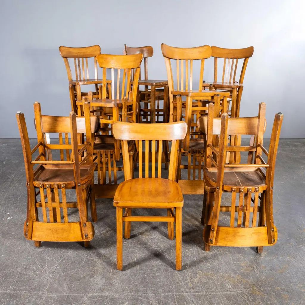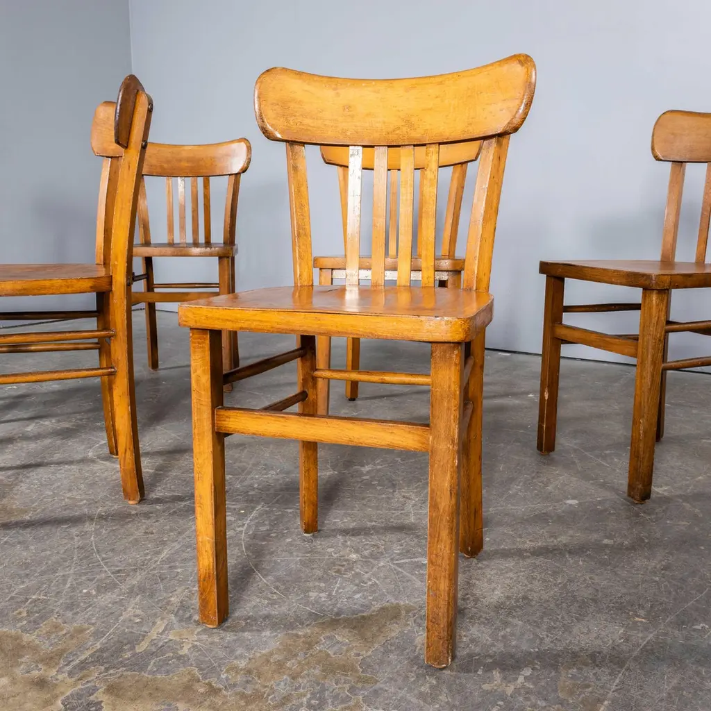 1950's Luterma Honey Oak Bentwood Grill Back Dining Chair - Good Quantities Available1950's Luterma Honey Oak Bentwood Grill Back Dining Chair - Good Quantities Available. The process of steam bending beech to create elegant chairs was discovered and developed by Thonet, but when its patents expired in 1869 many companies including Luterma launched production. Luterma was one of the brands marketed by Estonian factory A.M. Luther which was founded in the late 19th Century in Tallinn. Luthers production was principally in Estonia but they also had factories in France for local market production. At the time of the Bauhaus movement Walter Gropius and Marcel Breuer worked with the factory to develop various models. These chairs date from the 1950s, a simple classic shape with a beautiful colour and elegant grill shaped backs and seats. We service and rejuvenate each chair before it leaves our workshop and we deliver chairs of excellent quality. Seat Height 47cmWorkshop Report:Our workshop team inspect every product and carry out any needed repairs to ensure that everything leaves us serviced and maintained ready for many more years of life. All of our vintage products show the rich beauty and history of their life with the knocks and bumps of many years of use and we try to minimise restoration to keep every piece as original as possible.Date:1950'sMaker:Luterma – FranceDimensions:49cm(w) x 43cm(l) x 84cm(h)