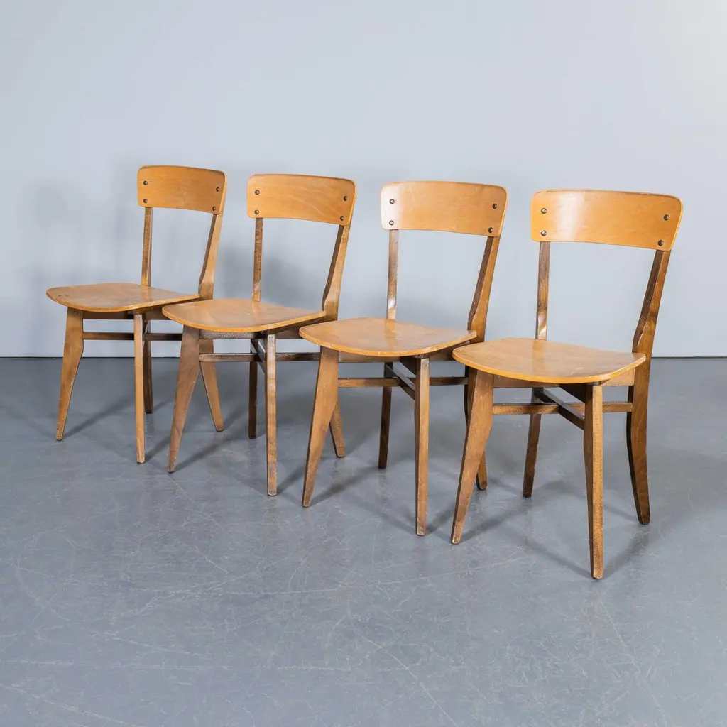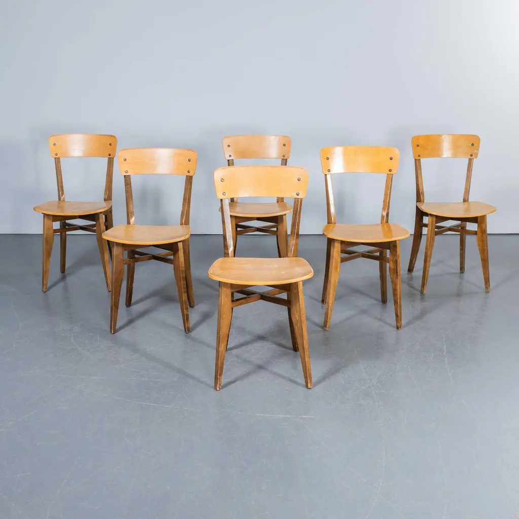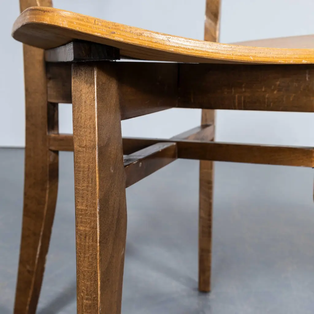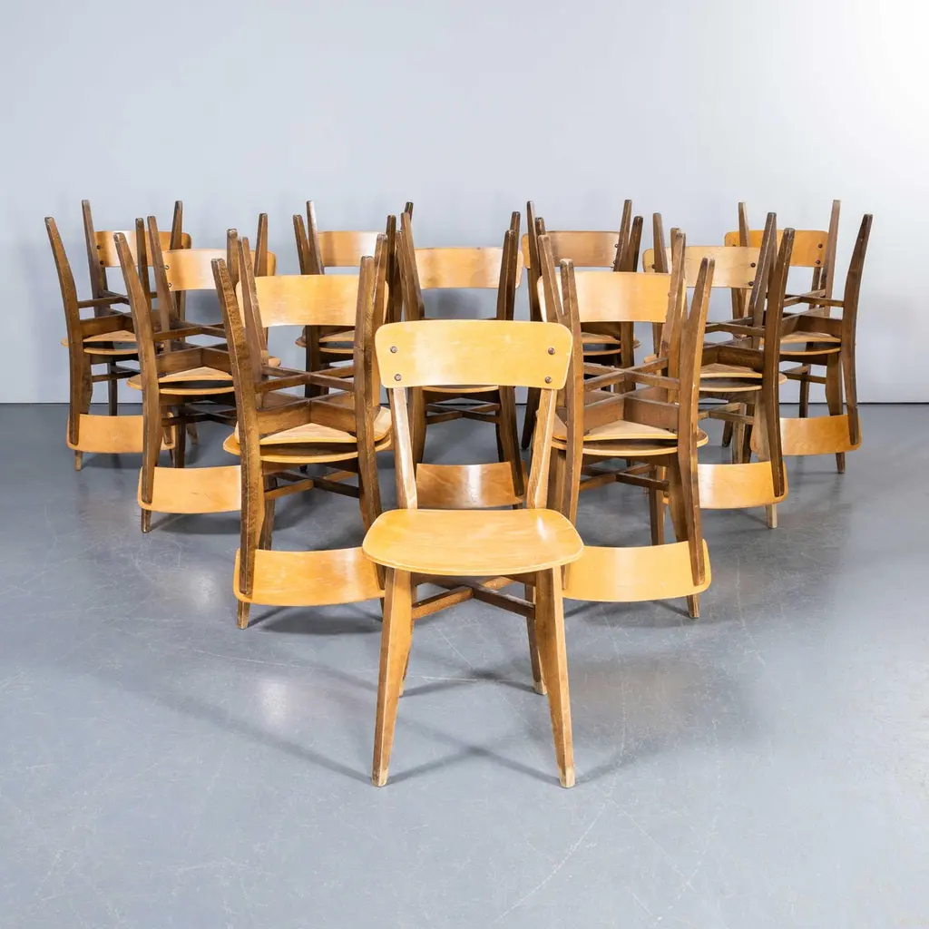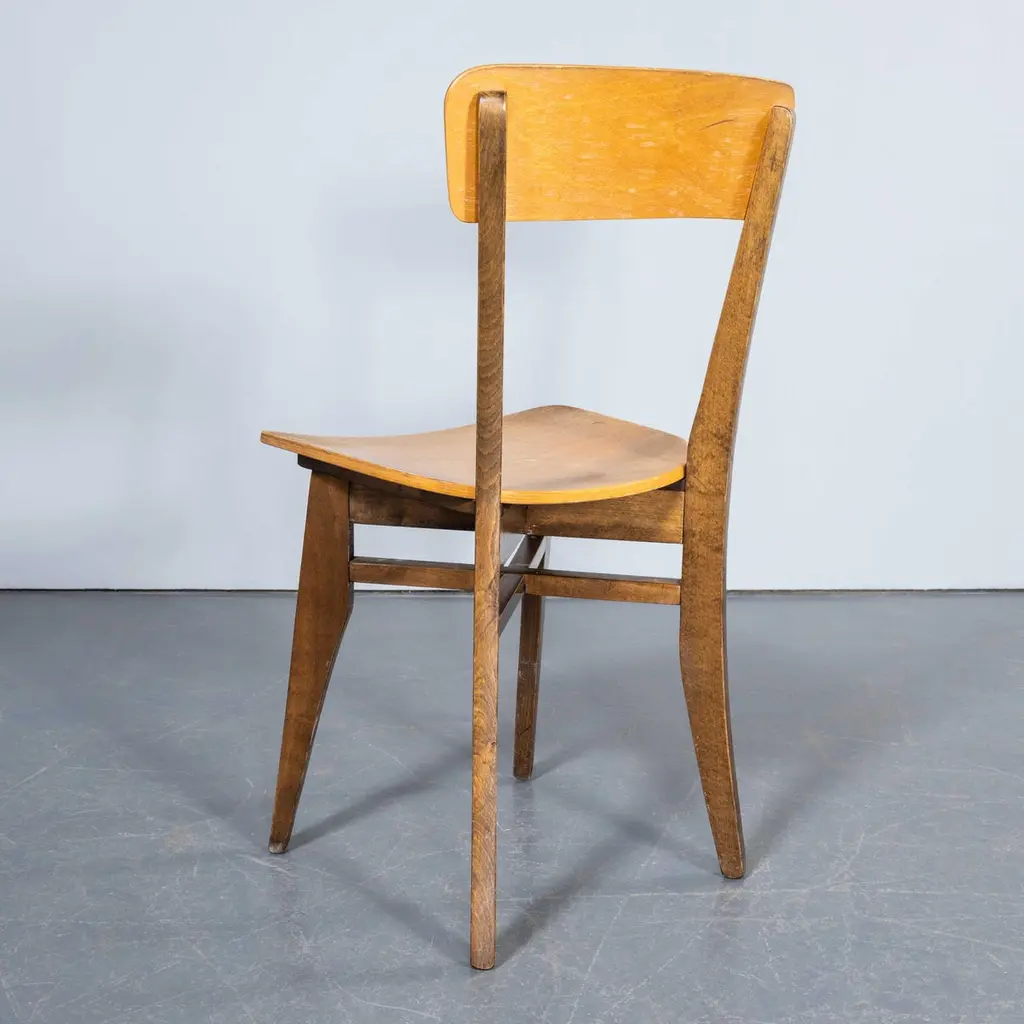 1950's Original French Two Tone Chapel Dining Chairs - Large Quantity Available. An incredible find we sourced these from a brutalist French 1950's Chapel outside Lille, we have over 200 of these available. These are the original chairs, designed and made for the chapel. Probably made by Bauman but not confirmed, the darker frame is made from oak and the seats and back are in birch. A strong comfortable chair with a double cross stretcher frame and tidy detail where the backs are pinned to the frames. Each chair passes through our workshop where it is serviced, cleaned and waxed. Seat Height: 47cmWorkshop Report:Our workshop team inspect every product and carry out any needed repairs to ensure that everything leaves us serviced and maintained ready for many more years of life. All of our vintage products show the rich beauty and history of their life with the knocks and bumps of many years of use and we try to minimise restoration to keep every piece as original as possible.Date:1950'sMaker:Industrial Production – FranceDimensions:40cm(w) x 41cm(l) x 82cm(h