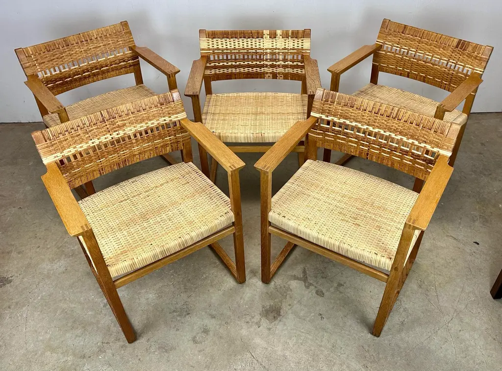 Slim and elegant, yet sturdy BM62 armchair / dining chair by famed Danish designer Borge Mogensen for Fredericia Stolefabrik circa 1960’s. Seats have recently been restored in woven rattan caning and backs have been selectively repaired where necessary. New rattan will age and patina over time. A classic and collectible chair. The BM 62 chairs are still in production and each retail for $4,420! We have 5 of them available.