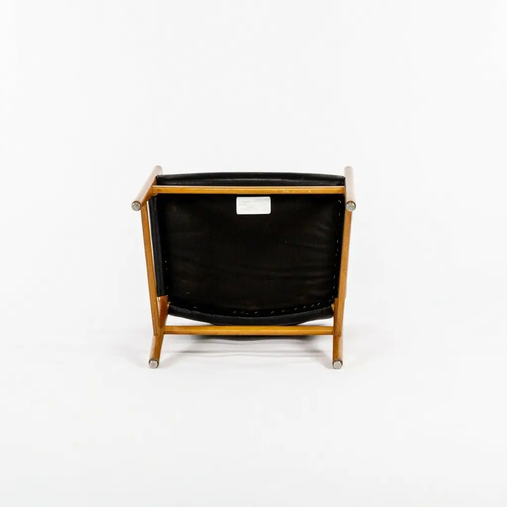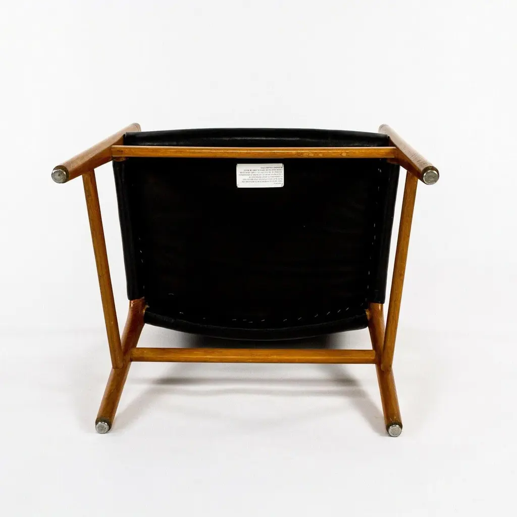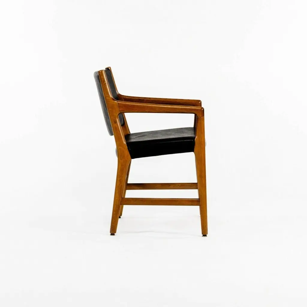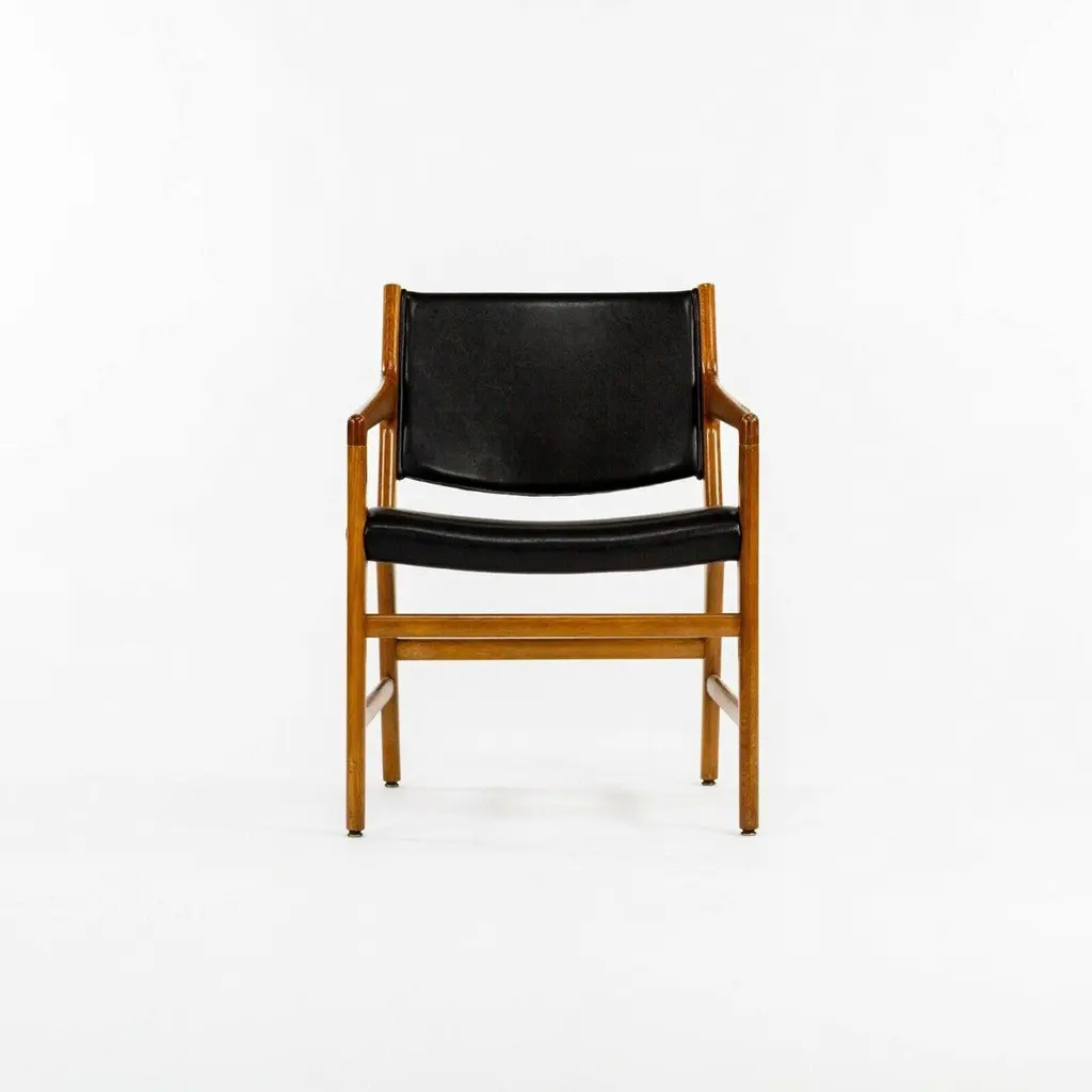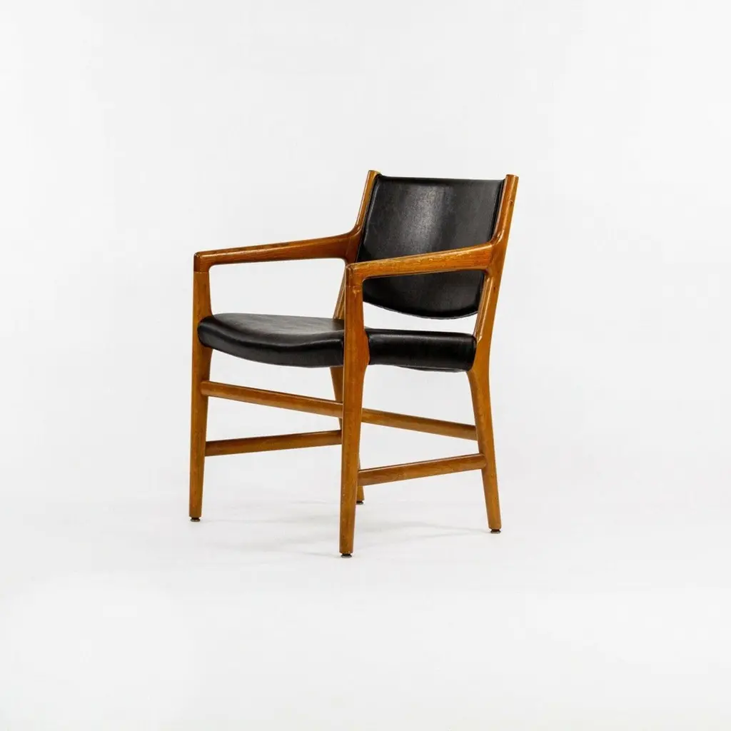 Listed for sale is a single (multiple chairs are available, but the price listed is for each chair) JH 507 dining chair with arms, designed by Hans Wegner, produced by Johannes Hansen. This grouping of chairs came from Harvard University and are accompanied by thorough documentation showing the chairs in the original context. The chairs were purchased new in 1965 along with countless other iconic furniture for use in the Countway Library of Medicine at Harvard Medical School. The library is a monumental brutalist form, designed by renowned architect and Harvard professor at the time, Hugh Stubbins. The architect was known for specifying furniture meticulously and frequently used works by Florence Knoll, Hans Wegner, Eero Saarinen, and Nicos Zographos, among others.These JH 507 chairs are exceptionally rare and were very expensive to produce, using solid oak, which was then sculpted into form and joined with precise wooden joinery. Each of these chairs is crafted from Oak and upholstered in what seems to be black leather.Twelve chairs are available, though the price listed is for each chair. The chairs measure 24 inches wide by 22 inches deep and 32 inches tall. If you would like these reupholstered, please also feel free to inquire. While the chairs do not need reupholstery, we can certainly help facilitate this if desired.Original documentation will be included with the purchase of each chair. This will include a copy of photographs of the library, showing these exact chairs in context, dated 1965 from when the building was completed and photographed.