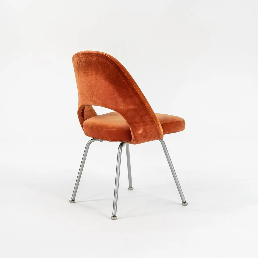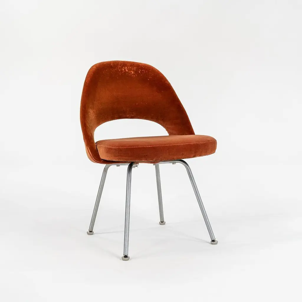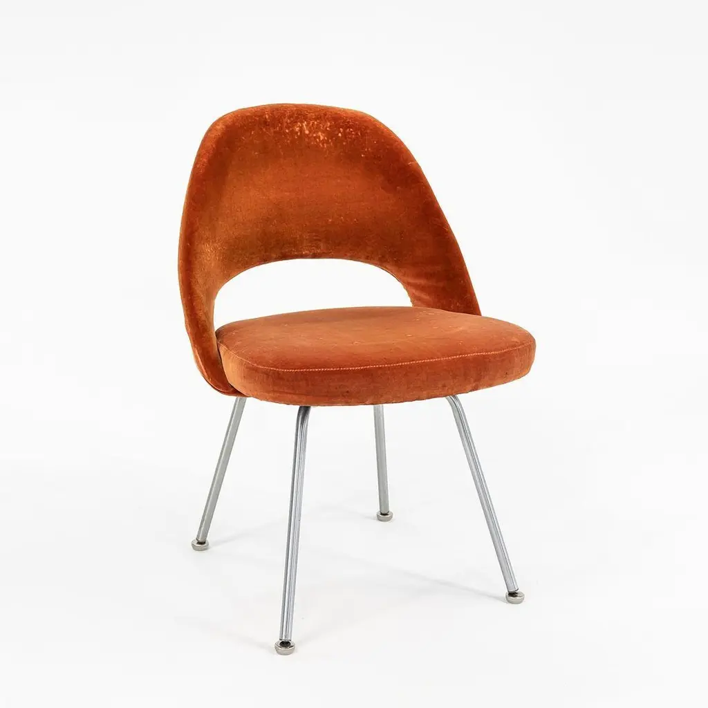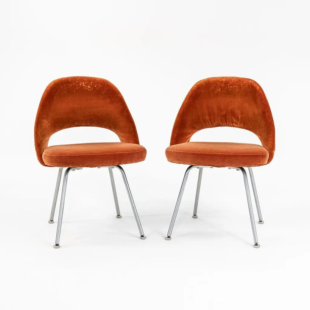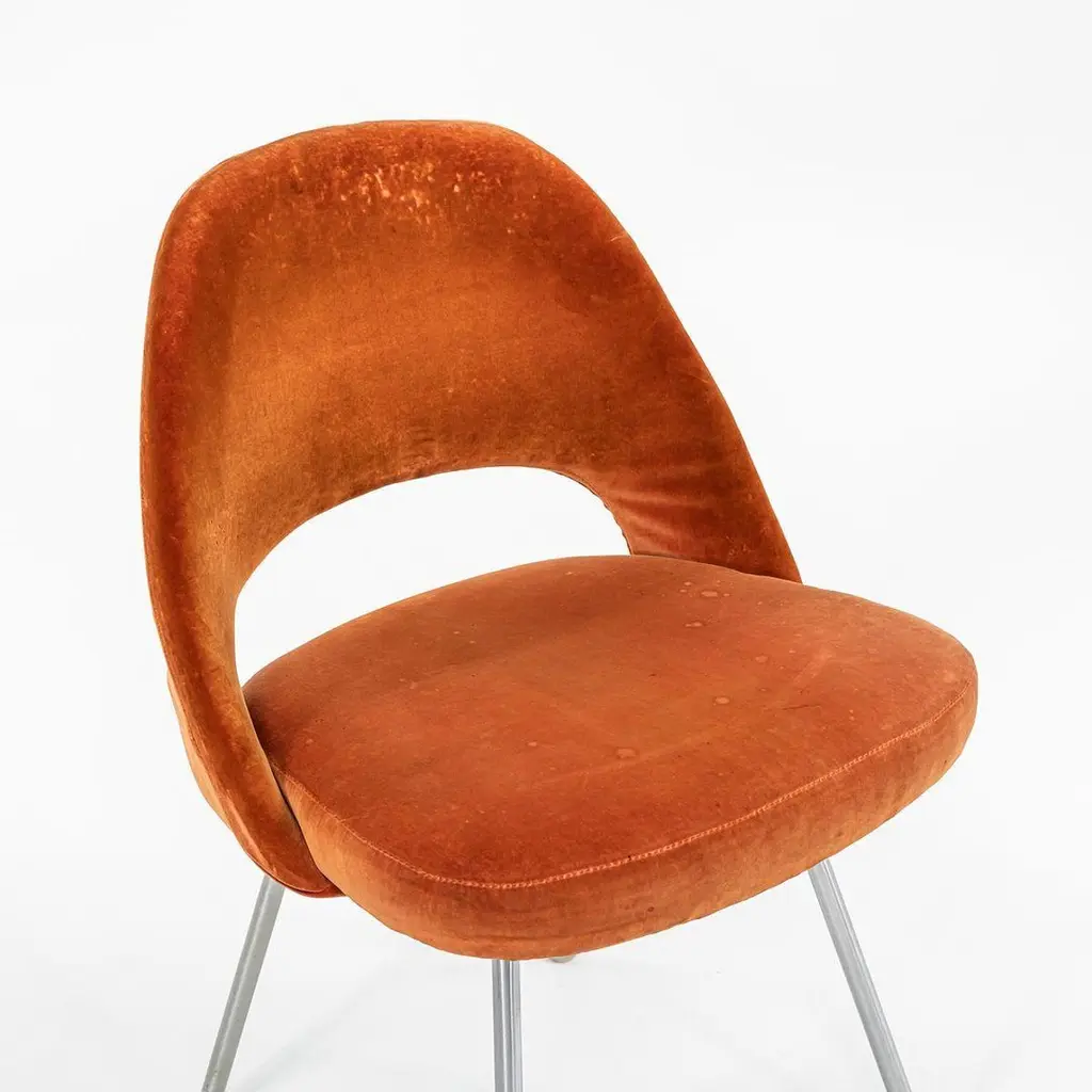 This is a Saarinen Executive Side Chair, model 72C, designed by Eero Saarinen for Knoll in 1950. These particular examples date to the 1970s. The listed price includes one chair, and we have a pair in this colorway available for individual sale. The design features chromed-steel tubular legs, and has rust-hued velvet upholstery. The pair was reupholstered at some point. Each chair measures 20.5 inches long, 22.5 inches wide, and 31.5 inches high. It has a seat height of 18.75 inches. There are several black spots and bleach spots on fabric, and the backrest foam is spongy. The fabric shows wear along the edges. Overall, these chairs are in fair condition with wear and age apparent. Please see photos. Genuinely faulty goods will be replaced or money refunded on a case by case basis, however we must be advised of any faulty goods upon receipt of the item. It is the customer's responsibility to pay for return shipping and ship the item back to us. If the item is found to be faulty, we will also refund the postage cost. If there is no damage to the item, but a return is approved, the buyer will be responsible for both the initial and return shipping cost. It is at our discretion to refuse the refund of undamaged goods. If an order is placed and you would like to cancel the order, please notify us immediately. Any refunds will be processed via the same means that payment was made.