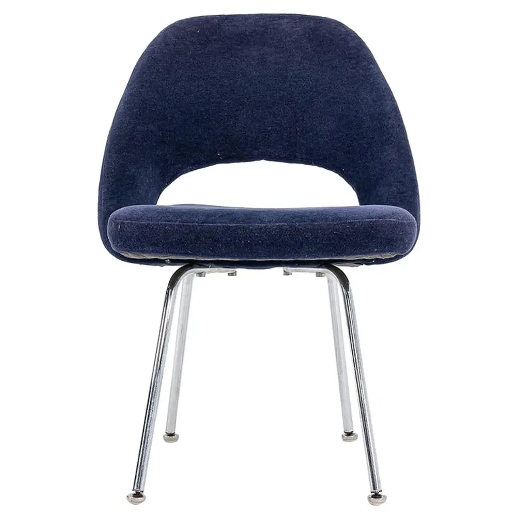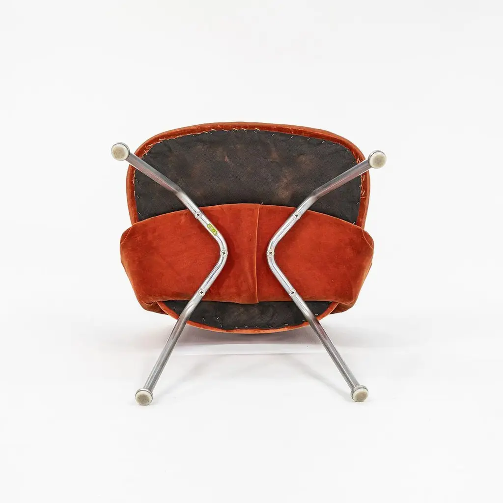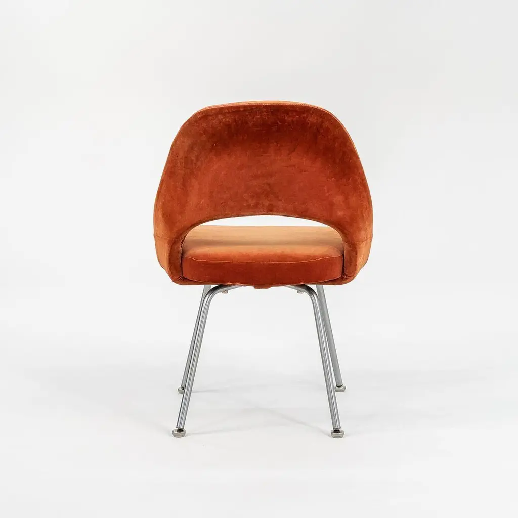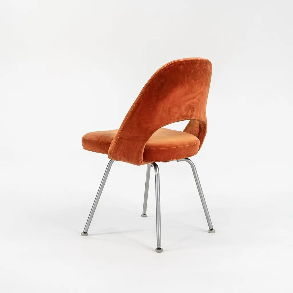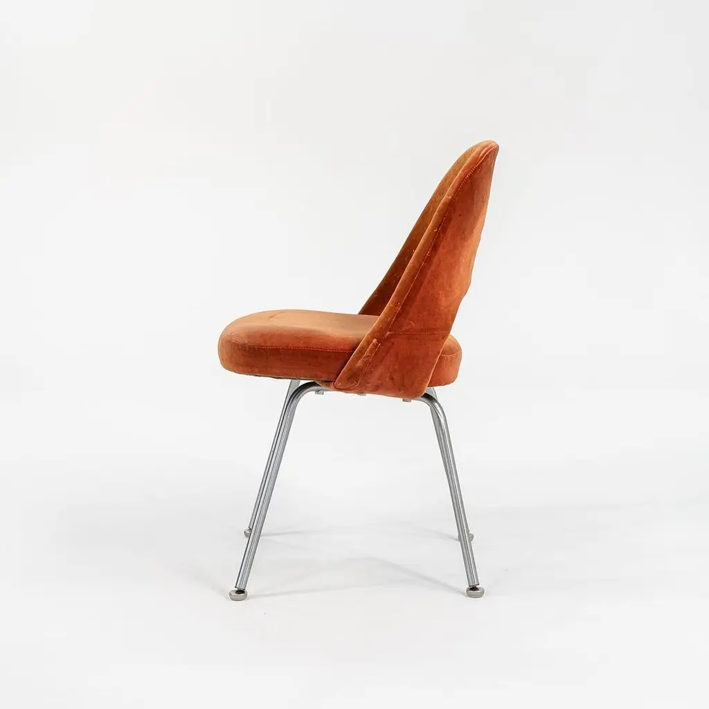This is a Saarinen Executive Side Chair, model 72C, designed by Eero Saarinen for Knoll in 1950. These particular examples date to the 1970s. The listed price includes one chair, and we have a pair in this colorway available for individual sale. The design features chromed-steel tubular legs, and has rust-hued velvet upholstery. The pair was reupholstered at some point. Each chair measures 20.5 inches long, 22.5 inches wide, and 31.5 inches high. It has a seat height of 18.75 inches. There are several black spots and bleach spots on fabric, and the backrest foam is spongy. The fabric shows wear along the edges. Overall, these chairs are in fair condition with wear and age apparent. Please see photos. Genuinely faulty goods will be replaced or money refunded on a case by case basis, however we must be advised of any faulty goods upon receipt of the item. It is the customer's responsibility to pay for return shipping and ship the item back to us. If the item is found to be faulty, we will also refund the postage cost. If there is no damage to the item, but a return is approved, the buyer will be responsible for both the initial and return shipping cost. It is at our discretion to refuse the refund of undamaged goods. If an order is placed and you would like to cancel the order, please notify us immediately. Any refunds will be processed via the same means that payment was made.