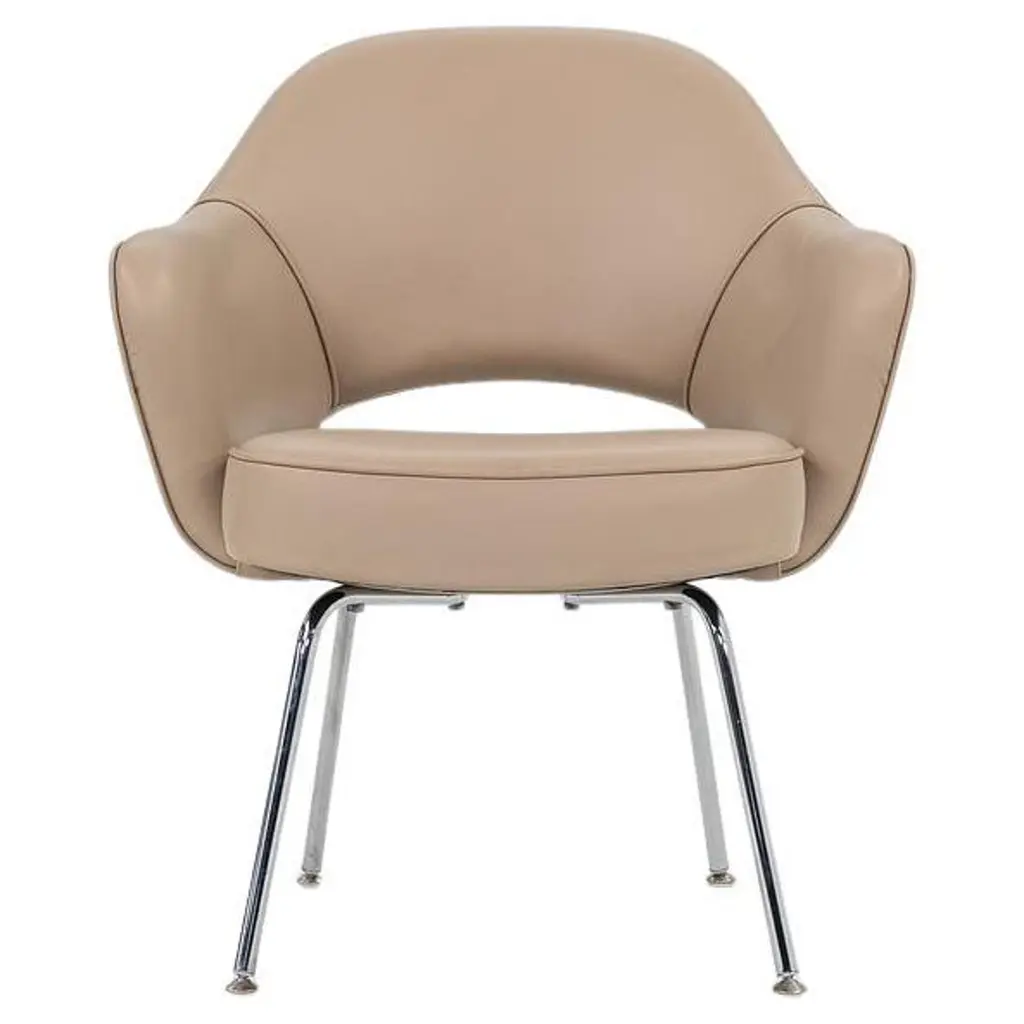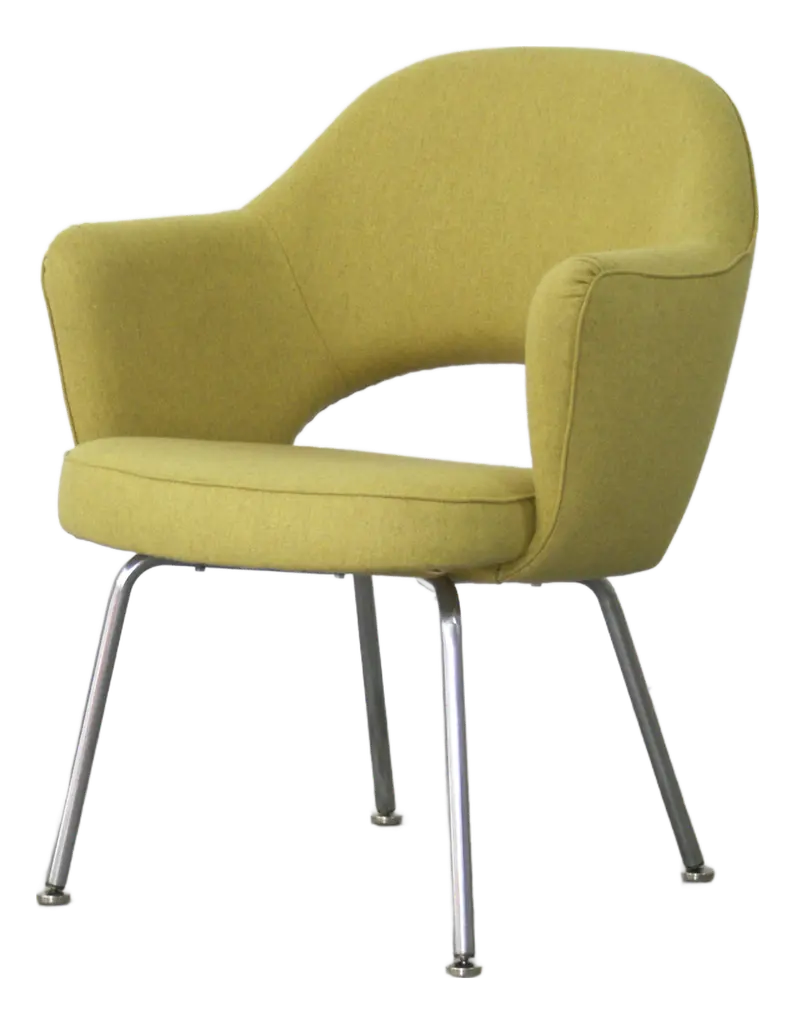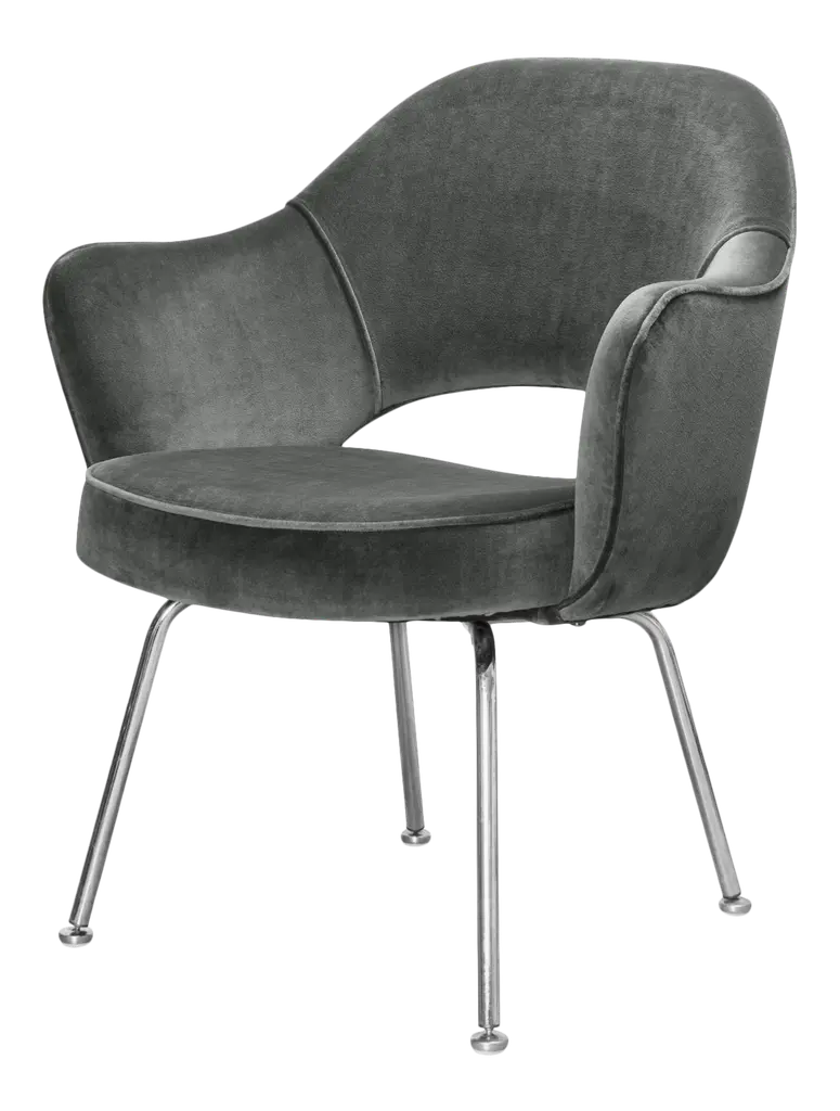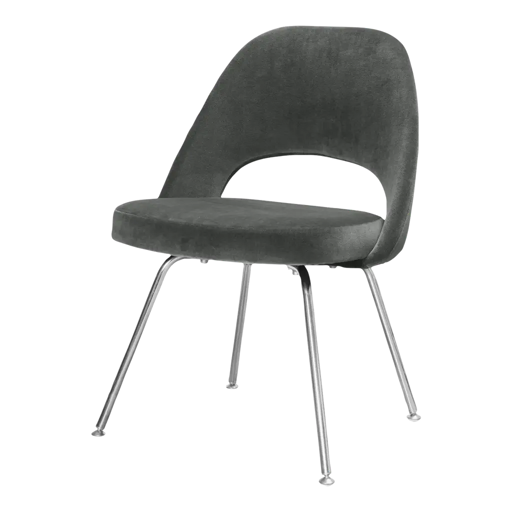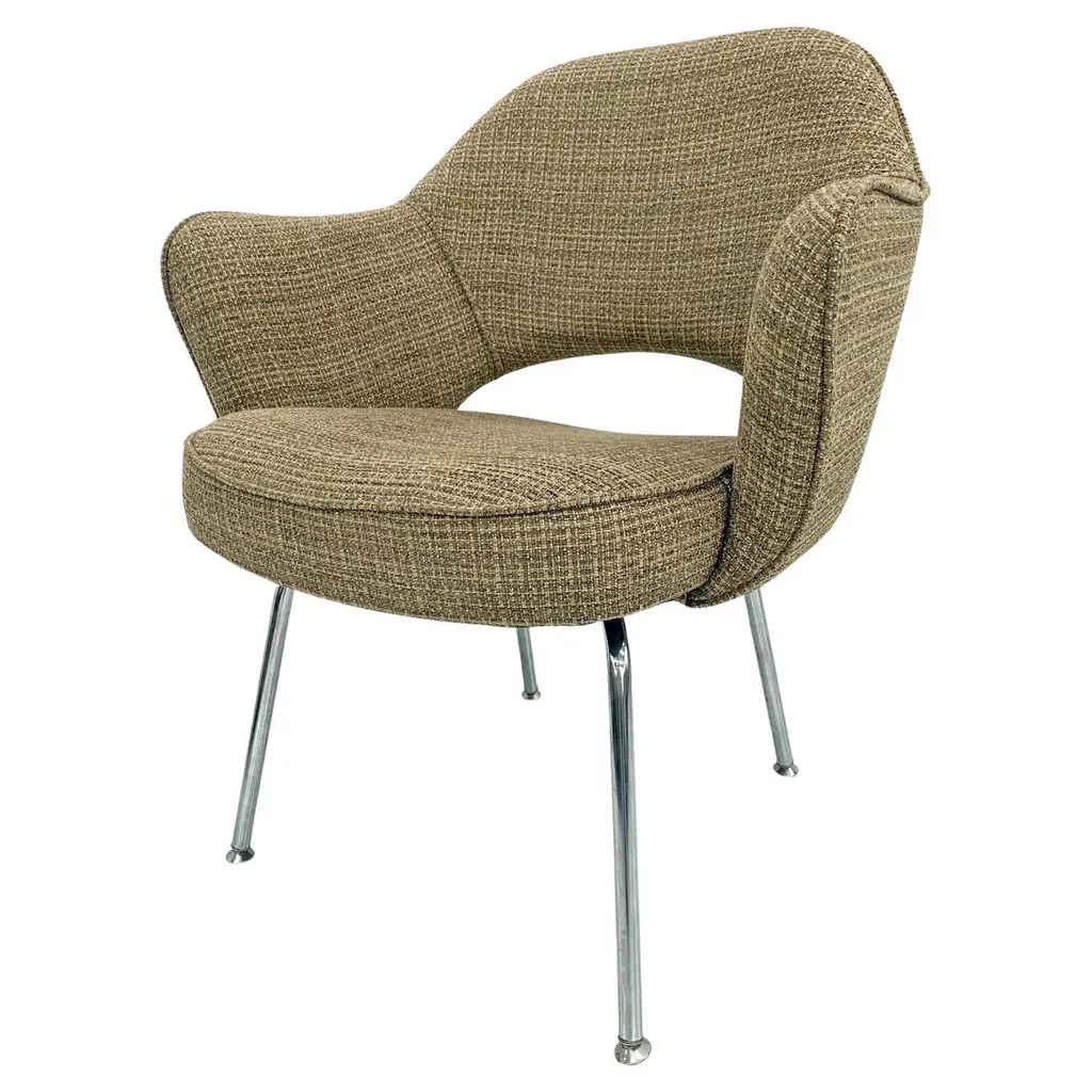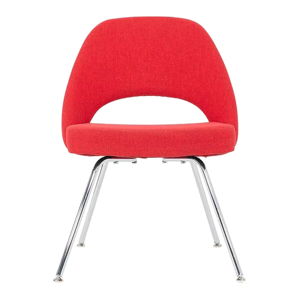 This is a Saarinen Executive Side Chair, model 72C, designed by Eero Saarinen for Knoll in 1950. These particular examples date to the 1970s. The listed price includes one chair, and we have a pair in this colorway available for individual sale. The design features chromed-steel tubular legs, and has rust-hued velvet upholstery. The pair was reupholstered at some point. Each chair measures 20.5 inches long, 22.5 inches wide, and 31.5 inches high. It has a seat height of 18.75 inches. There are several black spots and bleach spots on fabric, and the backrest foam is spongy. The fabric shows wear along the edges. Overall, these chairs are in fair condition with wear and age apparent. Please see photos. Genuinely faulty goods will be replaced or money refunded on a case by case basis, however we must be advised of any faulty goods upon receipt of the item. It is the customer's responsibility to pay for return shipping and ship the item back to us. If the item is found to be faulty, we will also refund the postage cost. If there is no damage to the item, but a return is approved, the buyer will be responsible for both the initial and return shipping cost. It is at our discretion to refuse the refund of undamaged goods. If an order is placed and you would like to cancel the order, please notify us immediately. Any refunds will be processed via the same means that payment was made.