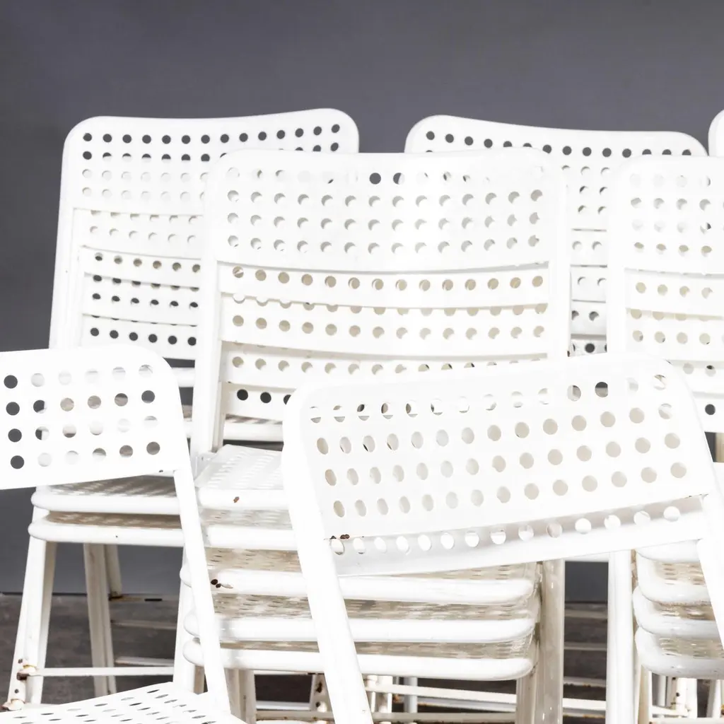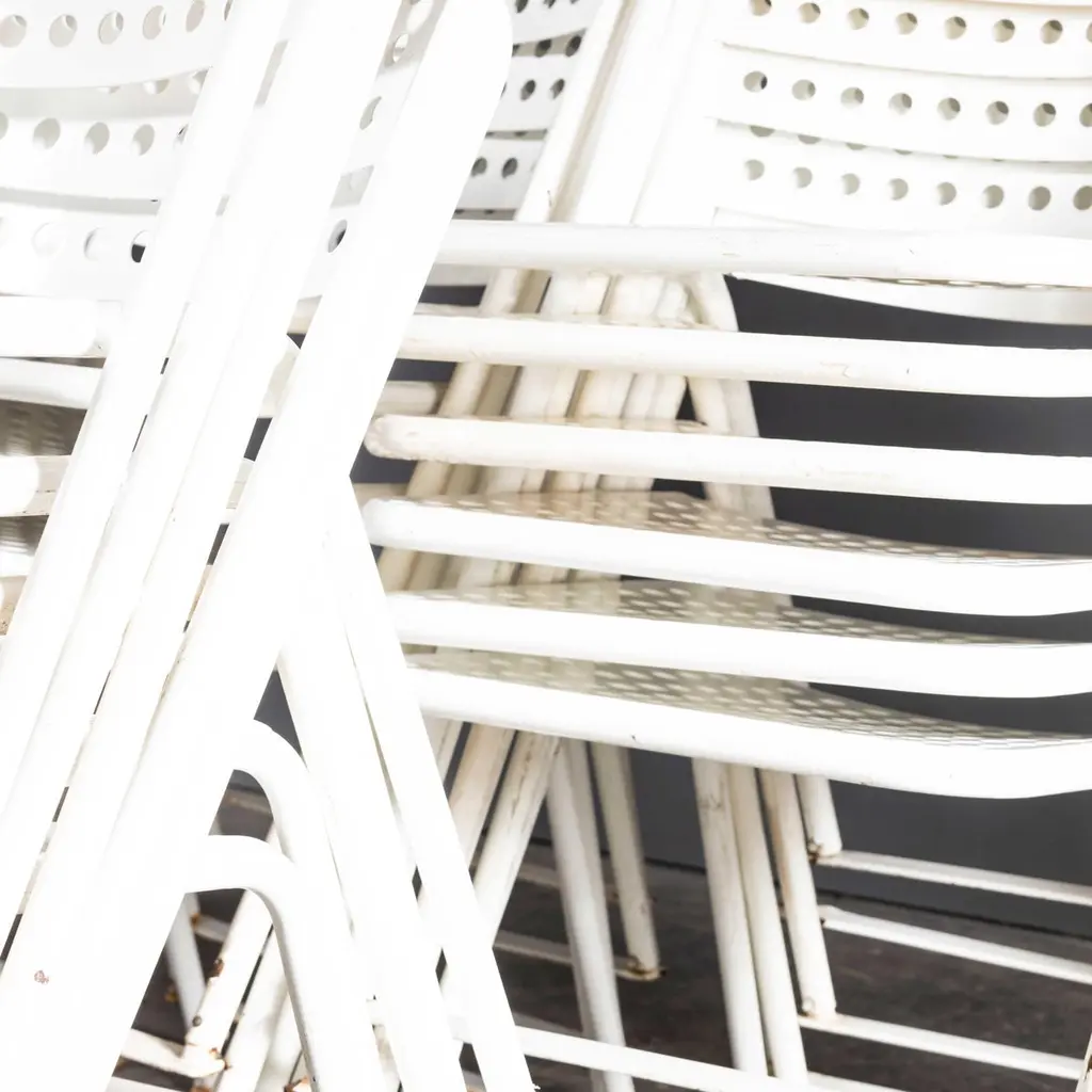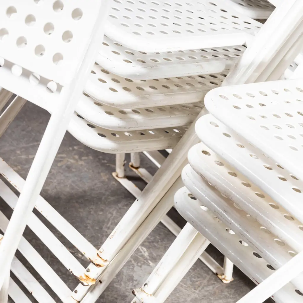 1970s Egon Eiremann House in Baden Baden White Metal Chairs – Various Quantities Available1970’s French Original White Outdoor Metal Dining Chairs – Various Quantities Available. We sourced these chairs from the Egon Eiremann house in Baden Baden, Germany. Egon Eiremann was one of Germany most prominent architects and furniture designers of the late 20th Century. The chairs were bought for his home, he had a reputation for hosting lavish and stylish gatherings and this set of over seventy chairs gives a flavour of the scale of his generosity and style. The chairs were not designed by Eireman but were selected for his home by him. The frames are steel which was plastic coated, a new technology for the time. Good strong practical outdoor chairs. Each chair is serviced and rejuvenated in our own workshops. The chairs have the grace and poise of folding chairs but they are fixed and do not fold. The bottom bars between the legs are a practical solution to stop the legs sinking into grass. The chairs are strong and practical and stack well. Seat height 45cm.WORKSHOP REPORTOur workshop team inspect every product and carry out any needed repairs to ensure that everything leaves us serviced and maintained ready for many more years of life. All of our vintage products show the rich beauty and history of their life with the knocks and bumps of many years of use and we try to minimise restoration to keep every piece as original as possible.Date: 1970'sMaker: Industrial production - FranceDimensions:L 57 x W 47 x H 79 cm
