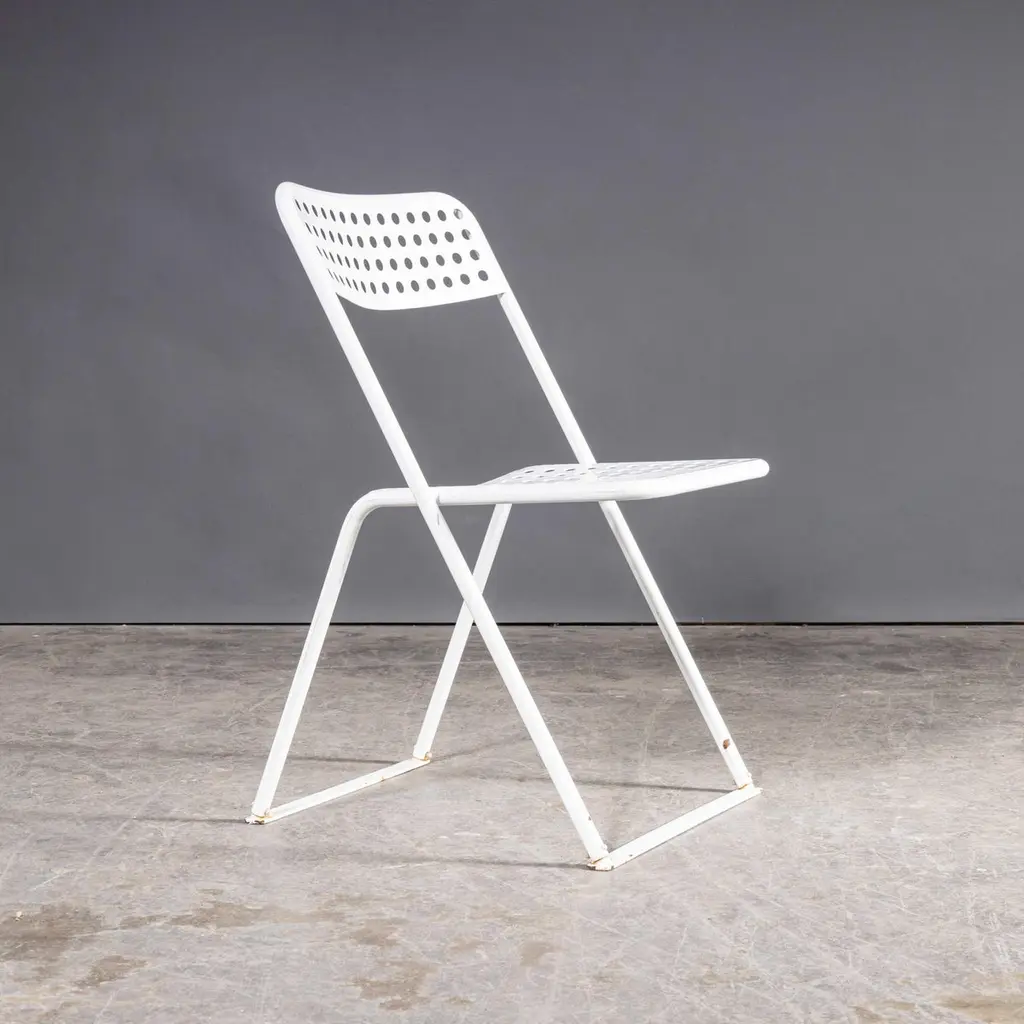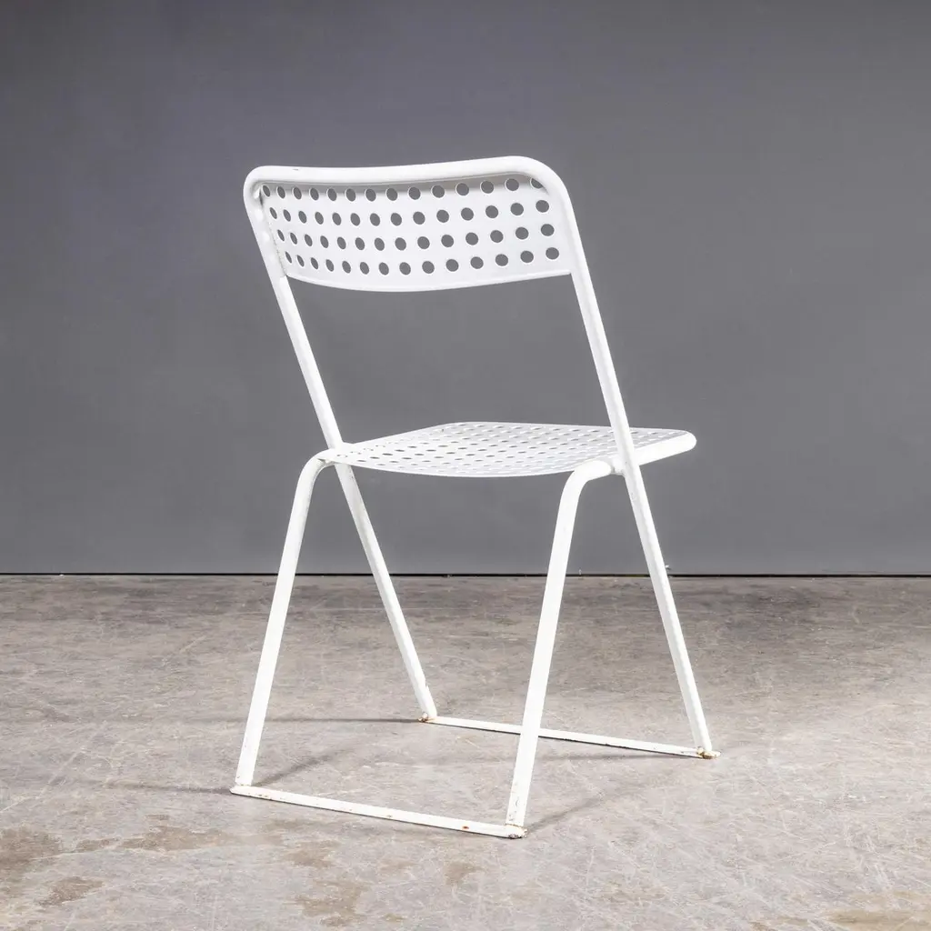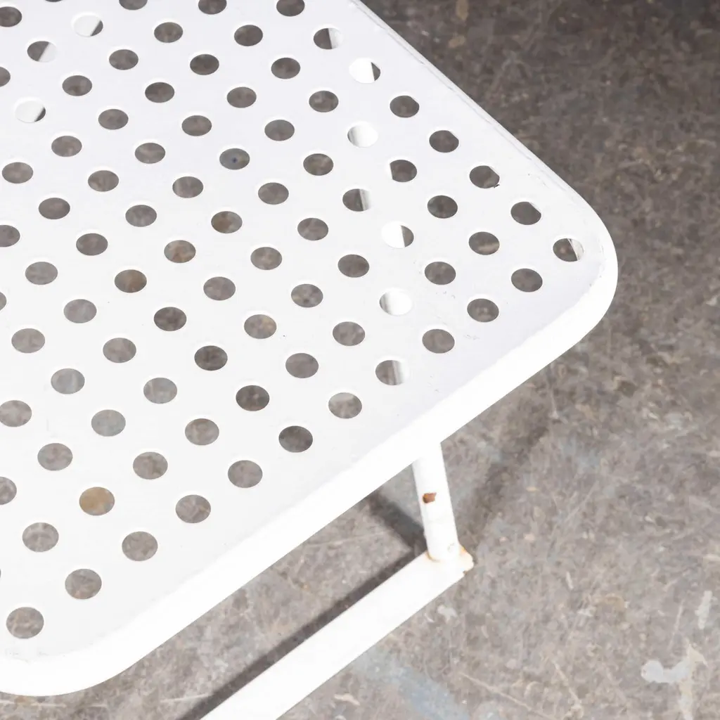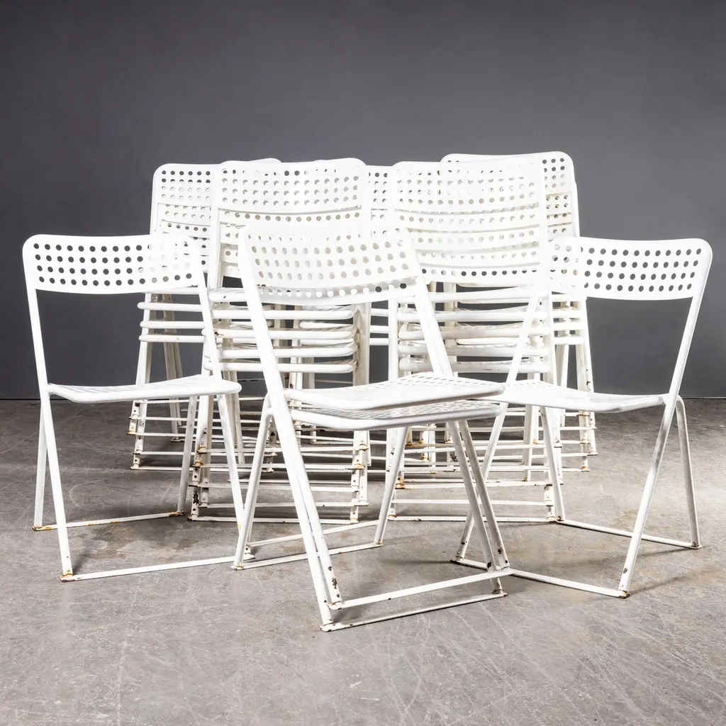 1970s Egon Eiremann House in Baden Baden White Metal Chairs – Various Quantities Available1970’s French Original White Outdoor Metal Dining Chairs – Various Quantities Available. We sourced these chairs from the Egon Eiremann house in Baden Baden, Germany. Egon Eiremann was one of Germany most prominent architects and furniture designers of the late 20th Century. The chairs were bought for his home, he had a reputation for hosting lavish and stylish gatherings and this set of over seventy chairs gives a flavour of the scale of his generosity and style. The chairs were not designed by Eireman but were selected for his home by him. The frames are steel which was plastic coated, a new technology for the time. Good strong practical outdoor chairs. Each chair is serviced and rejuvenated in our own workshops. The chairs have the grace and poise of folding chairs but they are fixed and do not fold. The bottom bars between the legs are a practical solution to stop the legs sinking into grass. The chairs are strong and practical and stack well. Seat height 45cm.WORKSHOP REPORTOur workshop team inspect every product and carry out any needed repairs to ensure that everything leaves us serviced and maintained ready for many more years of life. All of our vintage products show the rich beauty and history of their life with the knocks and bumps of many years of use and we try to minimise restoration to keep every piece as original as possible.Date: 1970'sMaker: Industrial production - FranceDimensions:L 57 x W 47 x H 79 cm