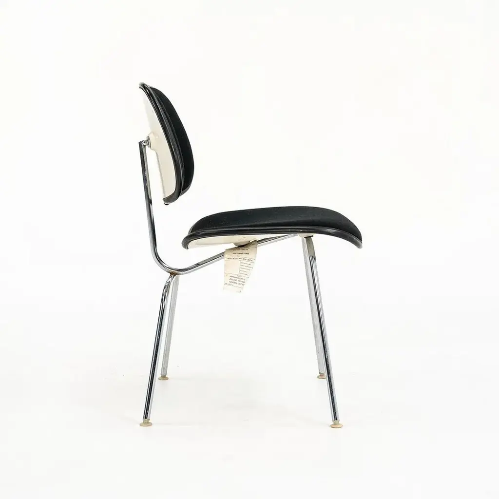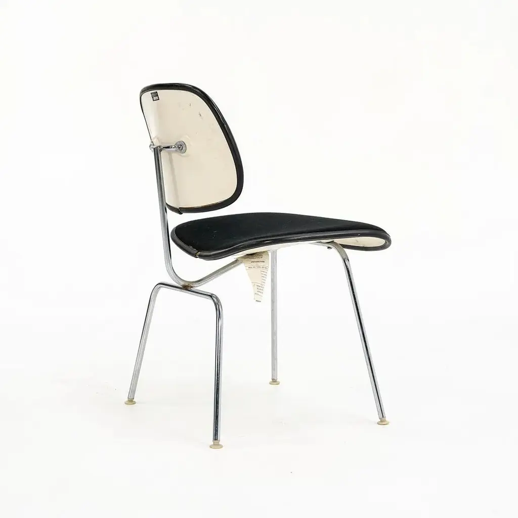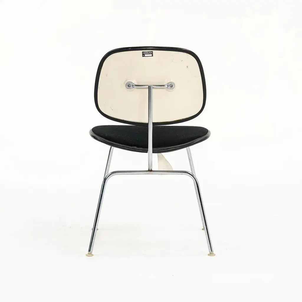 This is an Eames DCMU Chair, designed by Charles and Ray Eames for Herman Miller. This model was designed in 1970. The acronym DCMU stands for Dining Height (D) Chair (C) on Metal (M) Rod Base Upholstered (U). The listed price includes one chair and we have several available for purchase. The chairs are constructed of fiberglass & plastic, and they feature a tubular steel base. The upholstery is done in black Alexander Girard Hopsack fabric. Interestingly, the bases used for this chair model are the same as the original plywood DCM. The DCMU is 21.5 inches long, 19.5 inches wide, and 29.5 inches high. It has a seat height of 19 inches. These chairs are in very good vintage condition, and they retain their original fabric which shows some light wear from use. Their original white glides are present. The tubular steel legs are in good condition with slight scratches and nicks. Overall, these chairs are in good vintage condition with light wear present. Please see photos. The rubber edge banding tends to be problematic on these, so if there are any existing issues, we will do our best to address them prior to shipping. These chairs were originally purchased by Elizabethtown College in Pennsylvania and some retain the college label underneath.