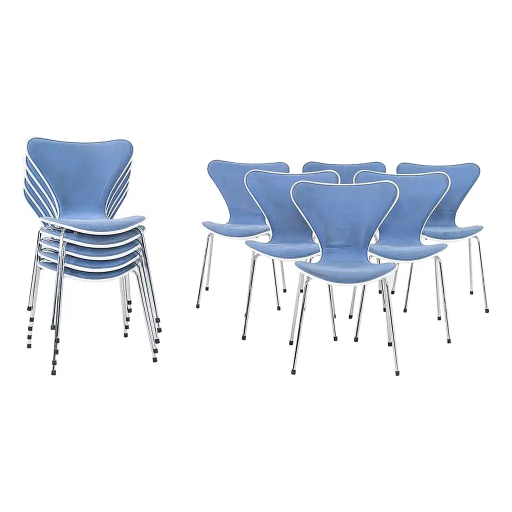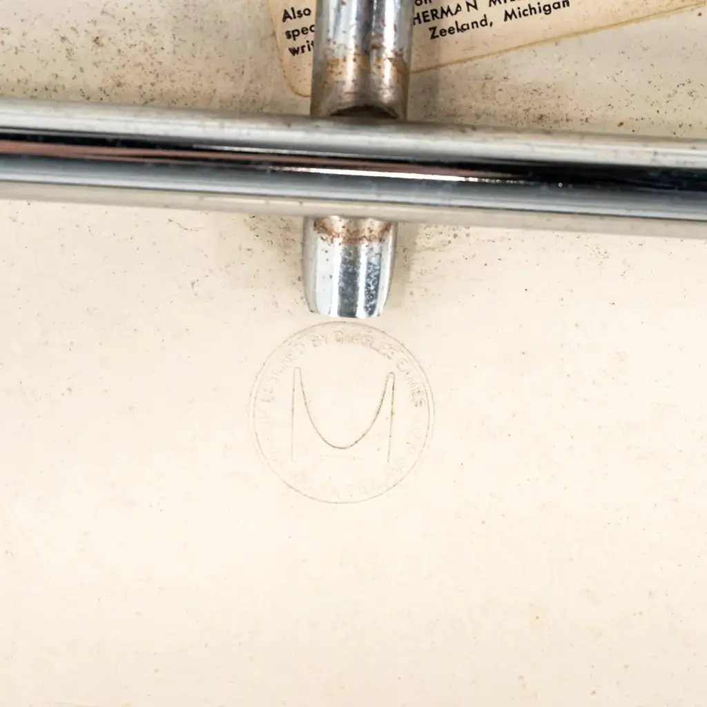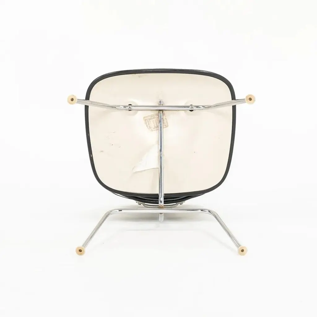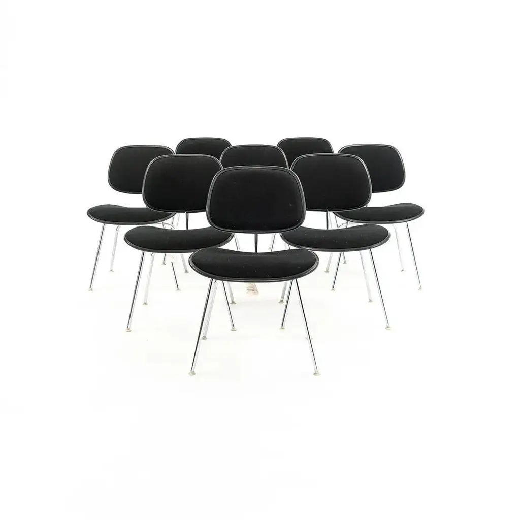 This is an Eames DCMU Chair, designed by Charles and Ray Eames for Herman Miller. This model was designed in 1970. The acronym DCMU stands for Dining Height (D) Chair (C) on Metal (M) Rod Base Upholstered (U). The listed price includes one chair and we have several available for purchase. The chairs are constructed of fiberglass & plastic, and they feature a tubular steel base. The upholstery is done in black Alexander Girard Hopsack fabric. Interestingly, the bases used for this chair model are the same as the original plywood DCM. The DCMU is 21.5 inches long, 19.5 inches wide, and 29.5 inches high. It has a seat height of 19 inches. These chairs are in very good vintage condition, and they retain their original fabric which shows some light wear from use. Their original white glides are present. The tubular steel legs are in good condition with slight scratches and nicks. Overall, these chairs are in good vintage condition with light wear present. Please see photos. The rubber edge banding tends to be problematic on these, so if there are any existing issues, we will do our best to address them prior to shipping. These chairs were originally purchased by Elizabethtown College in Pennsylvania and some retain the college label underneath.