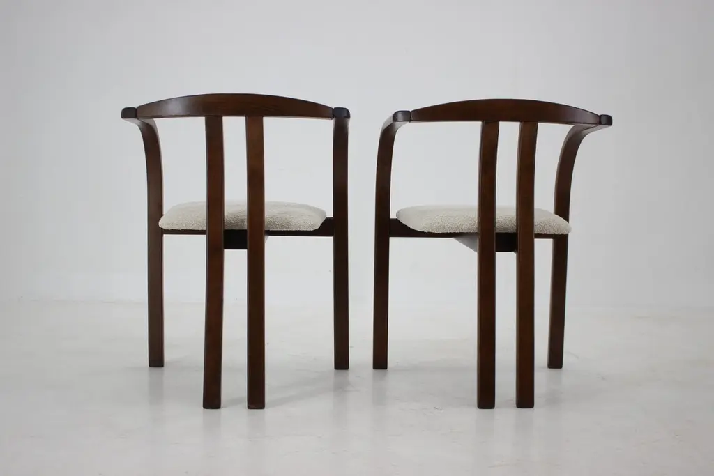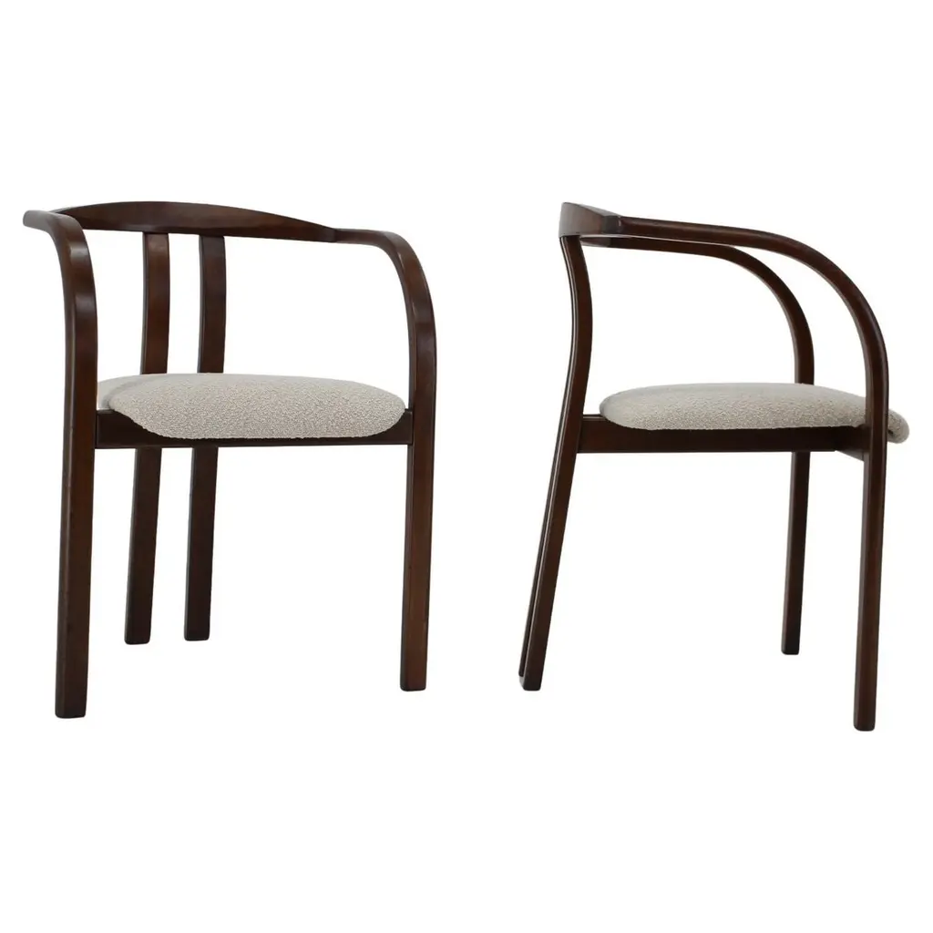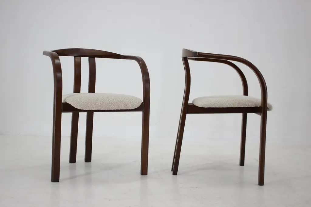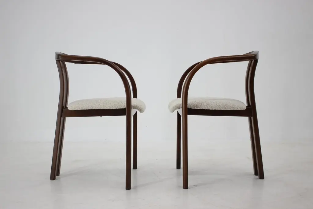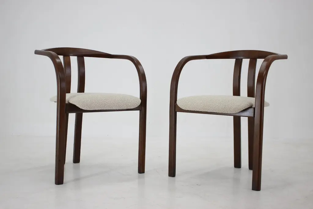 - Made in Czechoslovakia.- Newly upholstered.- Wooden parts with minor signs of use.- Measures: height of seat 42 cm.- Cream white color.