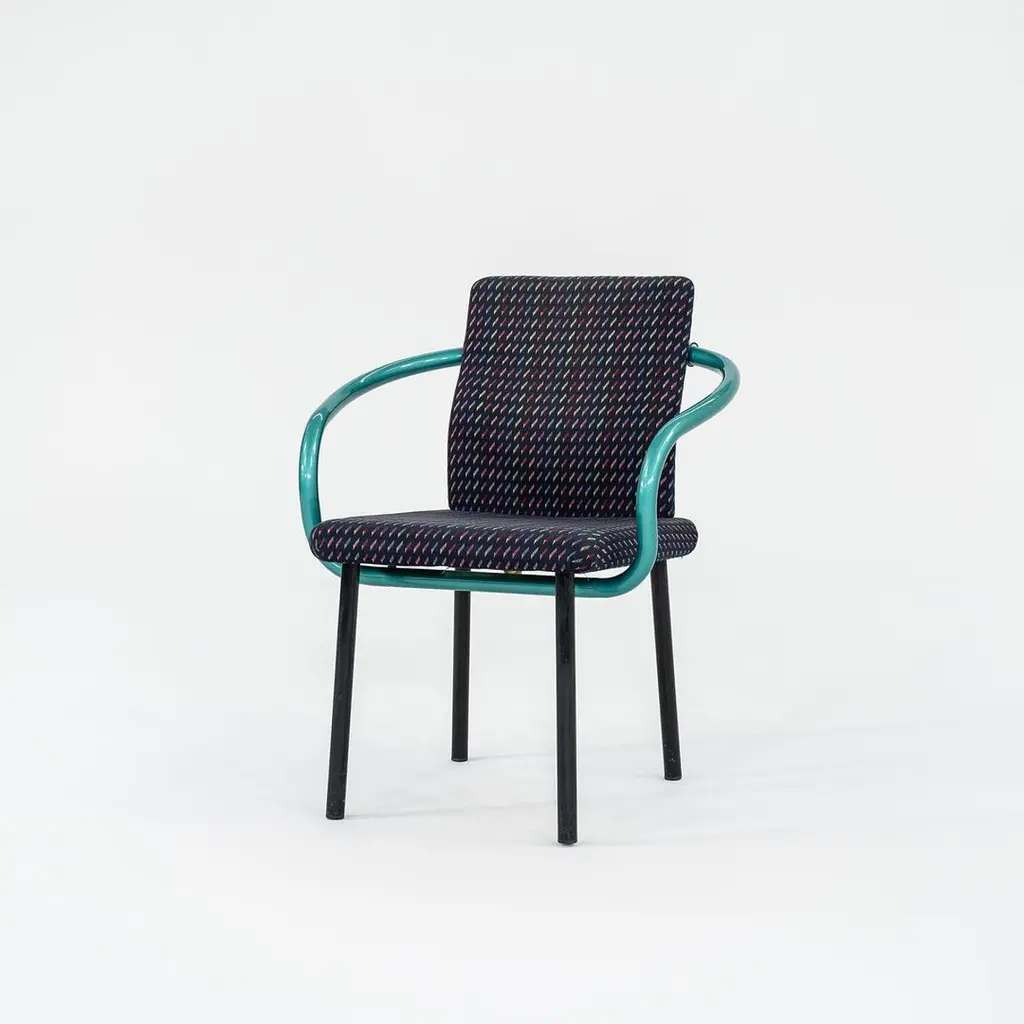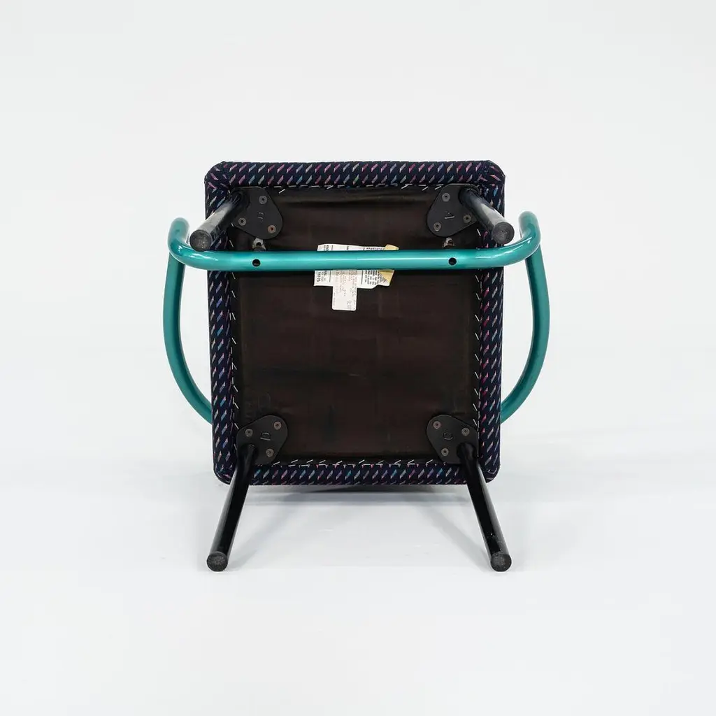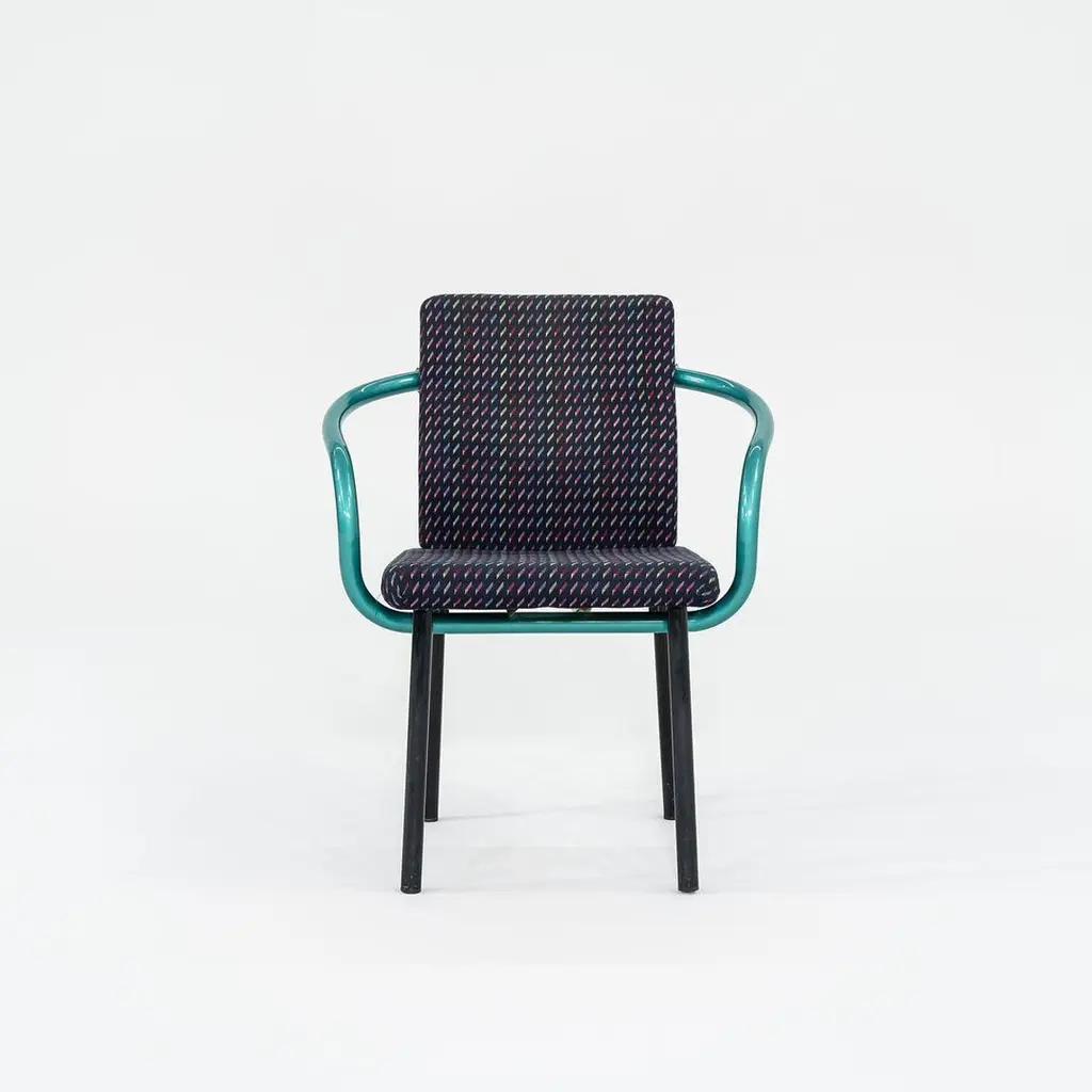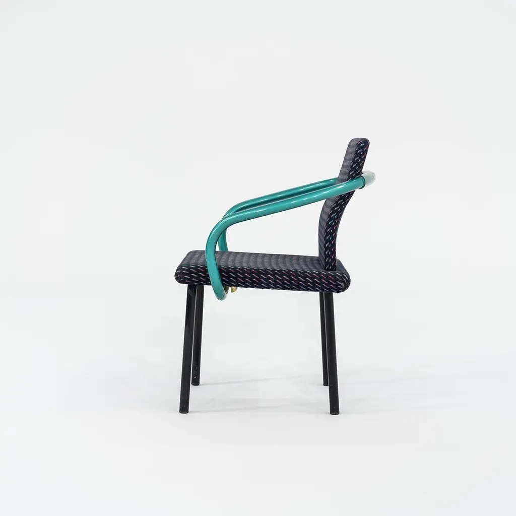 This is a Postmodern “Mandarin” armchair, initially designed by Ettore Sottsass for Knoll in 1986. These examples date to the 1990s, and the listed price includes one chair. We have three chairs available for purchase in this colorway. Their design features sculptural, tubular steel legs & arms, and has an upholstered seat & back. The upholstery is done in a geometrically patterned multi-colored fabric. These examples have glossy teal green enamel details. It’s all about the arms on these chairs... unmistakably Sottsass. Each chair measures 21 inches deep, 26 inches wide, and is 32 inches high. They have a seat height of 18 inches. Their enameled-steel arms and legs show some scuffs to the surface, leaving some rust, and the upholstery fabric shows very slight fading. Overall, these chairs are in solid vintage condition with some signs of use. Please see photos. Genuinely faulty goods will be replaced or money refunded on a case by case basis, however we must be advised of any faulty goods upon receipt of the item. It is the customer's responsibility to pay for return shipping and ship the item back to us. If the item is found to be faulty, we will also refund the postage cost. If there is no damage to the item, but a return is approved, the buyer will be responsible for both the initial and return shipping cost. It is at our discretion to refuse the refund of undamaged goods. If an order is placed and you would like to cancel the order, please notify us immediately. Any refunds will be processed via the same means that payment was made.