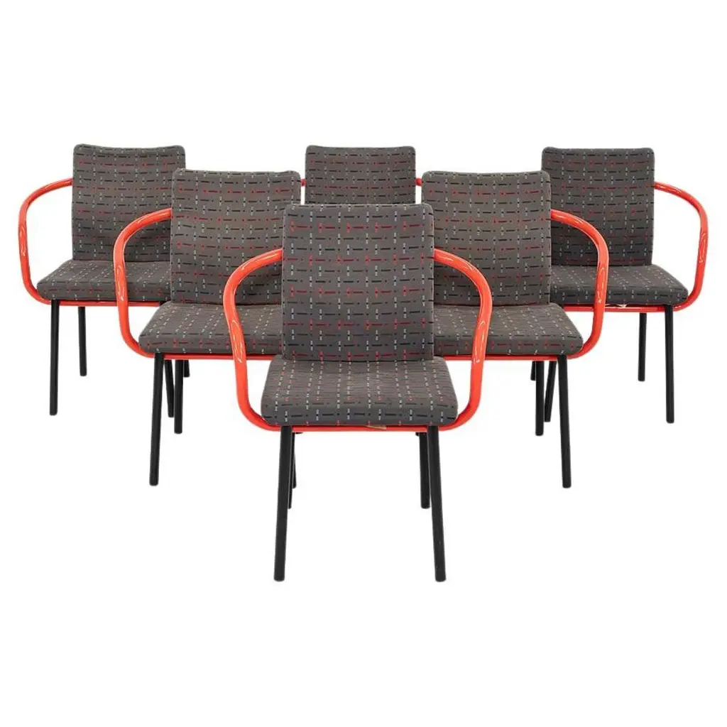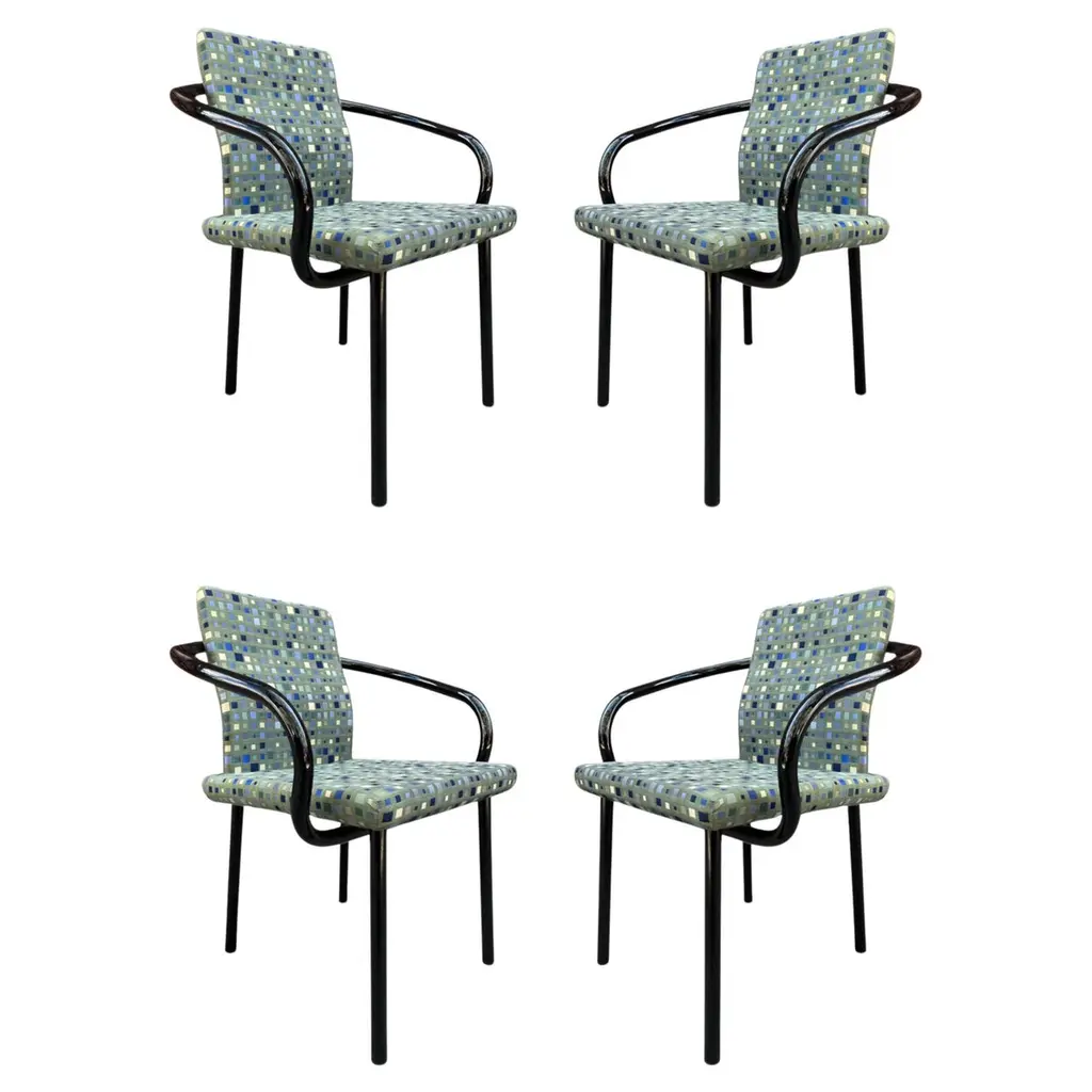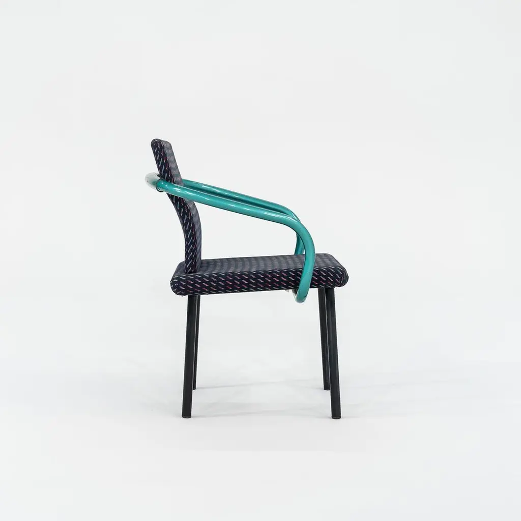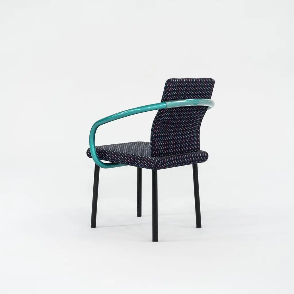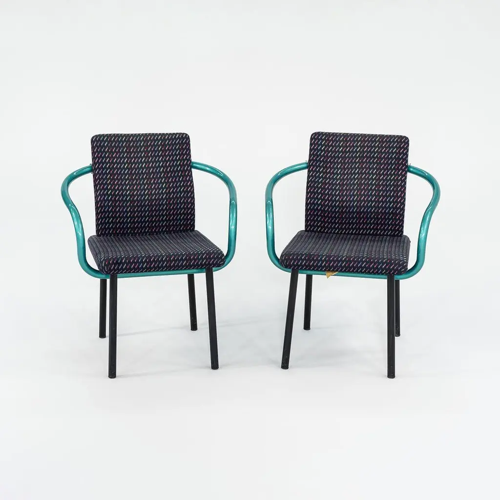 This is a Postmodern “Mandarin” armchair, initially designed by Ettore Sottsass for Knoll in 1986. These examples date to the 1990s, and the listed price includes one chair. We have three chairs available for purchase in this colorway. Their design features sculptural, tubular steel legs & arms, and has an upholstered seat & back. The upholstery is done in a geometrically patterned multi-colored fabric. These examples have glossy teal green enamel details. It’s all about the arms on these chairs... unmistakably Sottsass. Each chair measures 21 inches deep, 26 inches wide, and is 32 inches high. They have a seat height of 18 inches. Their enameled-steel arms and legs show some scuffs to the surface, leaving some rust, and the upholstery fabric shows very slight fading. Overall, these chairs are in solid vintage condition with some signs of use. Please see photos. Genuinely faulty goods will be replaced or money refunded on a case by case basis, however we must be advised of any faulty goods upon receipt of the item. It is the customer's responsibility to pay for return shipping and ship the item back to us. If the item is found to be faulty, we will also refund the postage cost. If there is no damage to the item, but a return is approved, the buyer will be responsible for both the initial and return shipping cost. It is at our discretion to refuse the refund of undamaged goods. If an order is placed and you would like to cancel the order, please notify us immediately. Any refunds will be processed via the same means that payment was made.