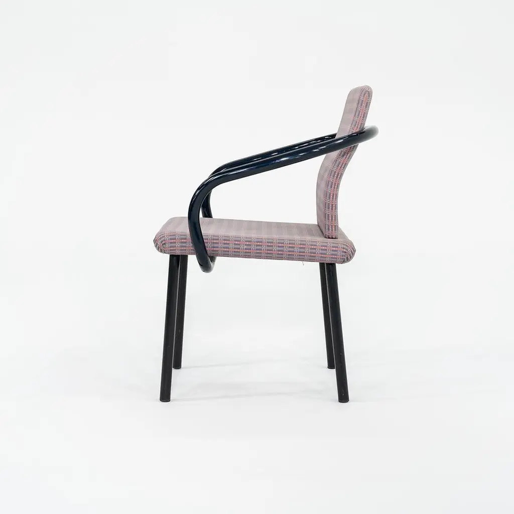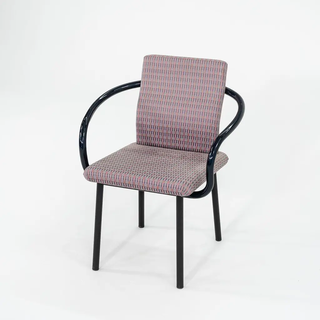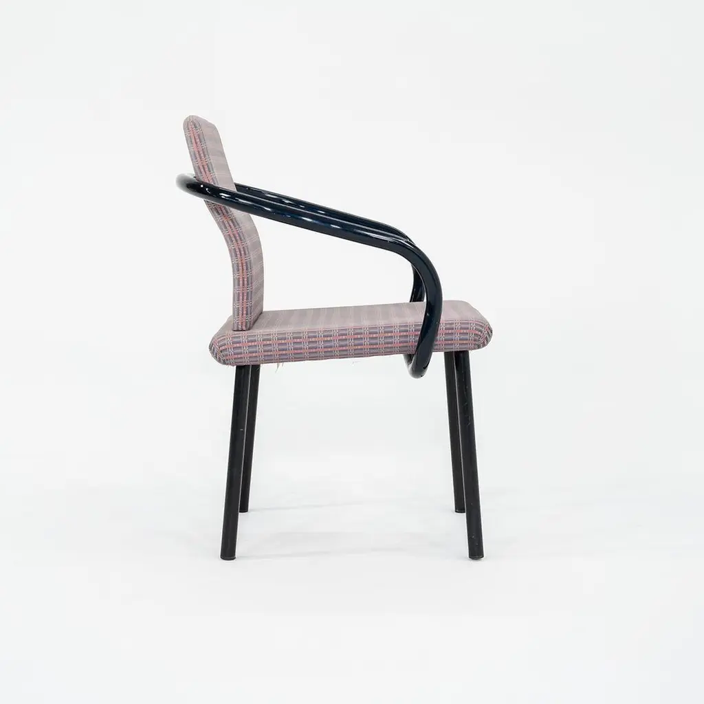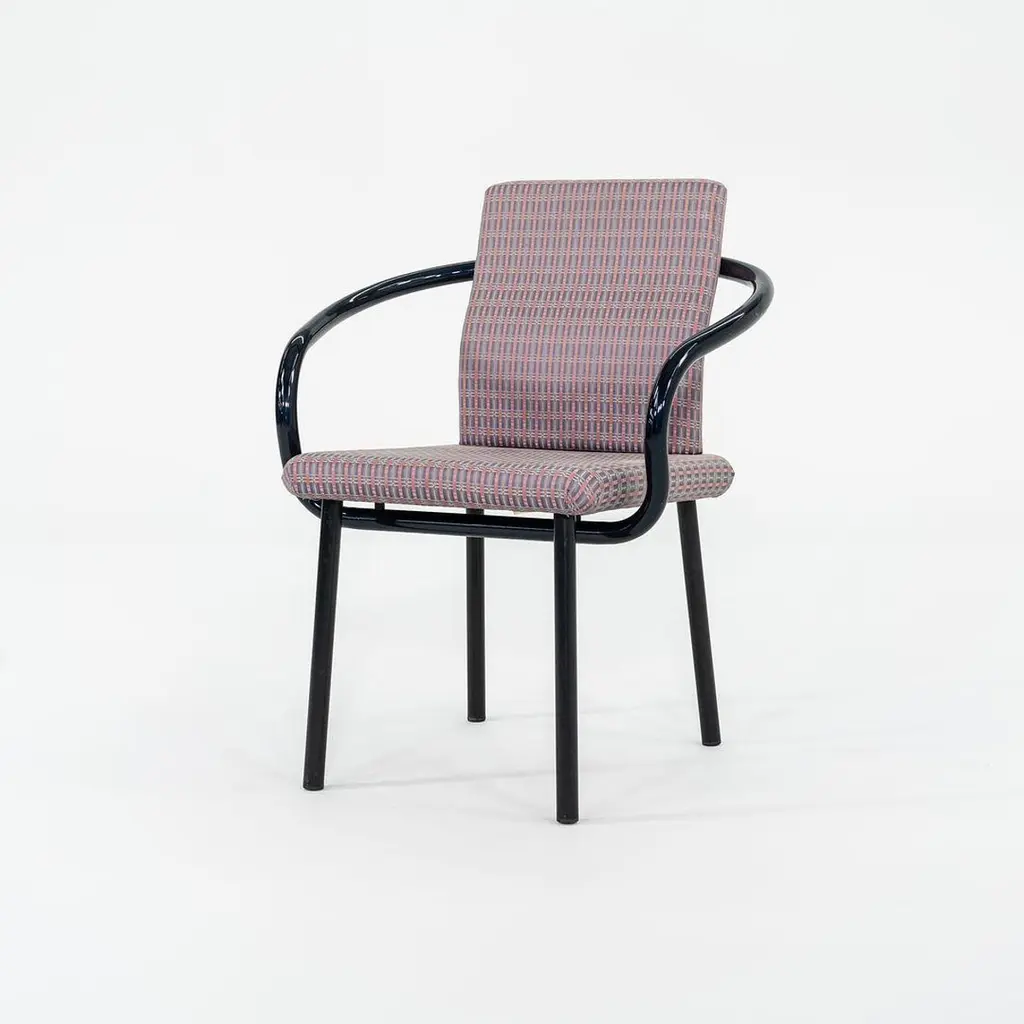 This is a set of eight Mandarin Chairs, designed by Ettore Sottsass and produced by Knoll in 1986. The listed price includes one chair, and we have eight available for purchase in this colorway. These examples show the production date of 1993. They have sculptural, black enameled-steel arms, and have an upholstered seat & back in a geometric patterned fabric. It’s all about the arms on these chairs... unmistakably Sottsass. Each chair measures 21 inches deep, 26 inches wide, and is 32 inches high. They have a seat height of 18 inches. Their enameled-steel arms show some scuffs to the surface, and the upholstery fabric shows very slight fading. Overall, these chairs are in solid vintage condition with some signs of use. Please see photos. Genuinely faulty goods will be replaced or money refunded on a case by case basis, however we must be advised of any faulty goods upon receipt of the item. It is the customer's responsibility to pay for return shipping and ship the item back to us. If the item is found to be faulty, we will also refund the postage cost. If there is no damage to the item, but a return is approved, the buyer will be responsible for both the initial and return shipping cost. It is at our discretion to refuse the refund of undamaged goods. If an order is placed and you would like to cancel the order, please notify us immediately. Any refunds will be processed via the same means that payment was made.
