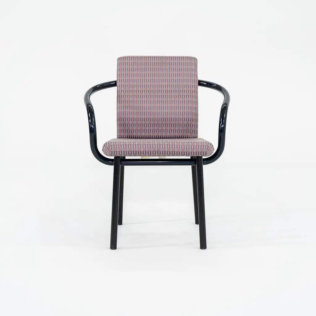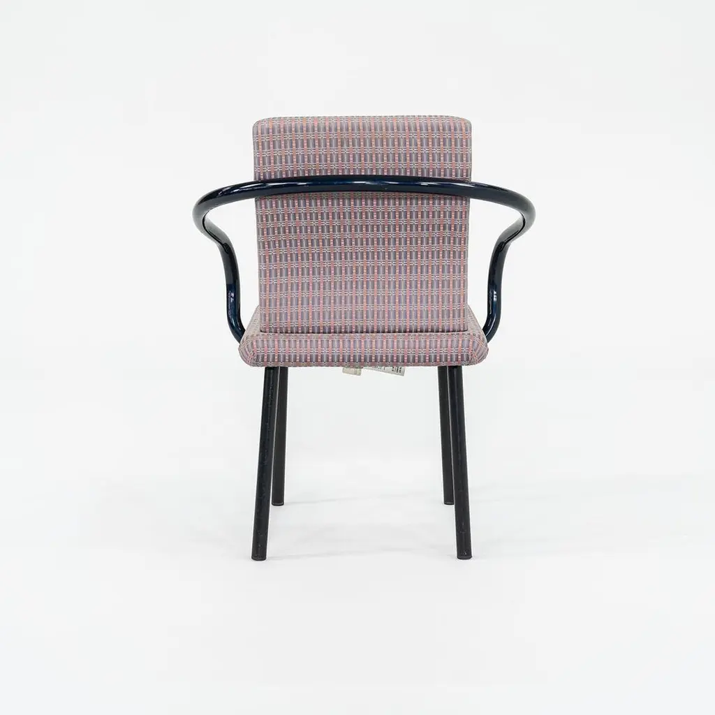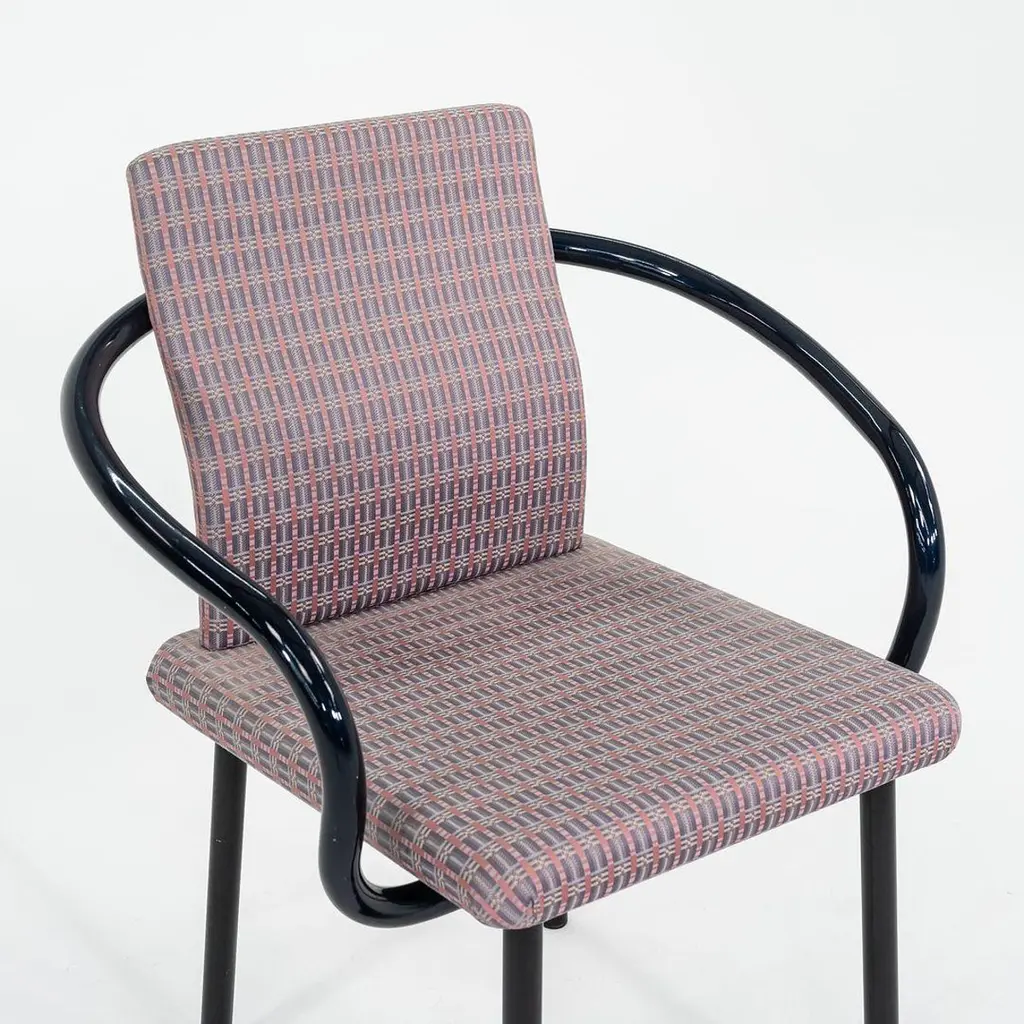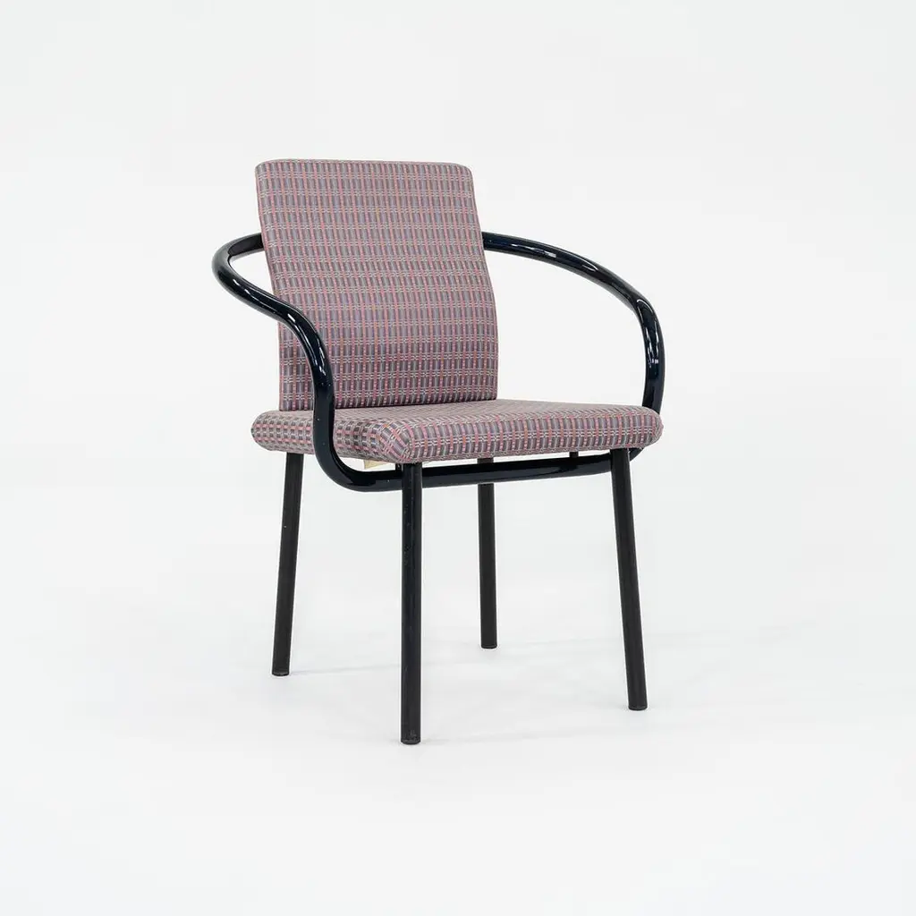 This is a set of eight Mandarin Chairs, designed by Ettore Sottsass and produced by Knoll in 1986. The listed price includes one chair, and we have eight available for purchase in this colorway. These examples show the production date of 1993. They have sculptural, black enameled-steel arms, and have an upholstered seat & back in a geometric patterned fabric. It’s all about the arms on these chairs... unmistakably Sottsass. Each chair measures 21 inches deep, 26 inches wide, and is 32 inches high. They have a seat height of 18 inches. Their enameled-steel arms show some scuffs to the surface, and the upholstery fabric shows very slight fading. Overall, these chairs are in solid vintage condition with some signs of use. Please see photos. Genuinely faulty goods will be replaced or money refunded on a case by case basis, however we must be advised of any faulty goods upon receipt of the item. It is the customer's responsibility to pay for return shipping and ship the item back to us. If the item is found to be faulty, we will also refund the postage cost. If there is no damage to the item, but a return is approved, the buyer will be responsible for both the initial and return shipping cost. It is at our discretion to refuse the refund of undamaged goods. If an order is placed and you would like to cancel the order, please notify us immediately. Any refunds will be processed via the same means that payment was made.