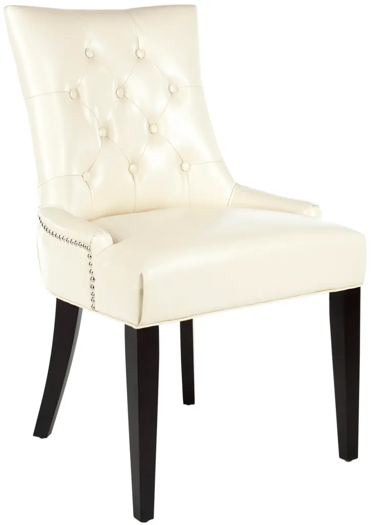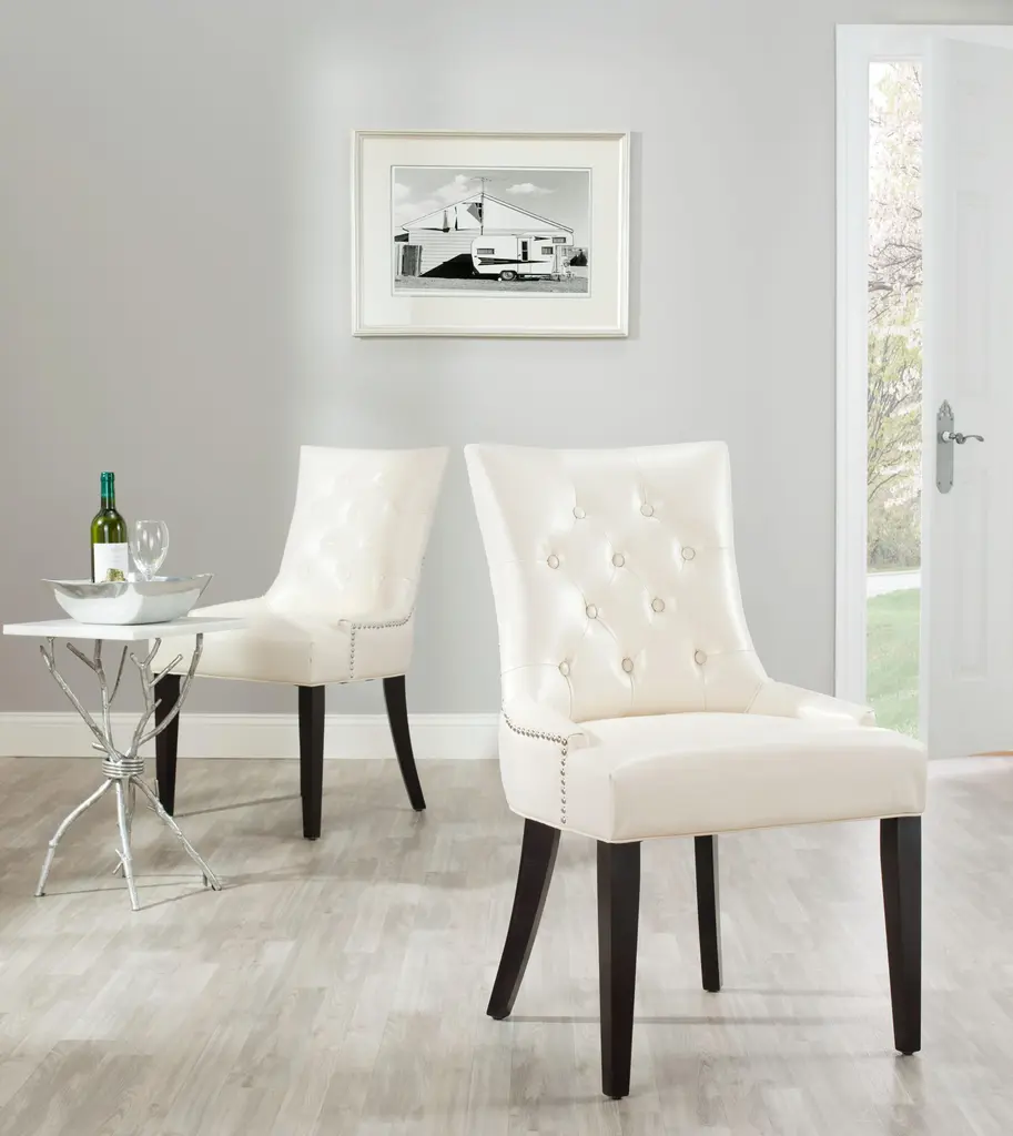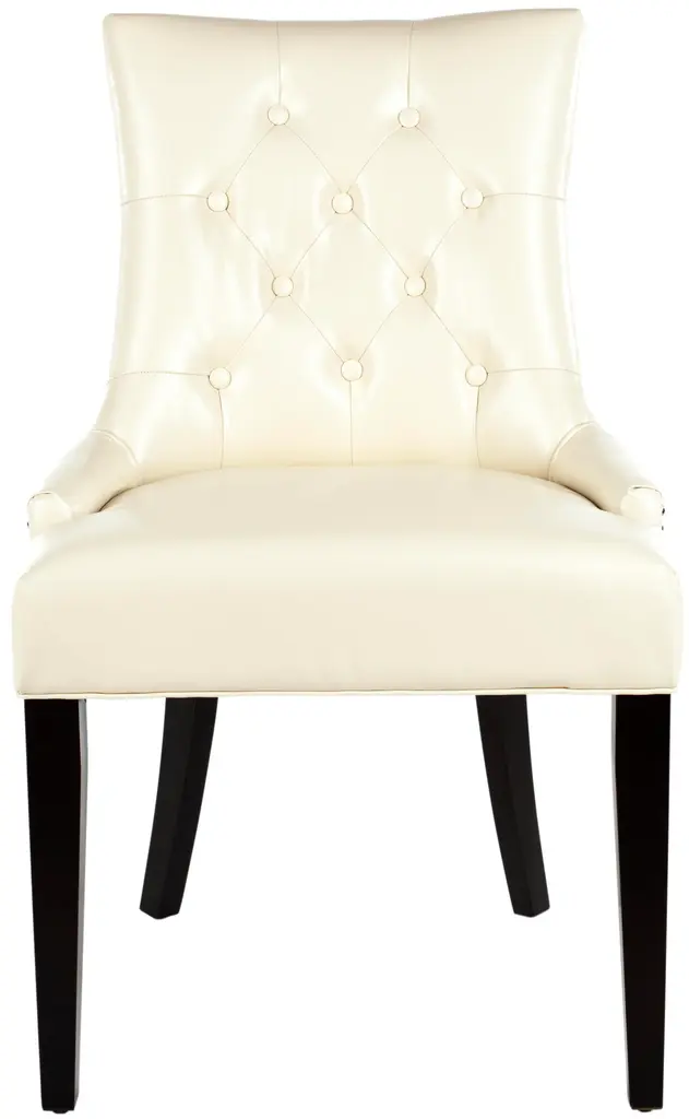 It’s a Deco darling. The Side Chairs bring chic, modern style to the dining room. Their lush flat cream bicast leather upholstery highlights it's curvaceous figure white it's sleek birch wood legs with espresso finish add just the right amount of Park Avenue style. Although Leather is one of the most durable upholstery materials, proper care is vital to maintain it's appearance and performance. Dust weekly using a soft, clean cloth slightly dampened with distilled water. Blot spills immediately with a soft, clean absorbent dry cloth. Some assembly required.