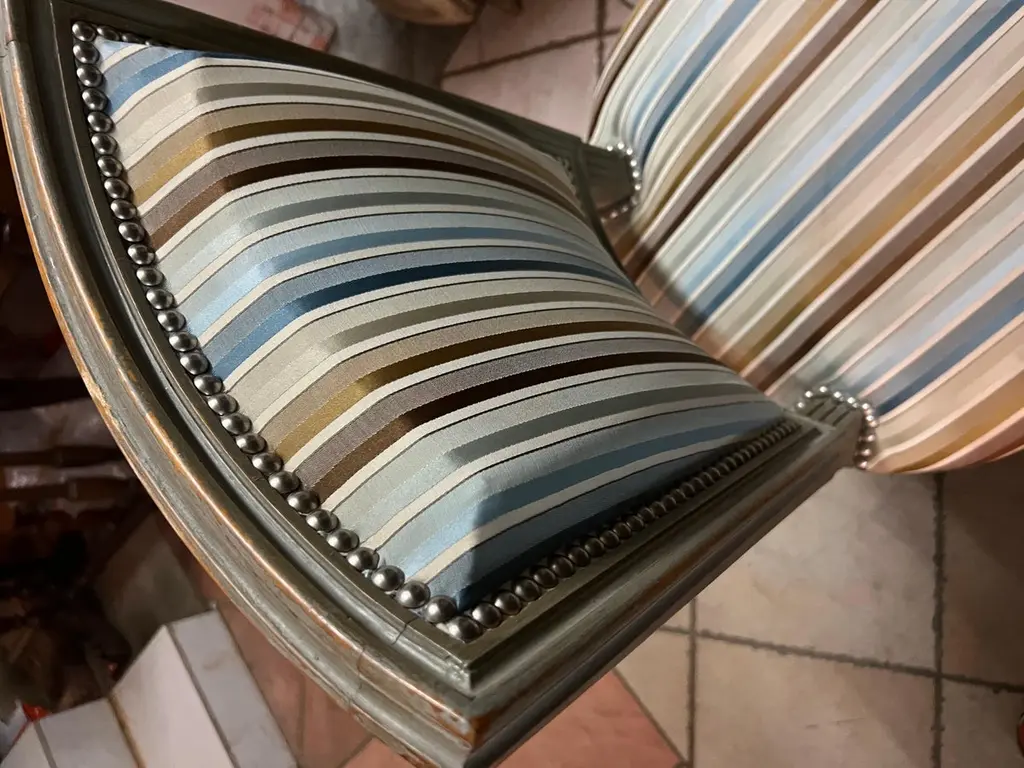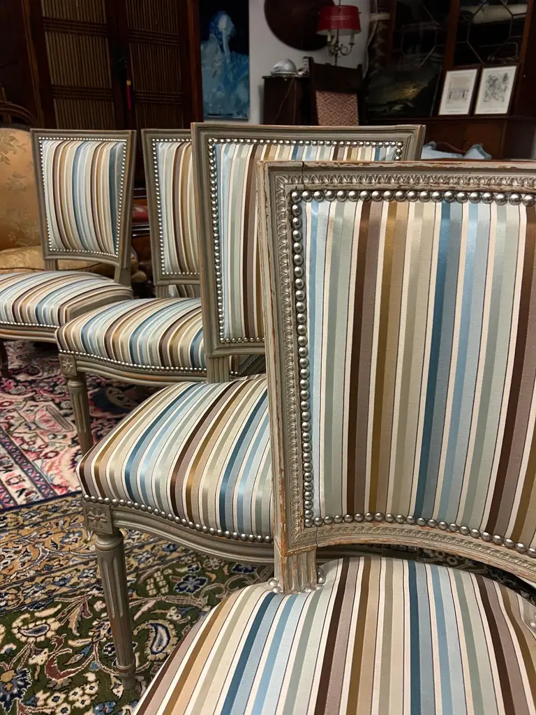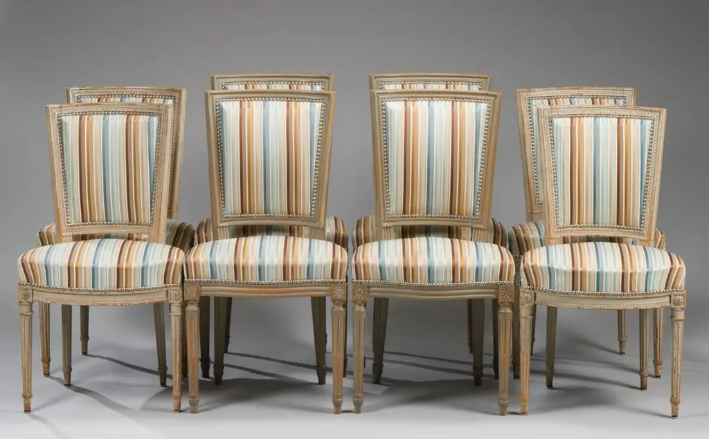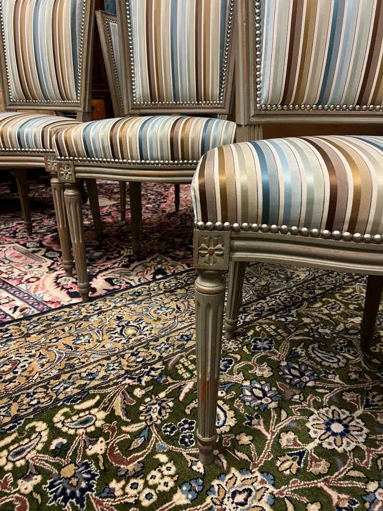 19th Century French eight hand carved dining chairs in Louis XVI style. All the chairs are in very good authentic condition and still wearing original silk upholstery.France, circa 1880
