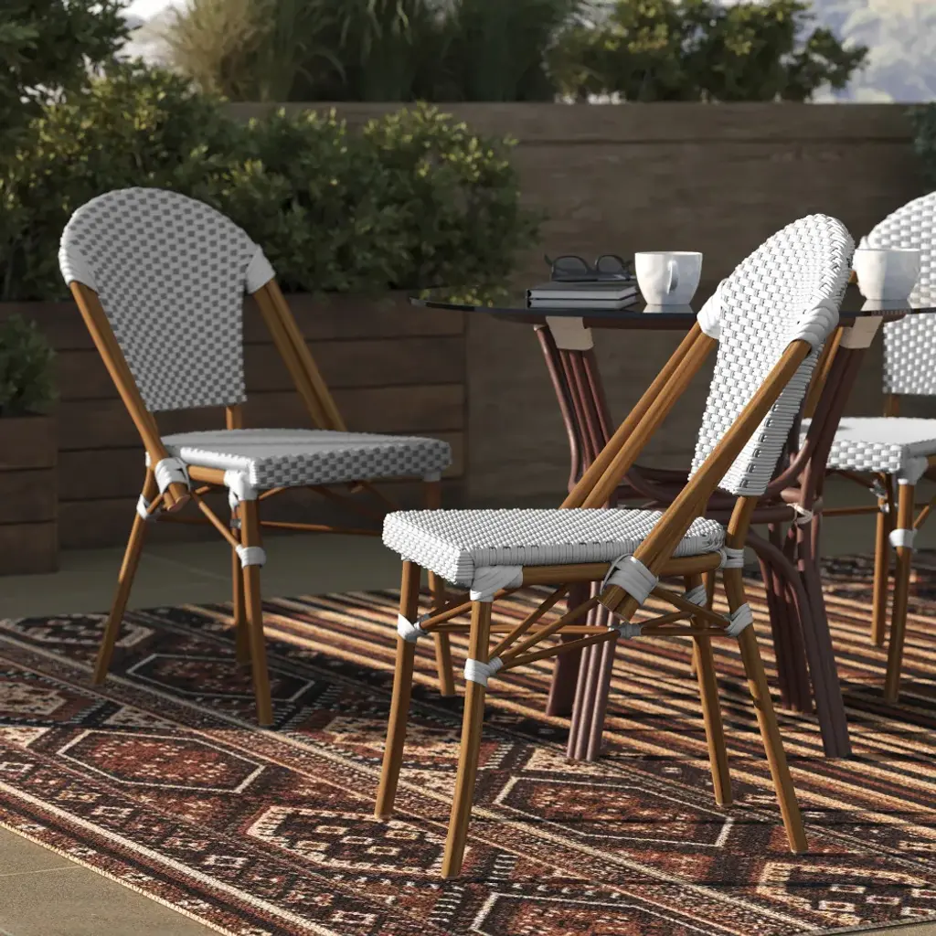 Handwoven beauty for any space epitomizes the look and feel of this set of 2 indoor/outdoor bistro style chairs. Fade and weather resistant PE rattan backs and seats in a gorgeous checkered pattern will instantly elevate your patio, veranda, sunroom and more. Sturdy metal frames ensure worry-free seating ideal for entertaining. Pair these chairs with almost any dining table for an upgraded look in your dining room or kitchen.Indoor/Outdoor Stackable Bistro Chairs, Set of 2Fade Resistant PE Rattan Seat and BackPowder Coated Metal Frames with Protective GlidesWeather & Rust Resistant Materials400 lbs. Static Weight CapacityLightweight Design with Recommended Stack Height up to 5 ChairsWipe Clean with a Damp ClothNo Assembly Required