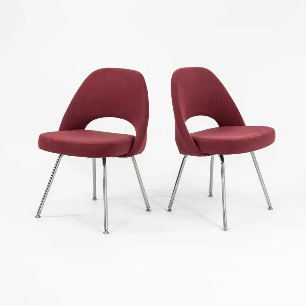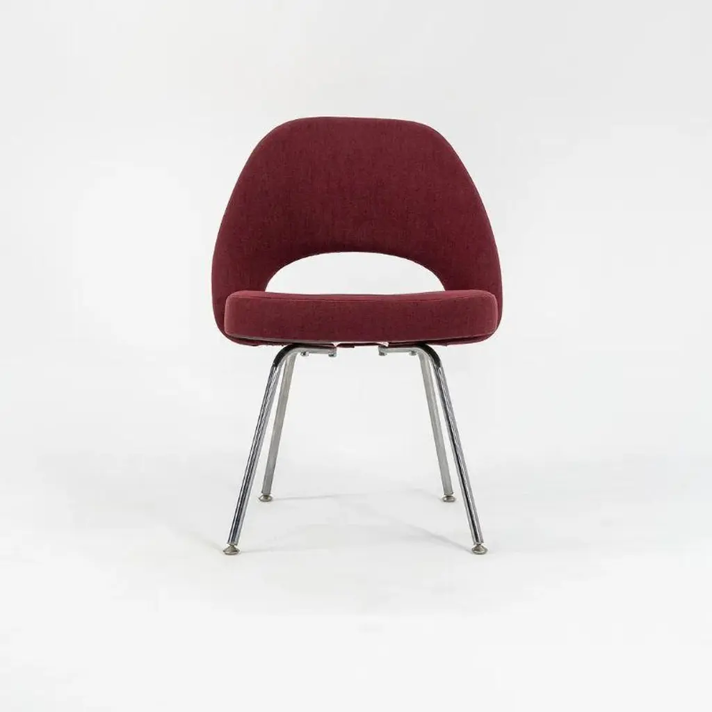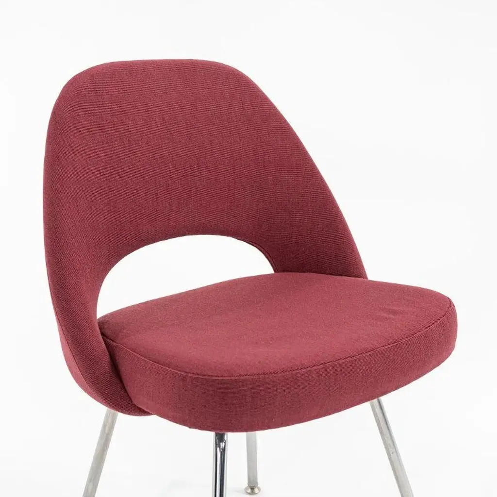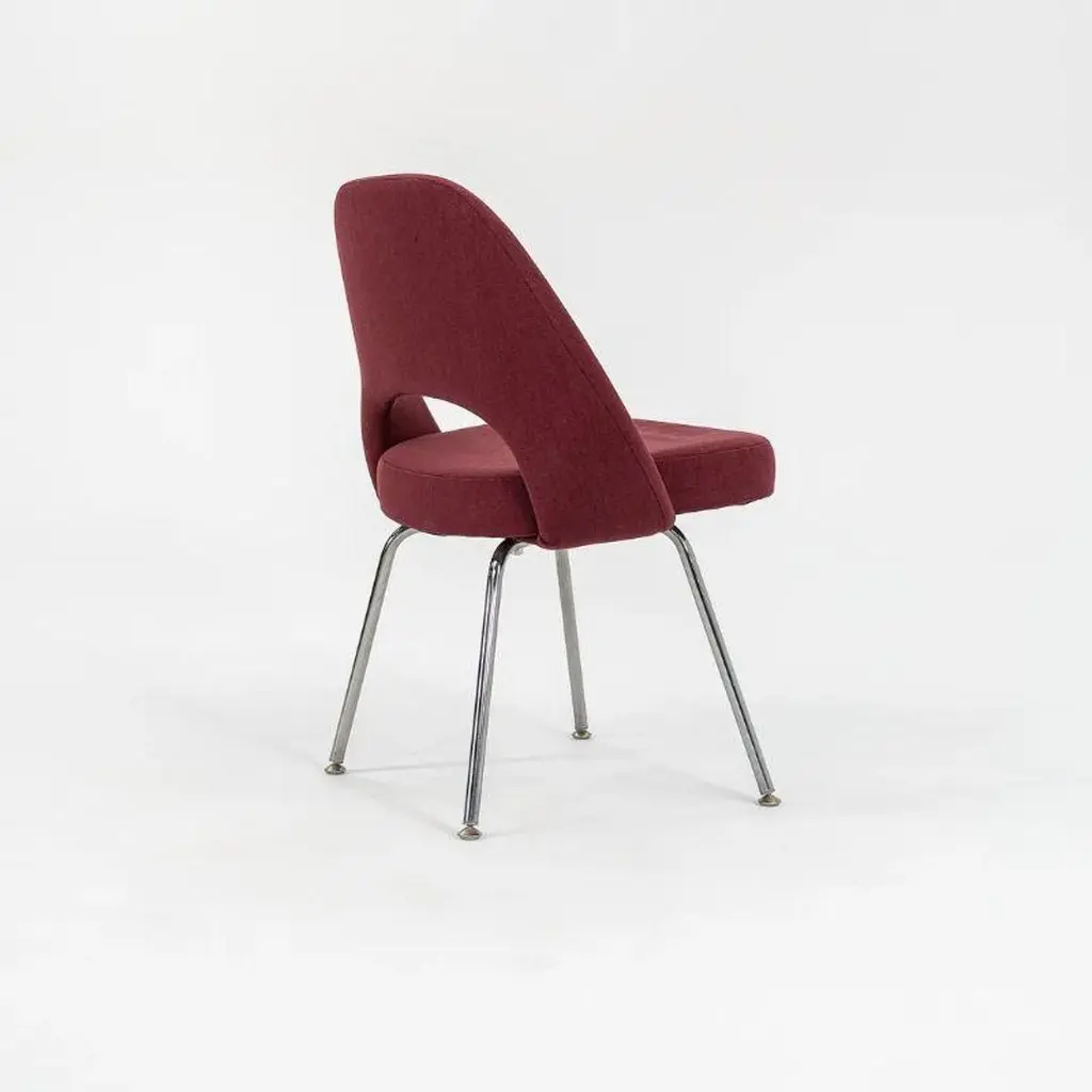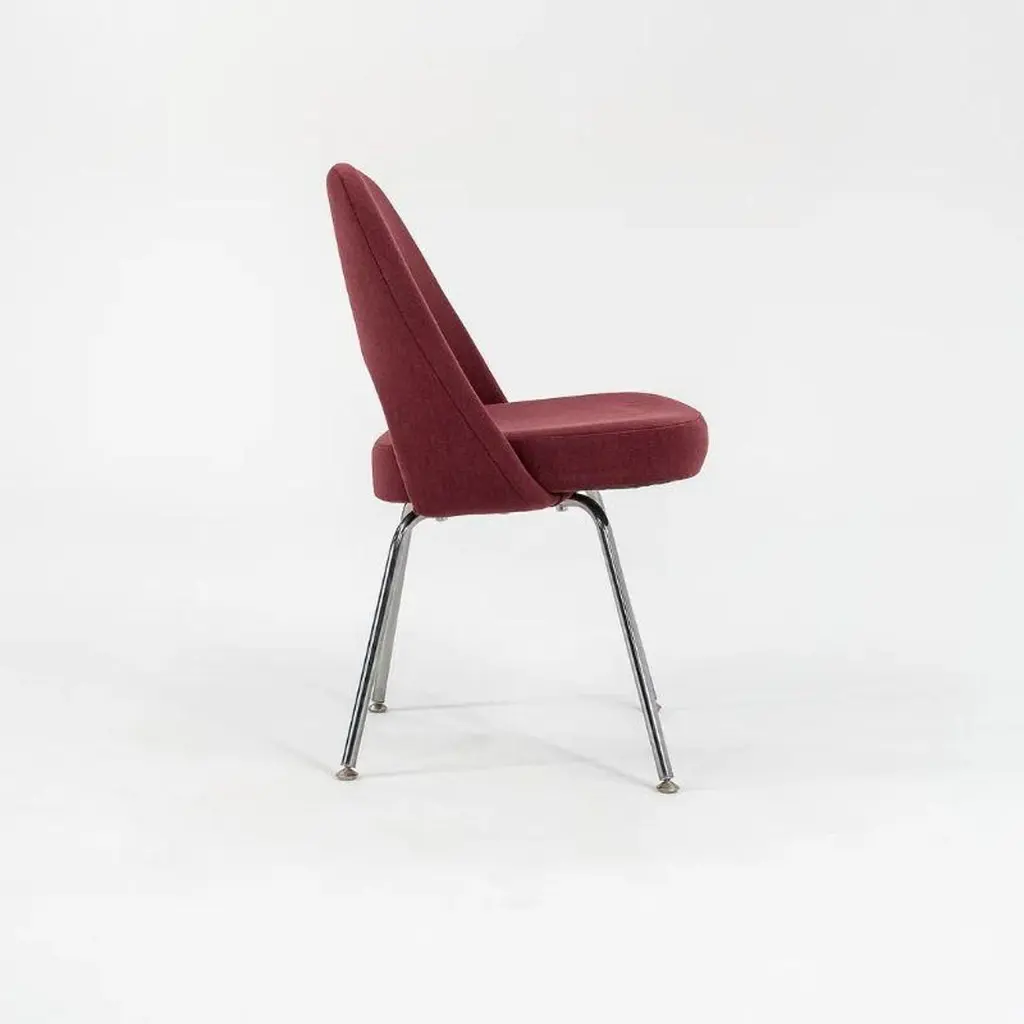 This is a Saarinen Executive Armless Side Chair, Model 72C, designed in 1950 by Eero Saarinen and produced by Knoll. These particular examples were produced in 2003. The listed price includes one side chair, and we have several chairs available for individual purchase. Their design features chromed-steel tubular legs, and has an upholstered seat and back. Each chair measures 20.5 inches long, 22.5 inches wide, and 31.5 inches high. Their seat height is 18.75 inches. There is minor light scratching apparent on the polished steel bases. The original bordeaux fabric is in good condition with slight signs of fading and some pulls. Overall, these chairs are in good condition with light wear from use. Please see photos.