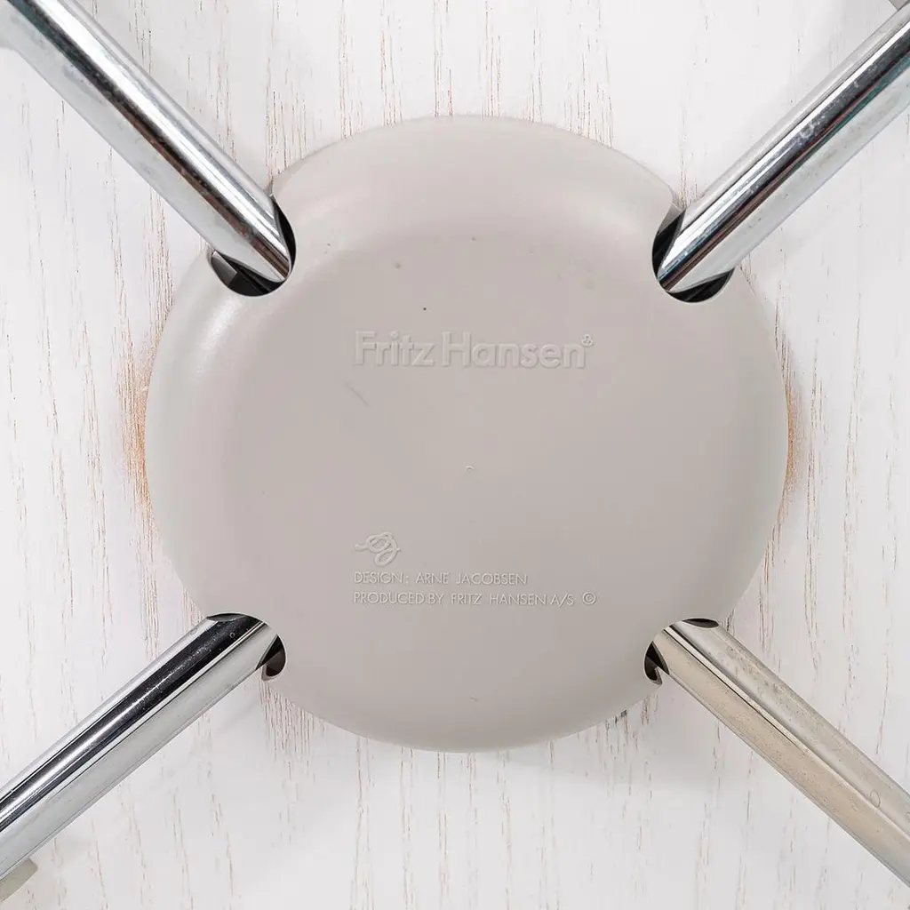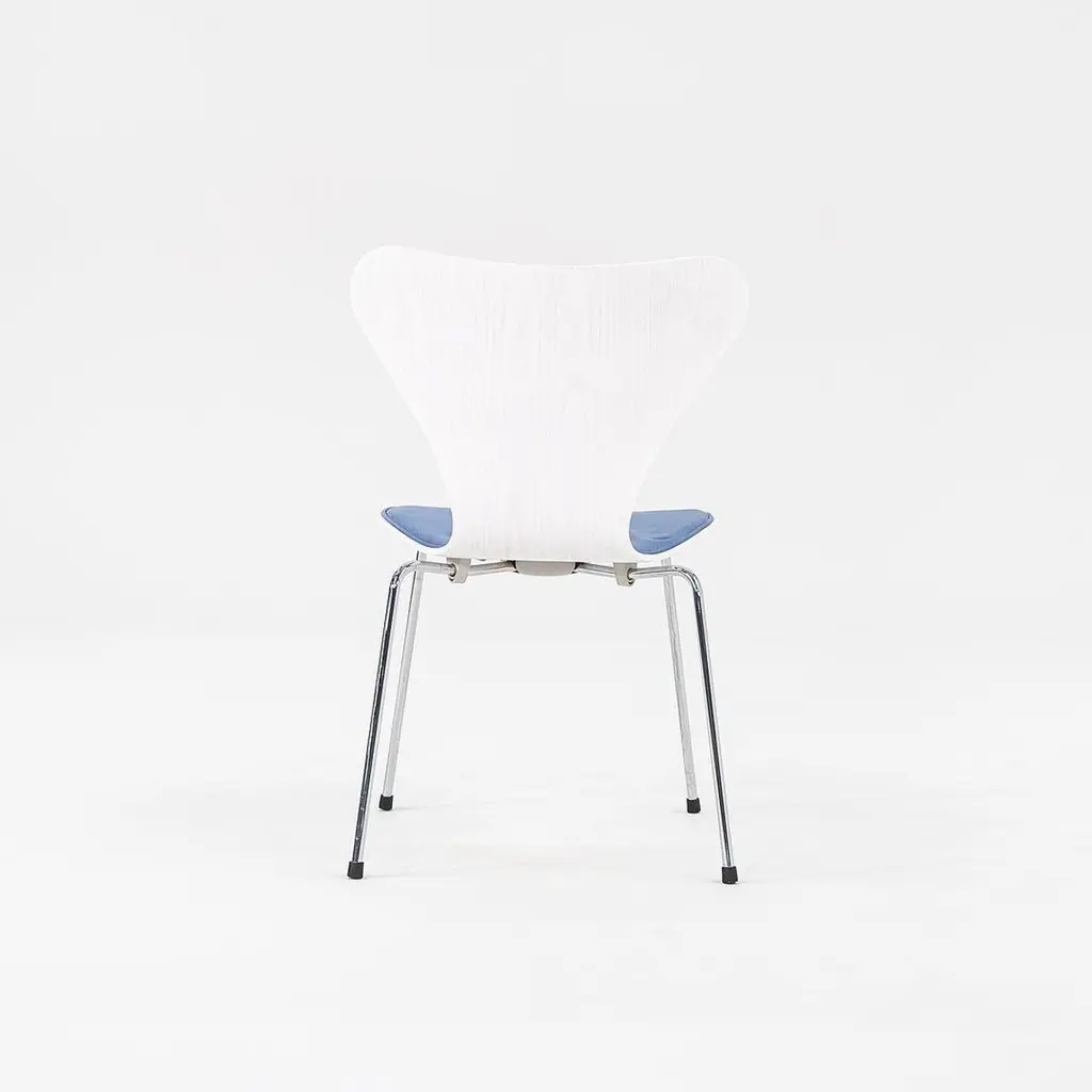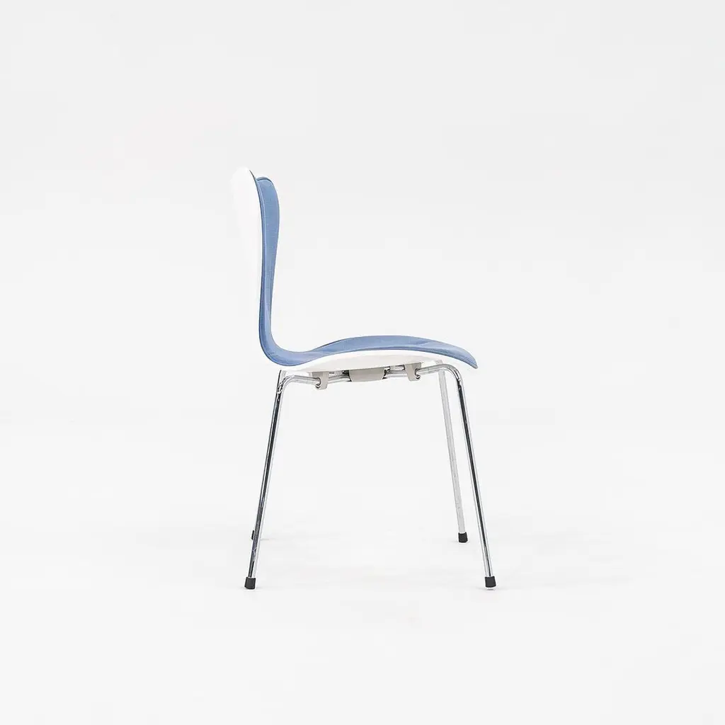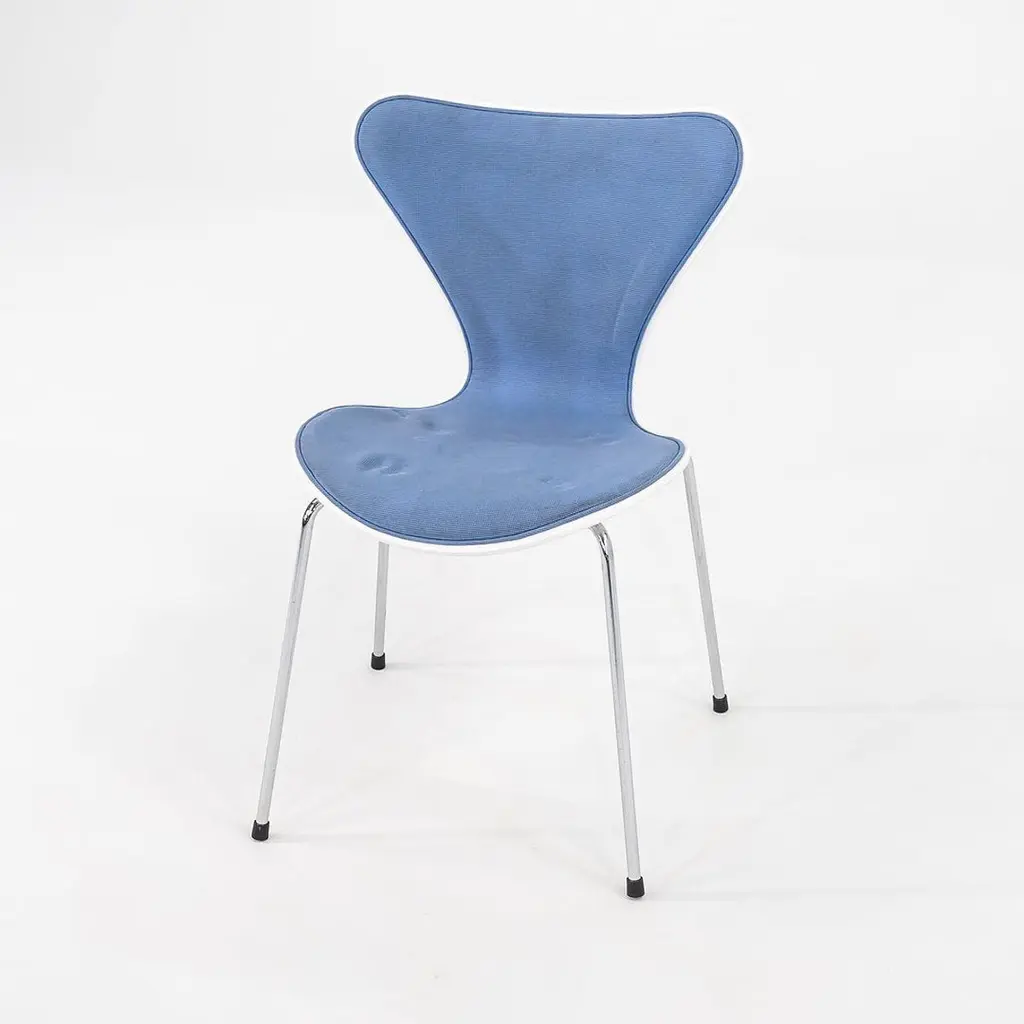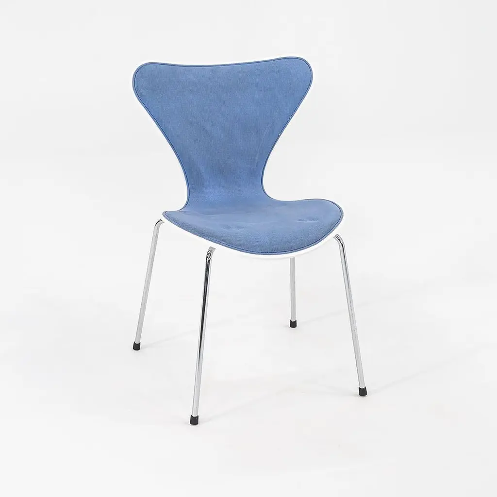 This is a series 7 stacking side chair, Model 3107, initially designed by Arne Jacobsen for Fritz Hansen in 1955. These examples date to 2005.The listed price includes one chair and we have several available for sale. Their design features a tubular steel frame with a chrome-plated finish, and has a pressure-molded sliced veneer shell of White Beech. They are currently upholstered in a blue fabric. Each chair is 20.5 inches long, 20 inches wide, and 32 inches tall. They have a seat height of 18 inches. The chairs are in solid shape, and are excellent candidates for new upholstery or can be used as/is. A steam clean may also perk up the fabric, which we can arrange prior to shipping if desired. There are some scuffs and scratches on the steel bases, and some spots on the seats. Overall, these chairs are in good condition with use apparent. Please see photos. Genuinely faulty goods will be replaced or money refunded on a case by case basis, however we must be advised of any faulty goods upon receipt of the item. It is the customer's responsibility to pay for return shipping and ship the item back to us. If the item is found to be faulty, we will also refund the postage cost. If there is no damage to the item, but a return is approved, the buyer will be responsible for both the initial and return shipping cost. It is at our discretion to refuse the refund of undamaged goods. If an order is placed and you would like to cancel the order, please notify us immediately. Any refunds will be processed via the same means that payment was made.