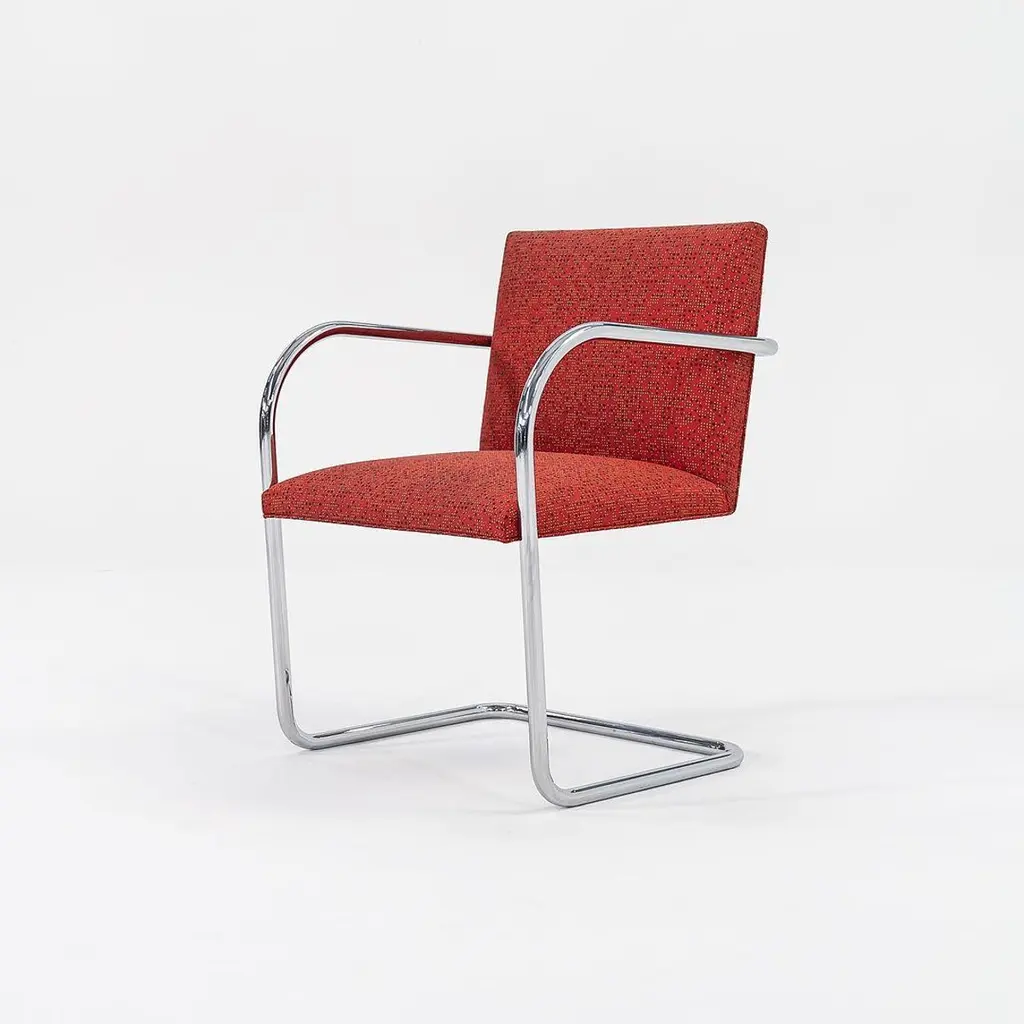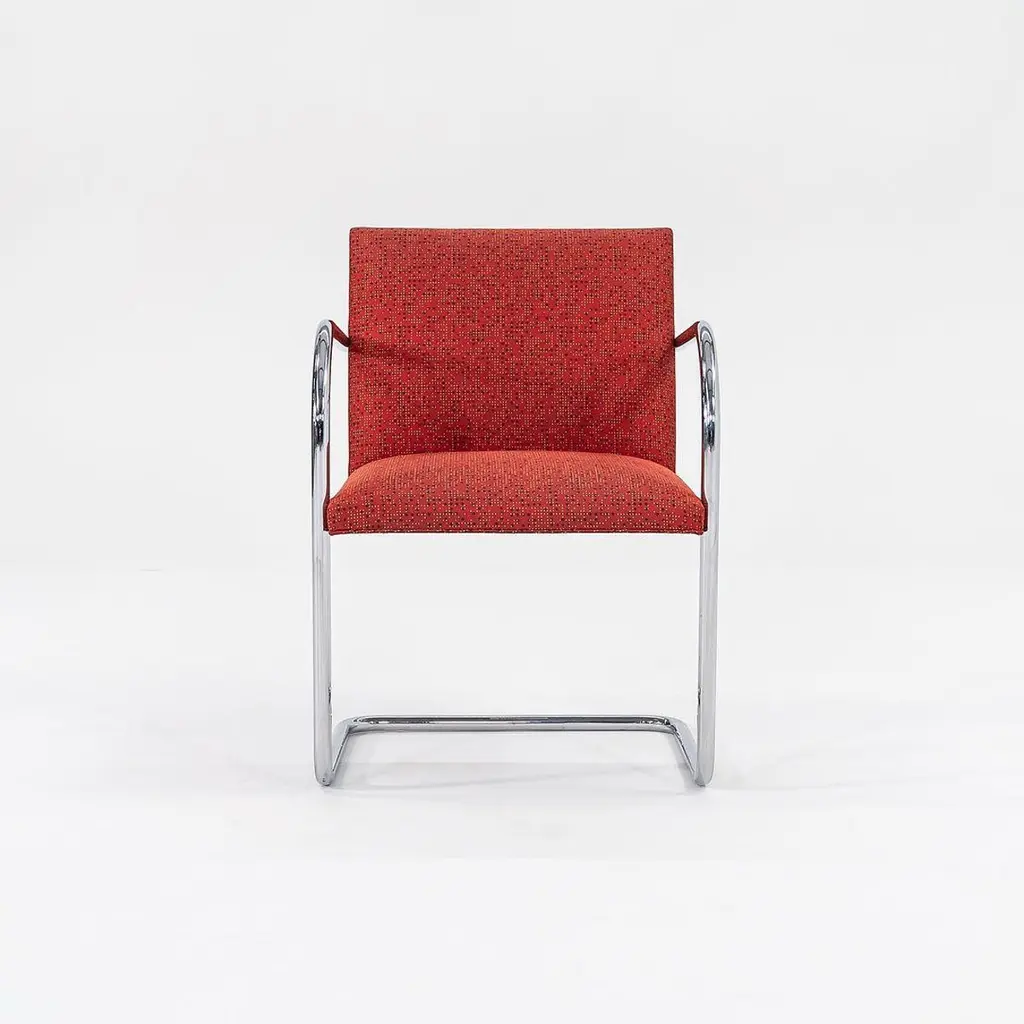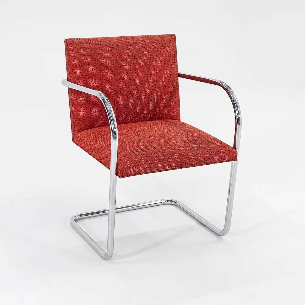 This is a Brno Tubular-Steel Armchair, Model 245, originally designed by Mies van der Rohe in 1930. The listed price includes one chair, and we have several chairs available for purchase. These particular chairs were produced by Knoll in the USA circa 2007. Their design features a tubular nickel-plated steel cantilever frame, and they have patterned red fabric upholstery. Each chair measures 22.5 inches long, 22.75 inches wide, and 31.5 inches high. They have a seat height of 17.25 inches. There is some light wear from use to the frames and upholstery. Please see photos. Genuinely faulty goods will be replaced or money refunded on a case by case basis, however we must be advised of any faulty goods upon receipt of the item. It is the customer's responsibility to pay for return shipping and ship the item back to us. If the item is found to be faulty, we will also refund the postage cost. If there is no damage to the item, but a return is approved, the buyer will be responsible for both the initial and return shipping cost. It is at our discretion to refuse the refund of undamaged goods. If an order is placed and you would like to cancel the order, please notify us immediately. Any refunds will be processed via the same means that payment was made.