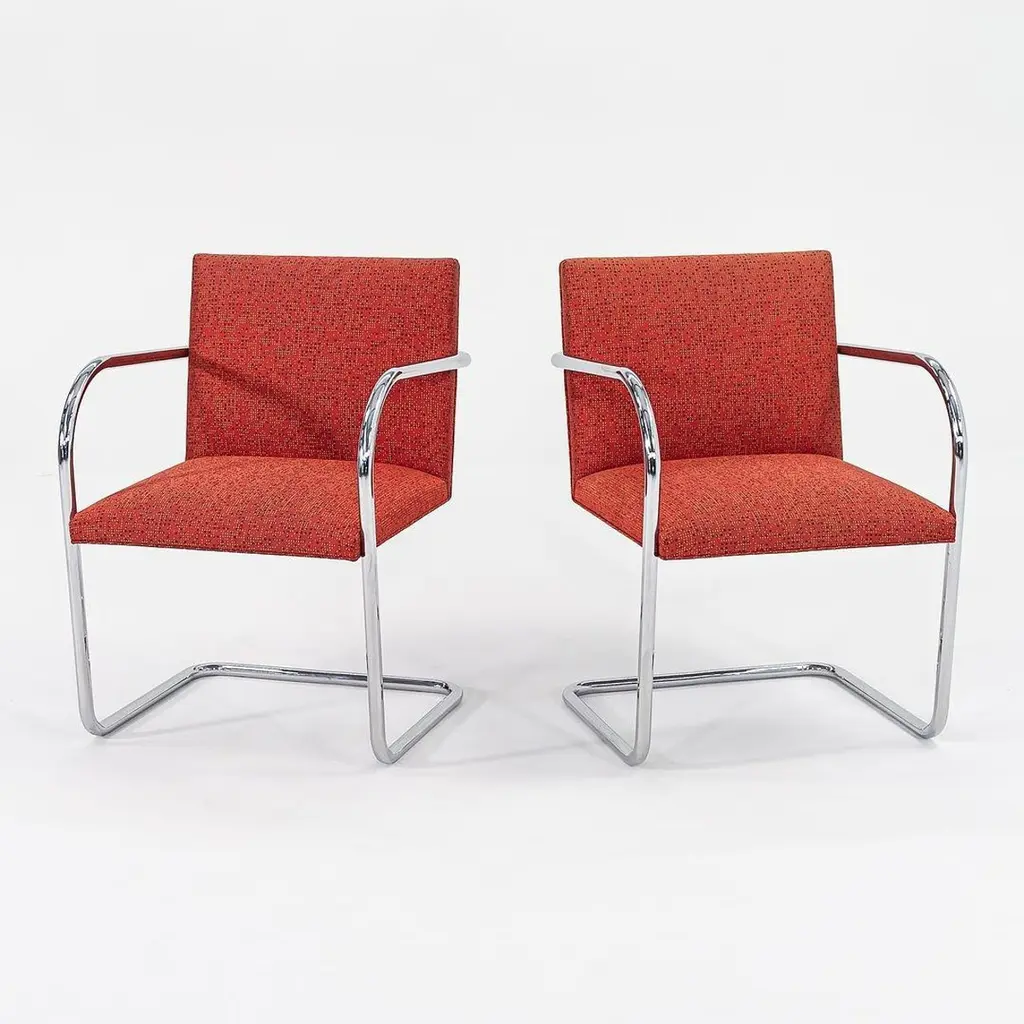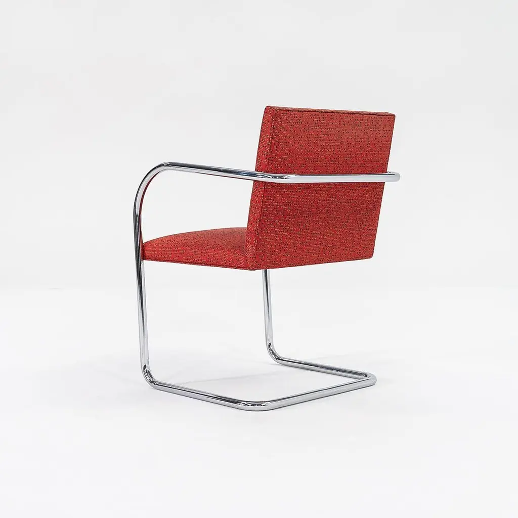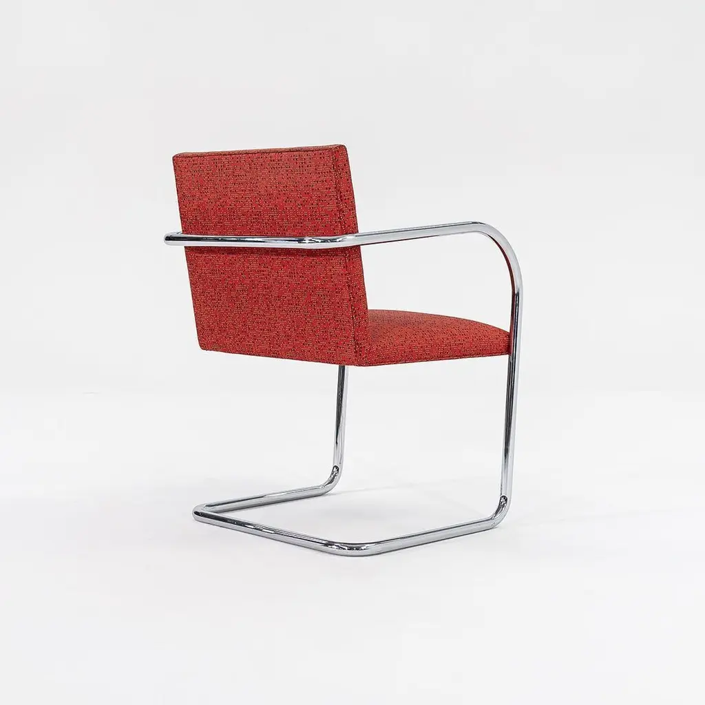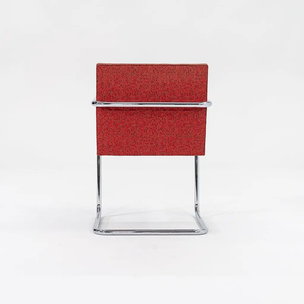 This is a Brno Tubular-Steel Armchair, Model 245, originally designed by Mies van der Rohe in 1930. The listed price includes one chair, and we have several chairs available for purchase. These particular chairs were produced by Knoll in the USA circa 2007. Their design features a tubular nickel-plated steel cantilever frame, and they have patterned red fabric upholstery. Each chair measures 22.5 inches long, 22.75 inches wide, and 31.5 inches high. They have a seat height of 17.25 inches. There is some light wear from use to the frames and upholstery. Please see photos. Genuinely faulty goods will be replaced or money refunded on a case by case basis, however we must be advised of any faulty goods upon receipt of the item. It is the customer's responsibility to pay for return shipping and ship the item back to us. If the item is found to be faulty, we will also refund the postage cost. If there is no damage to the item, but a return is approved, the buyer will be responsible for both the initial and return shipping cost. It is at our discretion to refuse the refund of undamaged goods. If an order is placed and you would like to cancel the order, please notify us immediately. Any refunds will be processed via the same means that payment was made.