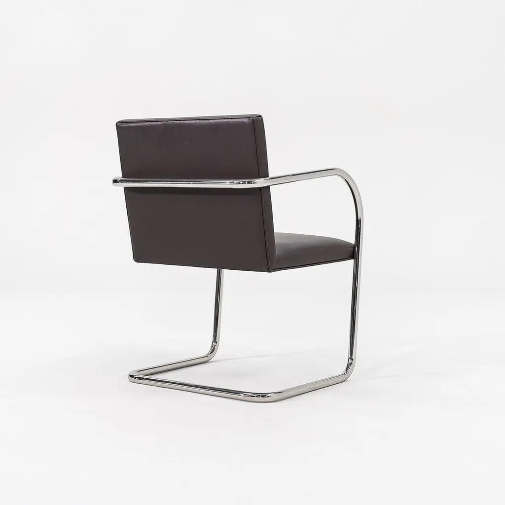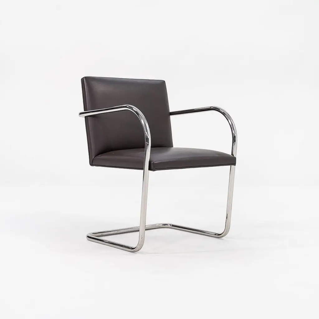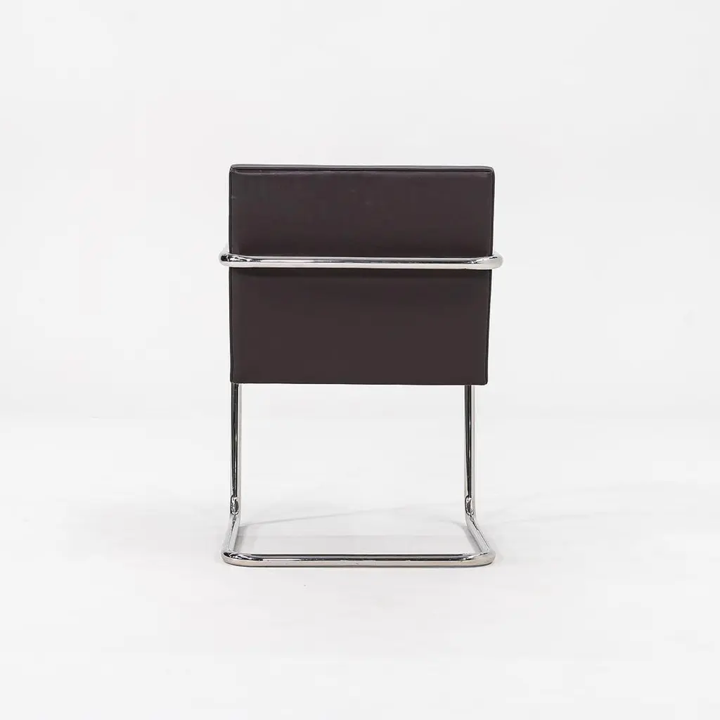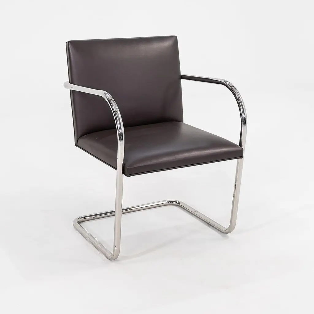 This is a Brno Tubular-Steel Armchair, Model 245, originally designed by Mies van der Rohe in 1930. The listed price includes one chair, and we have several chairs available for purchase. These particular chairs were produced by Knoll in the USA in the 2010s. Their design features a tubular nickel-plated steel cantilever frame, and they have chocolate brown leather upholstery. The chairs came from a hedge fund office in Manhattan. Each chair measures 22.5 inches long, 22.75 inches wide, and 31.5 inches high. They have a seat height of 17.25 inches. There is some patina on the cantilever bases, and there are some small spots on the leather. Overall, these pieces are in very good condition with light wear. Please see photos. Genuinely faulty goods will be replaced or money refunded on a case by case basis, however we must be advised of any faulty goods upon receipt of the item. It is the customer's responsibility to pay for return shipping and ship the item back to us. If the item is found to be faulty, we will also refund the postage cost. If there is no damage to the item, but a return is approved, the buyer will be responsible for both the initial and return shipping cost. It is at our discretion to refuse the refund of undamaged goods. If an order is placed and you would like to cancel the order, please notify us immediately. Any refunds will be processed via the same means that payment was made.