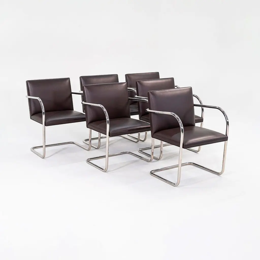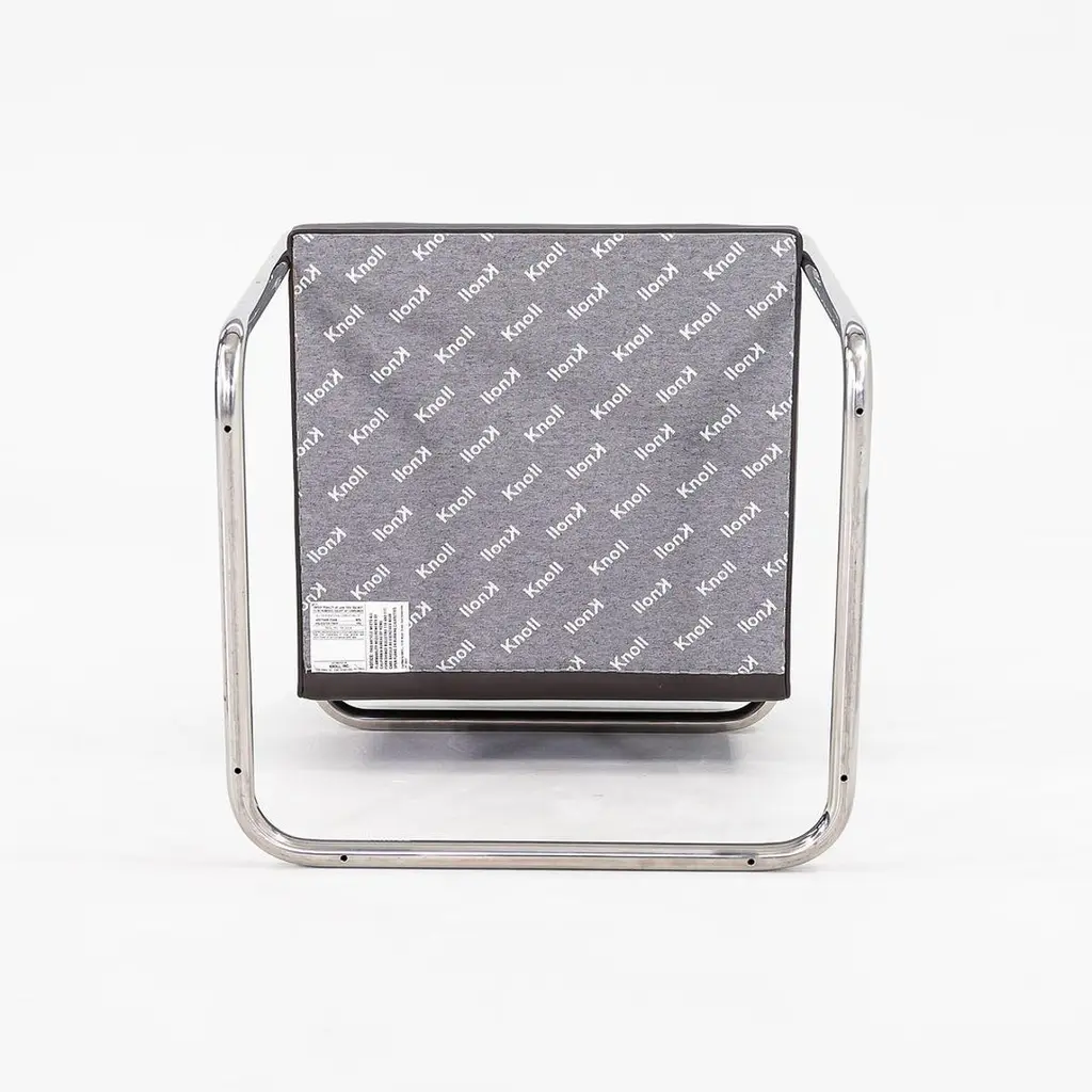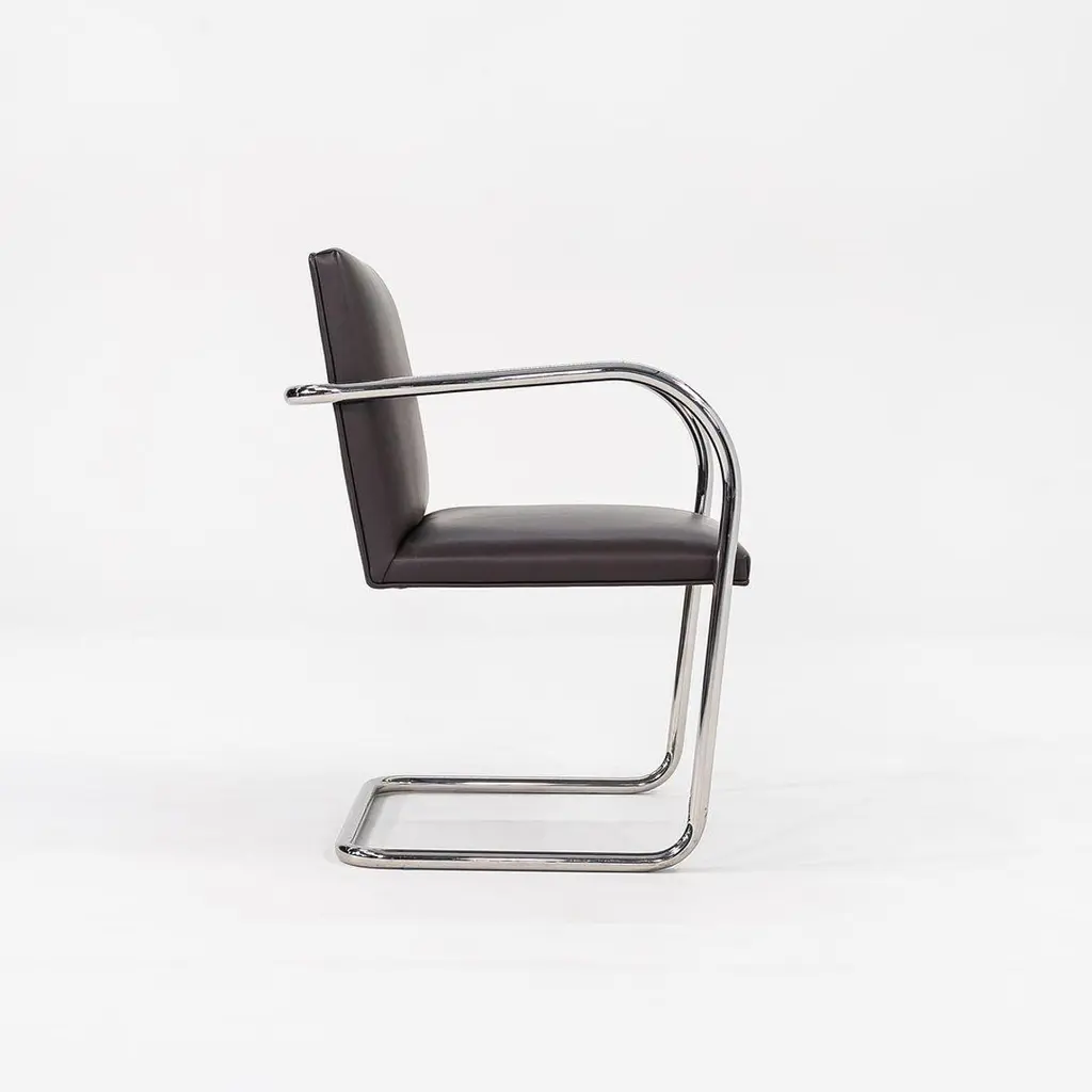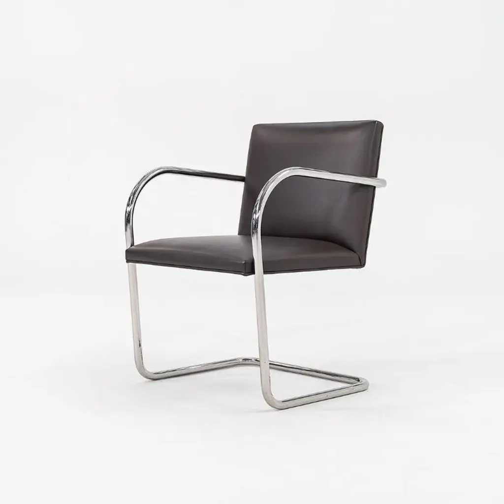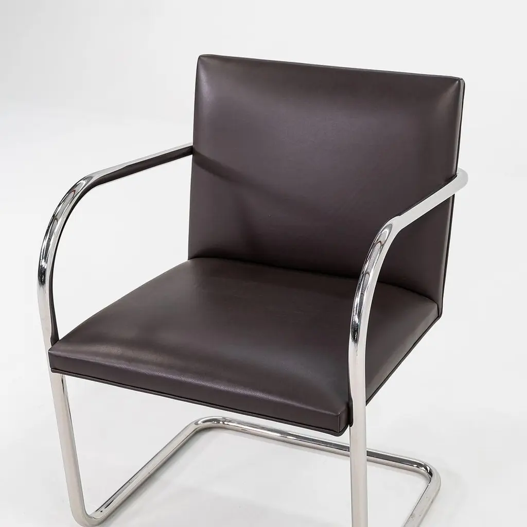 This is a Brno Tubular-Steel Armchair, Model 245, originally designed by Mies van der Rohe in 1930. The listed price includes one chair, and we have several chairs available for purchase. These particular chairs were produced by Knoll in the USA in the 2010s. Their design features a tubular nickel-plated steel cantilever frame, and they have chocolate brown leather upholstery. The chairs came from a hedge fund office in Manhattan. Each chair measures 22.5 inches long, 22.75 inches wide, and 31.5 inches high. They have a seat height of 17.25 inches. There is some patina on the cantilever bases, and there are some small spots on the leather. Overall, these pieces are in very good condition with light wear. Please see photos. Genuinely faulty goods will be replaced or money refunded on a case by case basis, however we must be advised of any faulty goods upon receipt of the item. It is the customer's responsibility to pay for return shipping and ship the item back to us. If the item is found to be faulty, we will also refund the postage cost. If there is no damage to the item, but a return is approved, the buyer will be responsible for both the initial and return shipping cost. It is at our discretion to refuse the refund of undamaged goods. If an order is placed and you would like to cancel the order, please notify us immediately. Any refunds will be processed via the same means that payment was made.