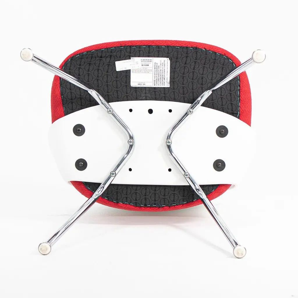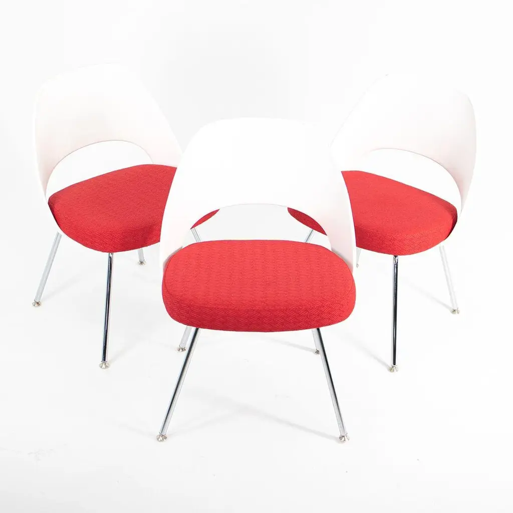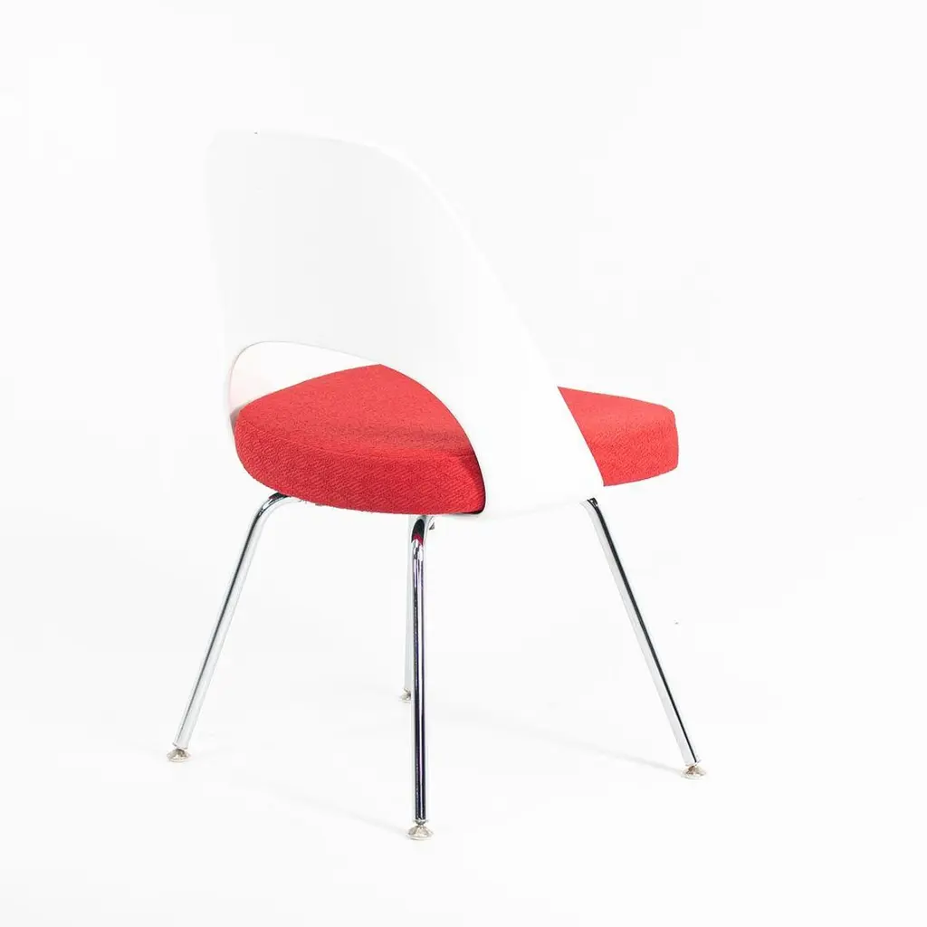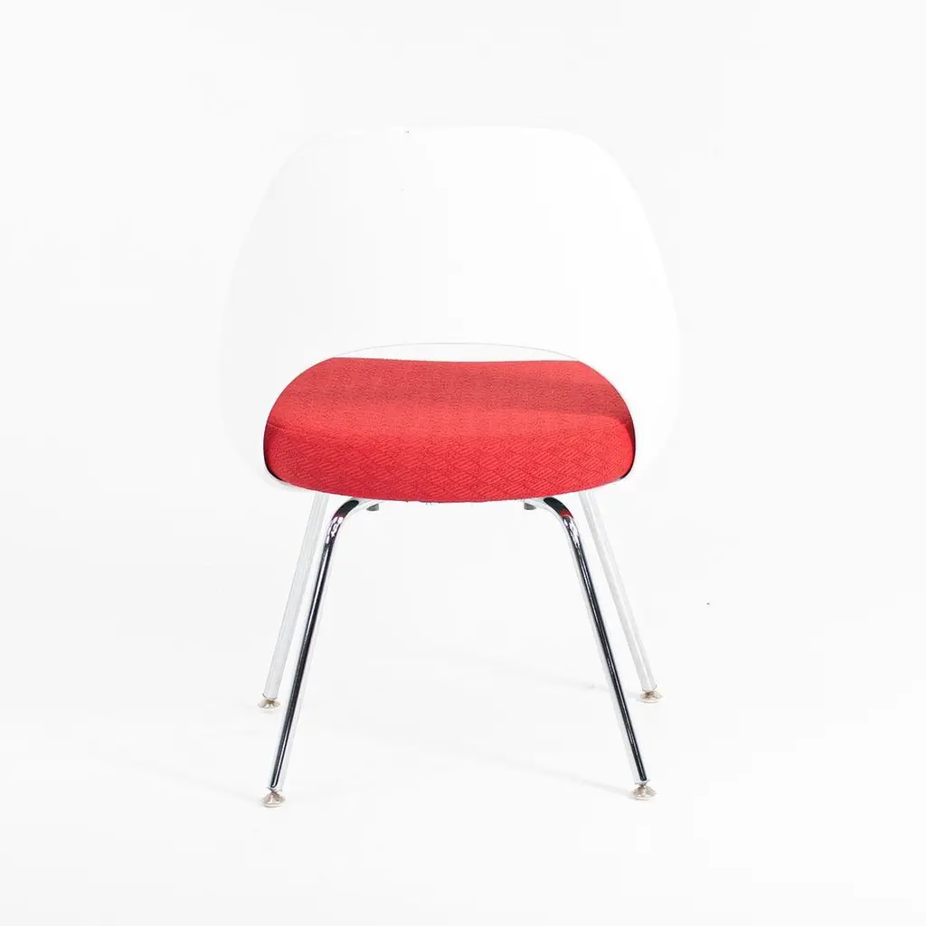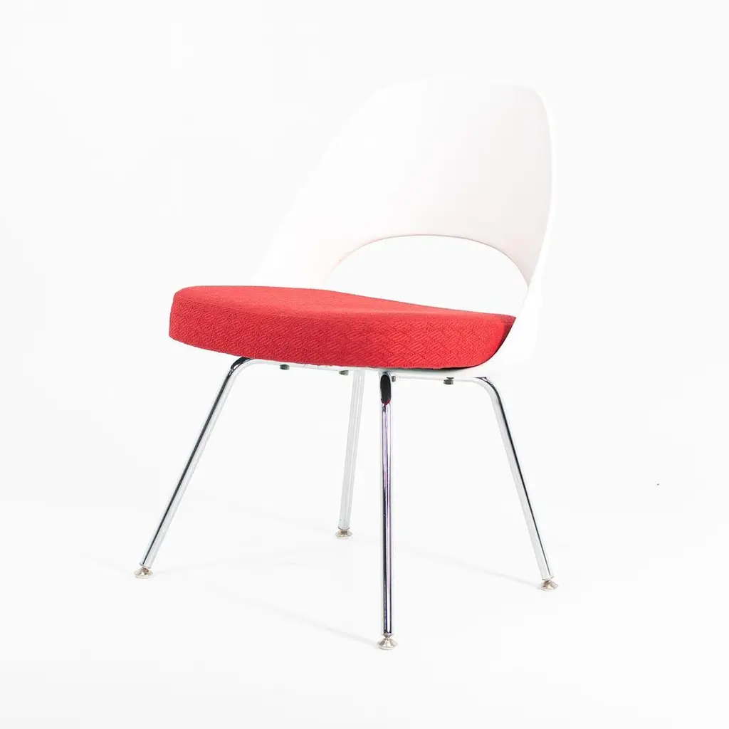 This is a Saarinen Executive Side Chair, model 72C, designed by Eero Saarinen for Knoll in 1950. These particular examples date to 2011. The listed price includes one chair, and we have several available for individual purchase. The chairs feature a white plastic back & have red fabric upholstered seats. This version of the 72C has chromed-steel tubular legs. Each chair measures 20.5 inches long, 22.5 inches wide, and 31.5 inches high. They have a seat height of 18.75 inches. The chairs have seen little use. The seats may exhibit an errant stain, and the chromed-steel legs possibly have a small scuff or two. Overall, these chairs are in excellent condition with light wear. Please see photos. Genuinely faulty goods will be replaced or money refunded on a case by case basis, however we must be advised of any faulty goods upon receipt of the item. It is the customer's responsibility to pay for return shipping and ship the item back to us. If the item is found to be faulty, we will also refund the postage cost. If there is no damage to the item, but a return is approved, the buyer will be responsible for both the initial and return shipping cost. It is at our discretion to refuse the refund of undamaged goods. If an order is placed and you would like to cancel the order, please notify us immediately. Any refunds will be processed via the same means that payment was made.