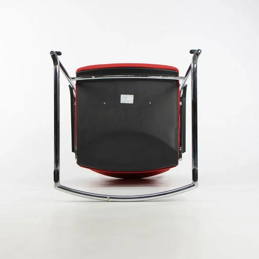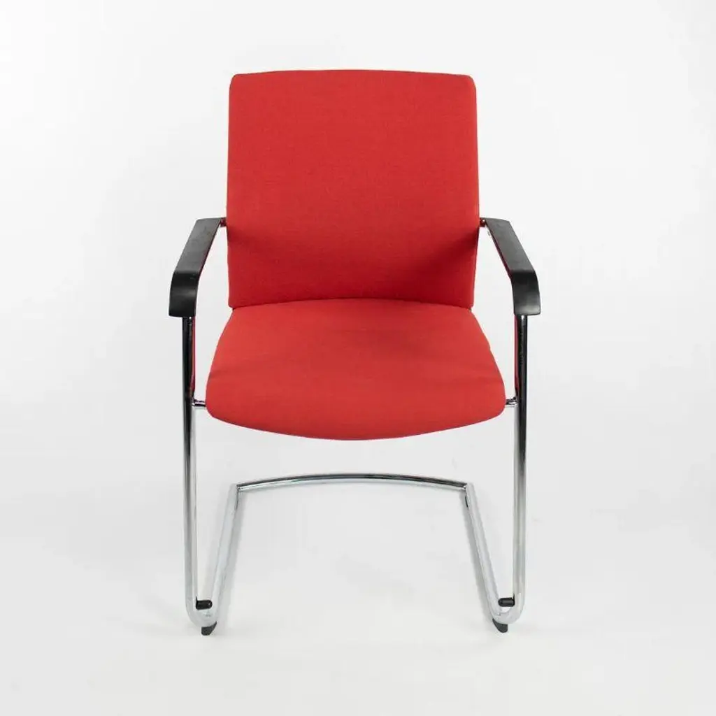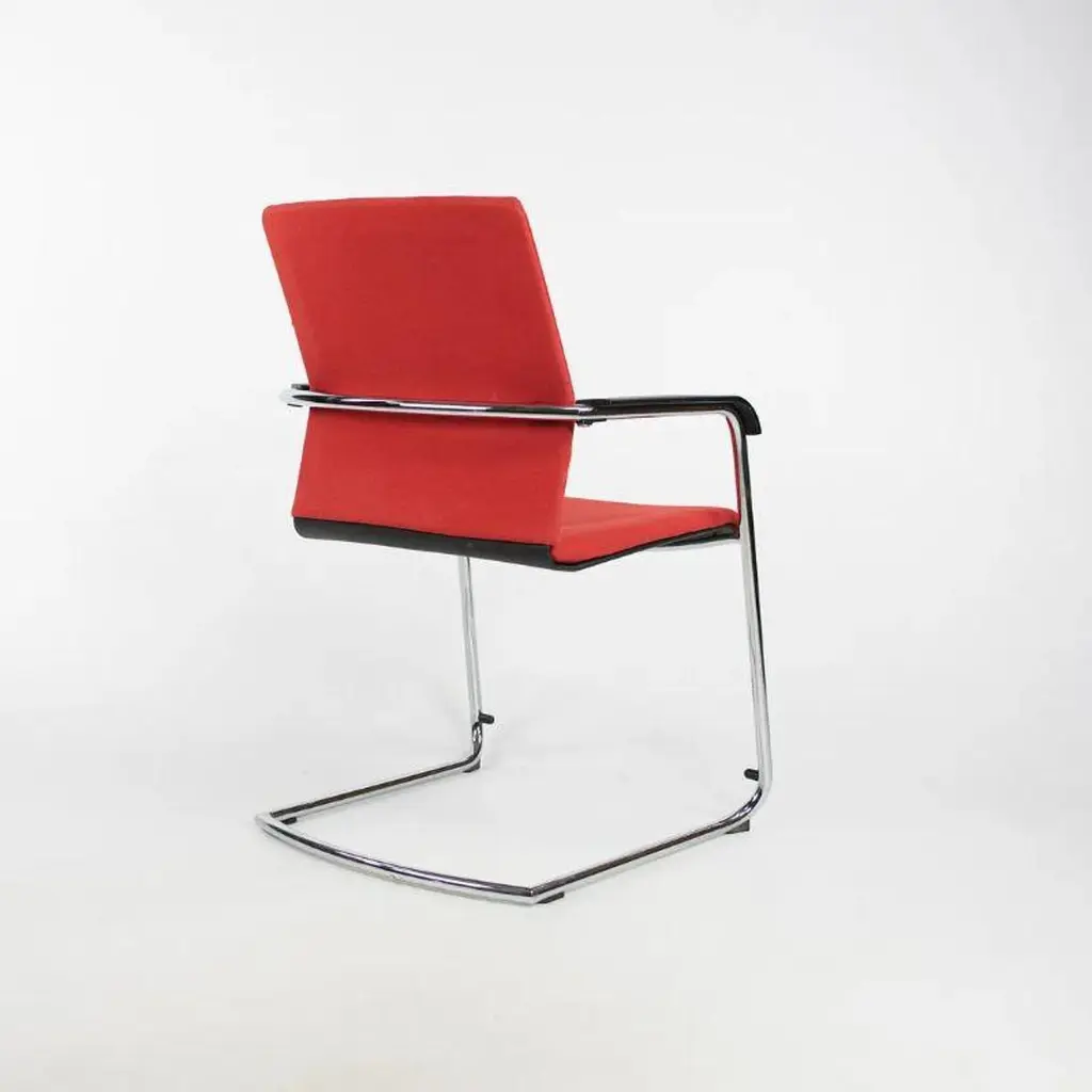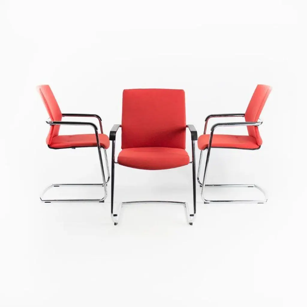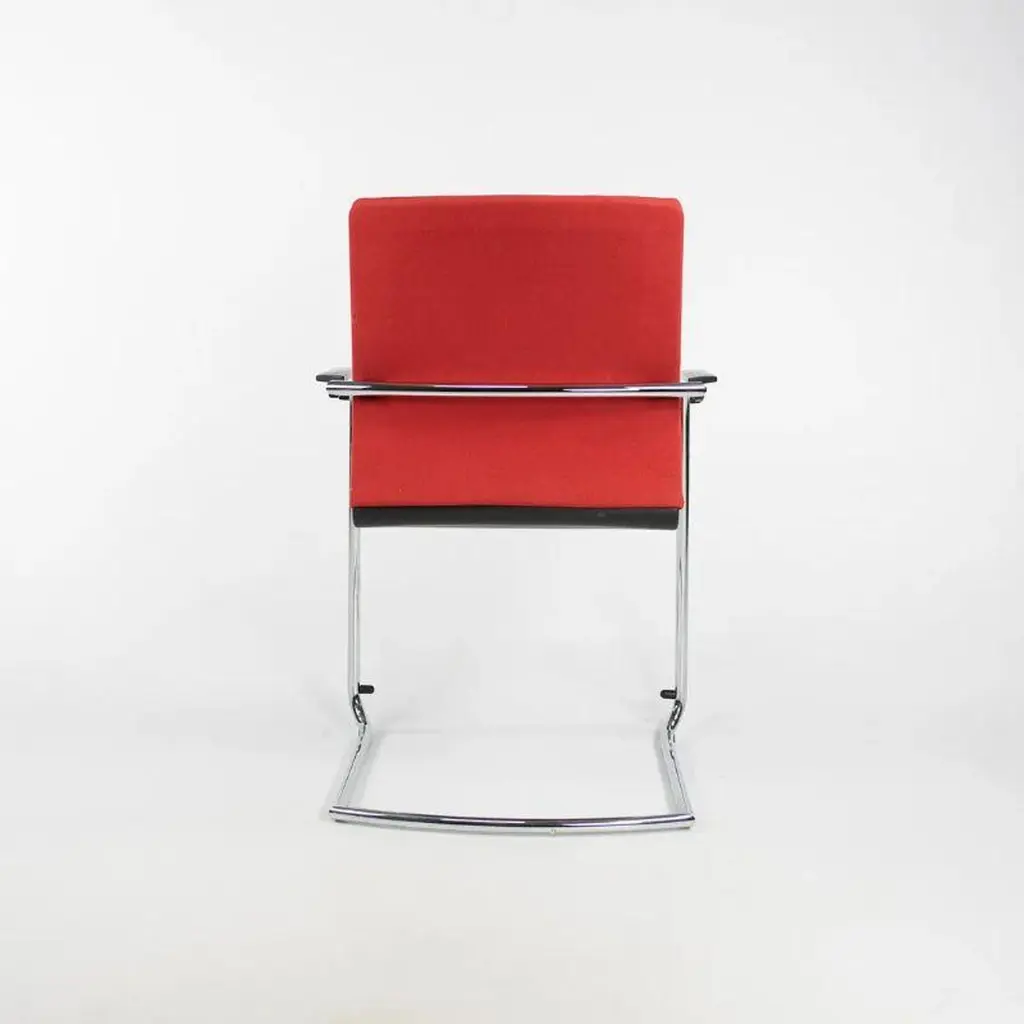 This is a single ON Cantiliever stackable side chair, designed by the Germany design group Wiege and produced by Wilkhahn. The chairs are beautifully constructed from chromed tubular steel and upholstered in a modern solid red fabric. Wilkhahn is a renowned German manufacturer. They have collaborated with phenomenal designers over the years, though their pieces are seldom seen in the US. Condition overall is excellent with some light wear from use. The red fabric is vibrant arms are in nice shape generally. These chairs measure 36 inches tall by 23 inches wide and 23 inches deep. The price listed is for each chair. Multiples chairs (or sets) are available.