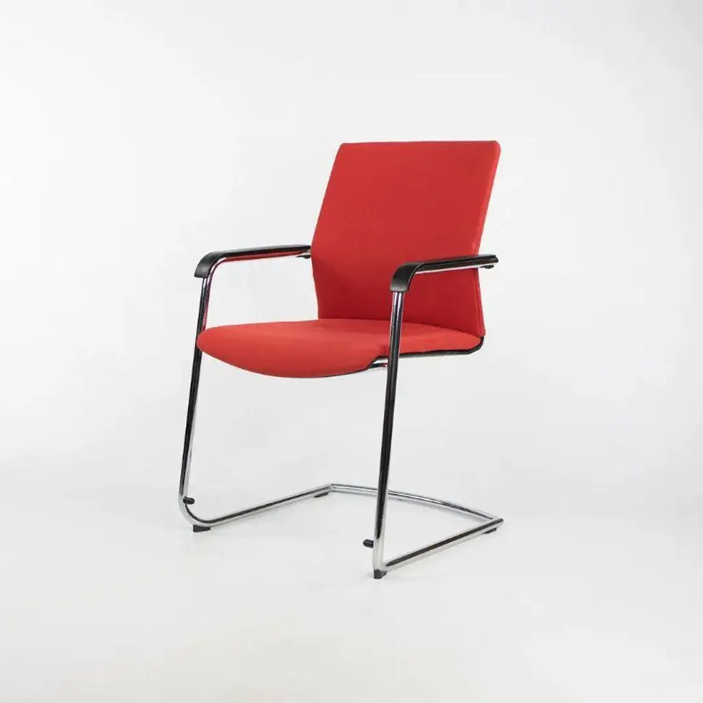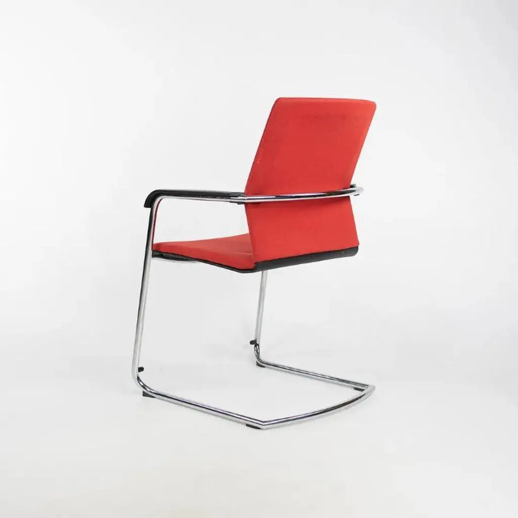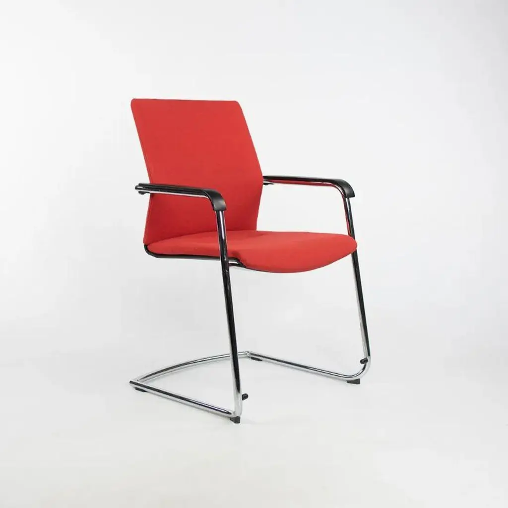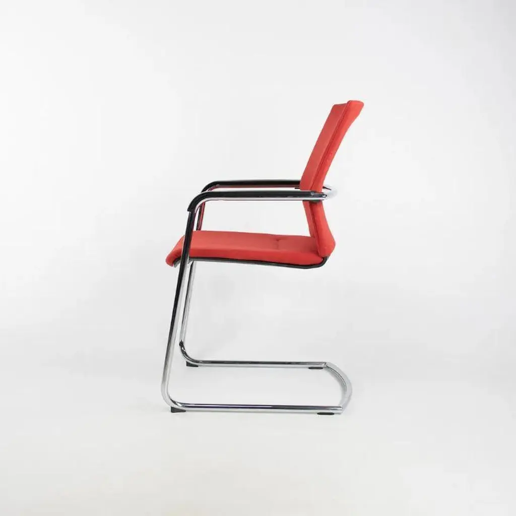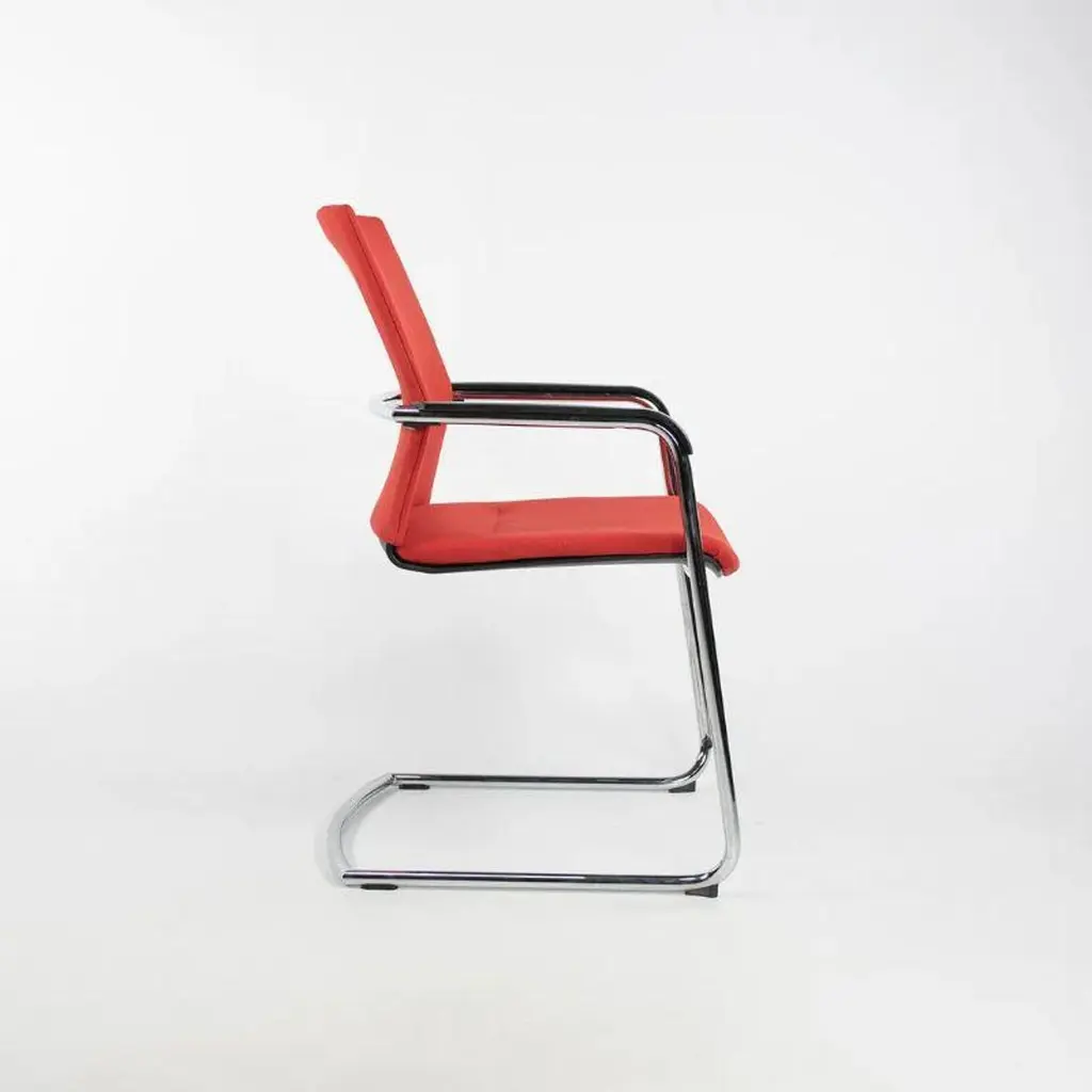 This is a single ON Cantiliever stackable side chair, designed by the Germany design group Wiege and produced by Wilkhahn. The chairs are beautifully constructed from chromed tubular steel and upholstered in a modern solid red fabric. Wilkhahn is a renowned German manufacturer. They have collaborated with phenomenal designers over the years, though their pieces are seldom seen in the US. Condition overall is excellent with some light wear from use. The red fabric is vibrant arms are in nice shape generally. These chairs measure 36 inches tall by 23 inches wide and 23 inches deep. The price listed is for each chair. Multiples chairs (or sets) are available.