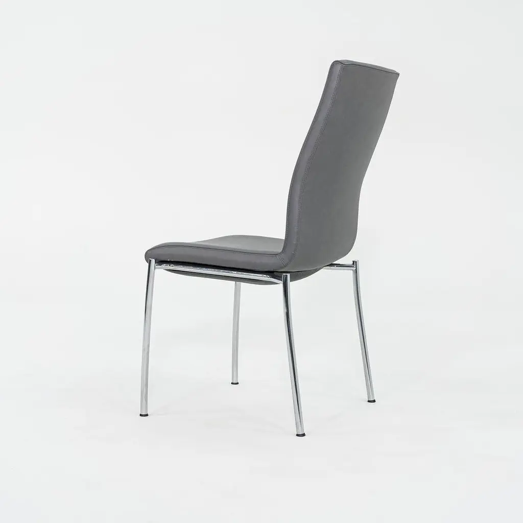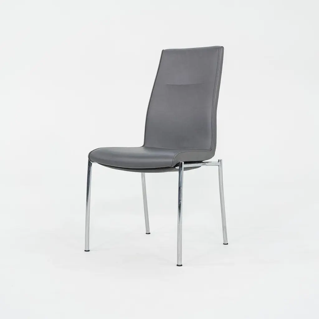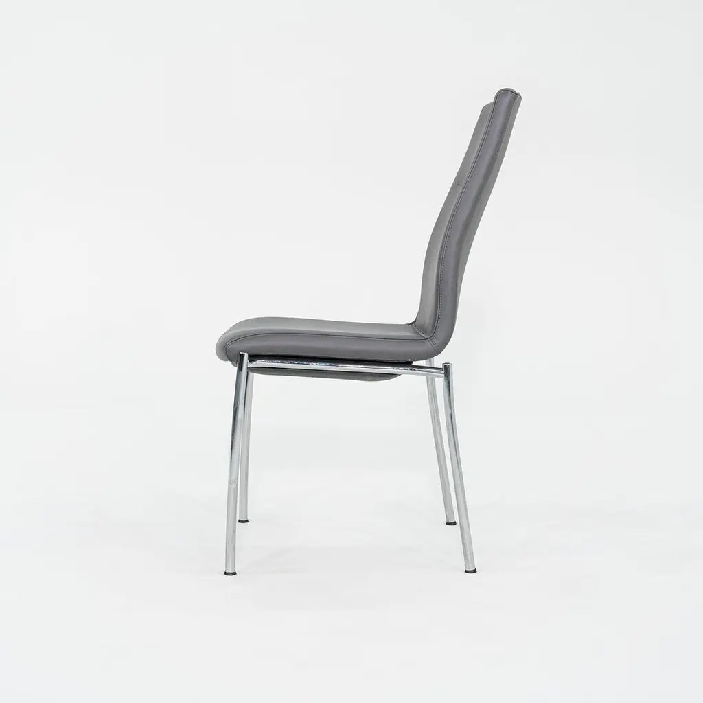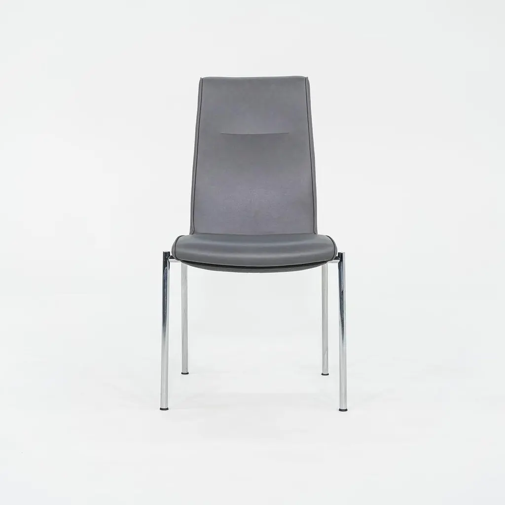 This is an Ona Plaza Stacking Side Dining Chair, initially designed by Jorge Pensi for Kusch & Co. in Germany in 1996. These examples date to 2013. Their minimalist design features a chromed-steel frame having 4 legs, and has an elegant high back. These examples are upholstered in grey leather. The listed price includes one side chair, and we have eight available for purchase. Each chair measures 24 inches deep, 23 inches wide, and is 38 inches tall. The seat height is 17 inches, and the seat depth is 18 inches. The upholstery is in very good condition, with minimal wear. The legs have some minor scuffs and scratches. Overall, these chairs are in very good condition with light wear. Please see photos.