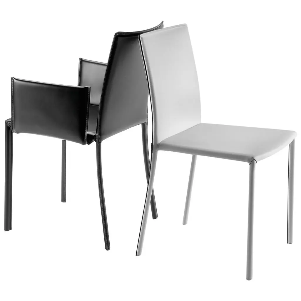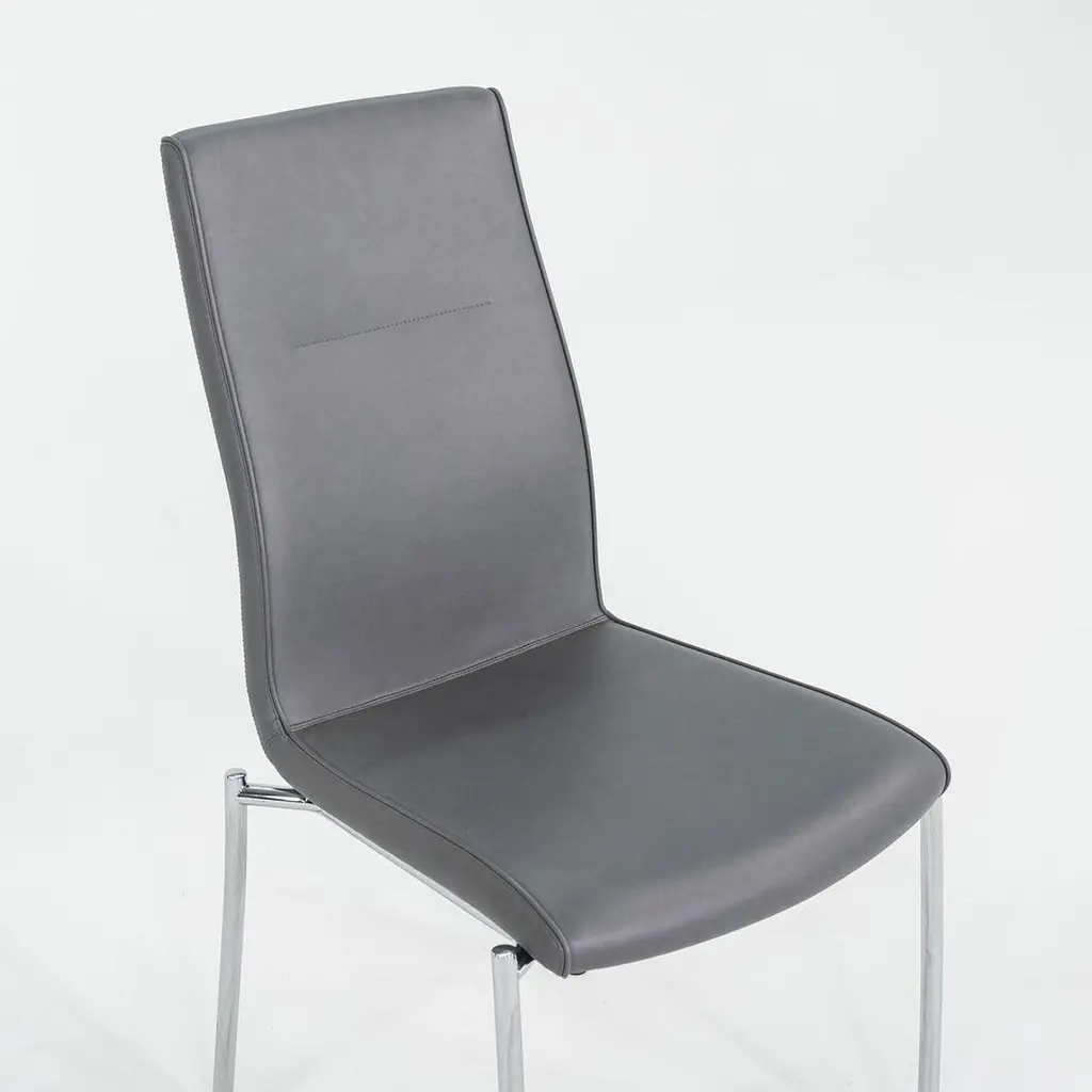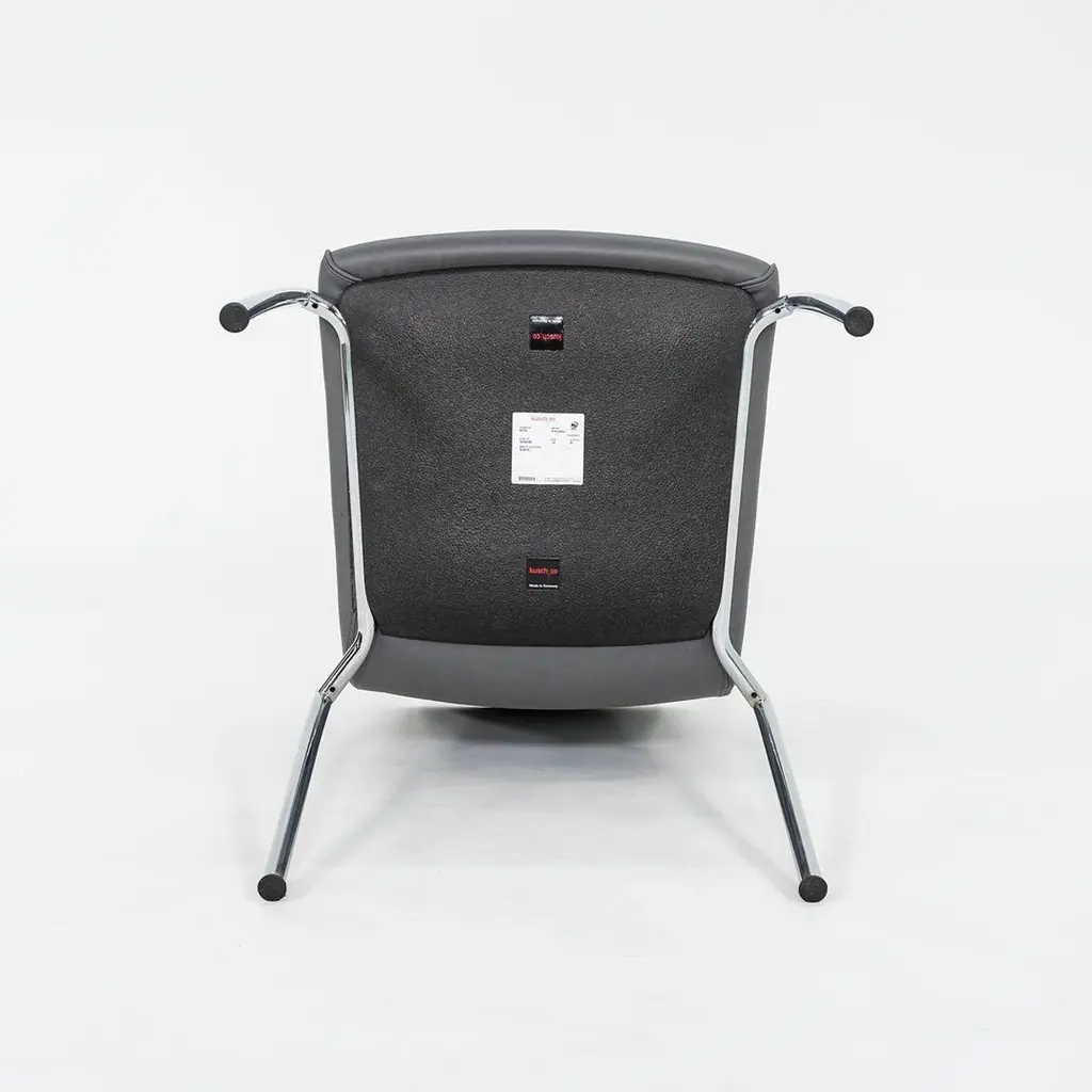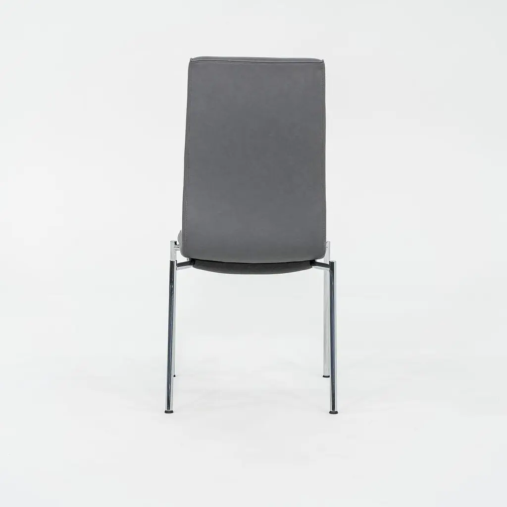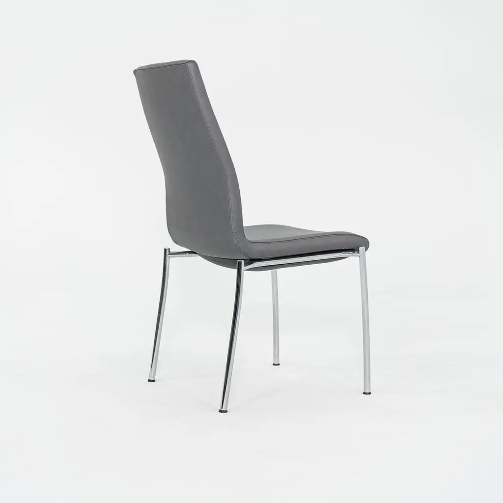 This is an Ona Plaza Stacking Side Dining Chair, initially designed by Jorge Pensi for Kusch & Co. in Germany in 1996. These examples date to 2013. Their minimalist design features a chromed-steel frame having 4 legs, and has an elegant high back. These examples are upholstered in grey leather. The listed price includes one side chair, and we have eight available for purchase. Each chair measures 24 inches deep, 23 inches wide, and is 38 inches tall. The seat height is 17 inches, and the seat depth is 18 inches. The upholstery is in very good condition, with minimal wear. The legs have some minor scuffs and scratches. Overall, these chairs are in very good condition with light wear. Please see photos.