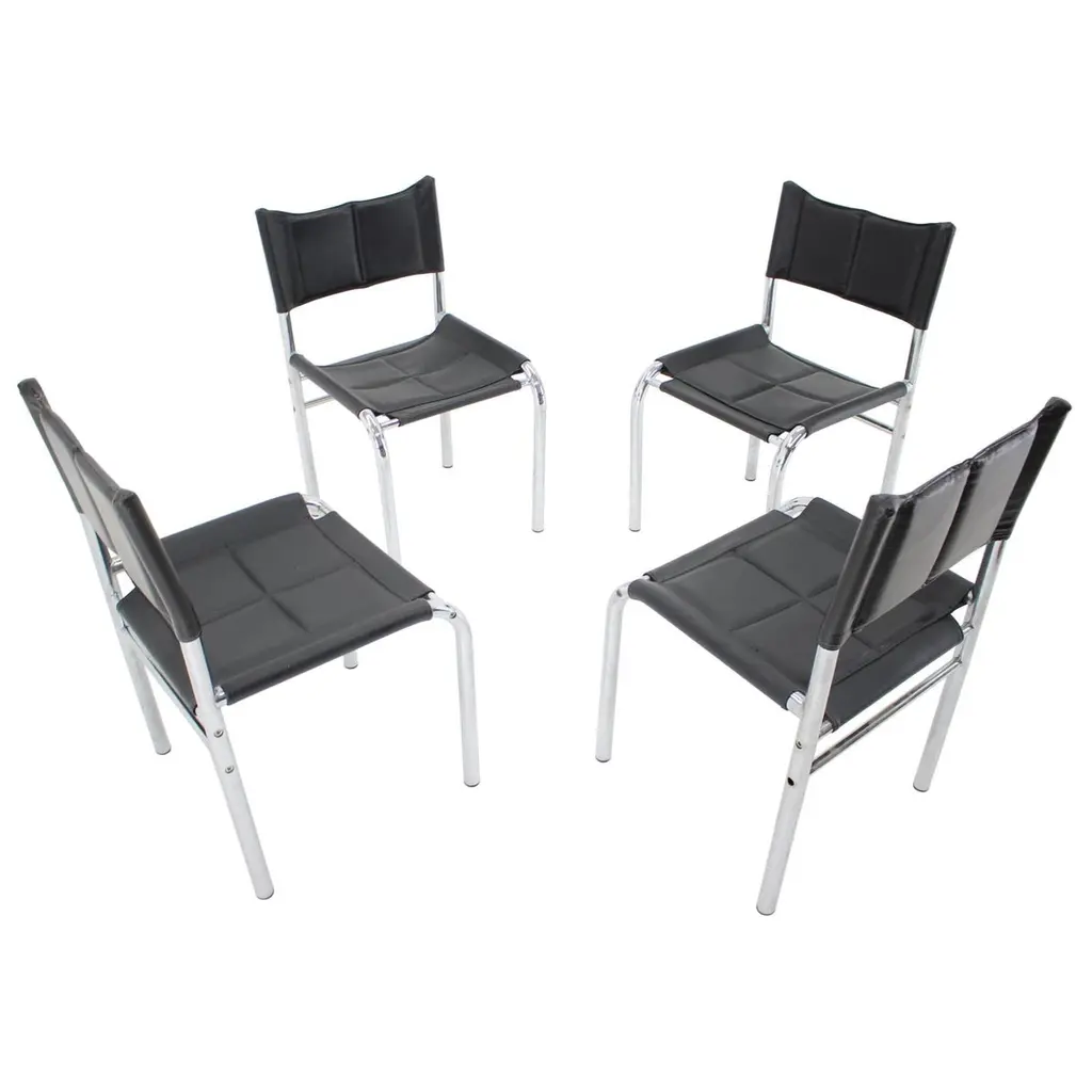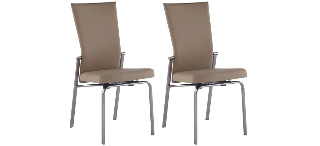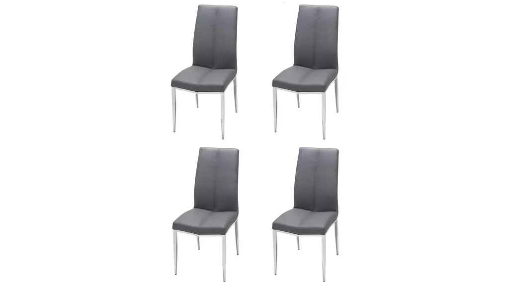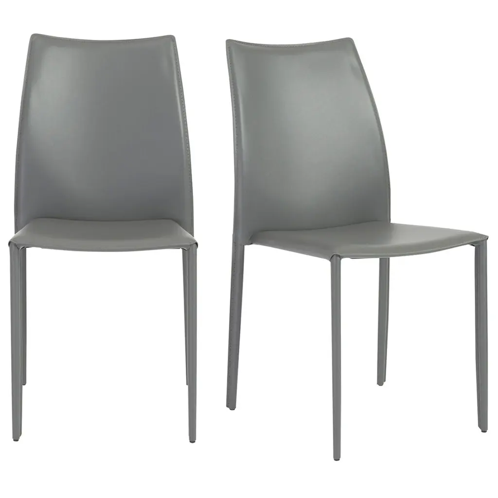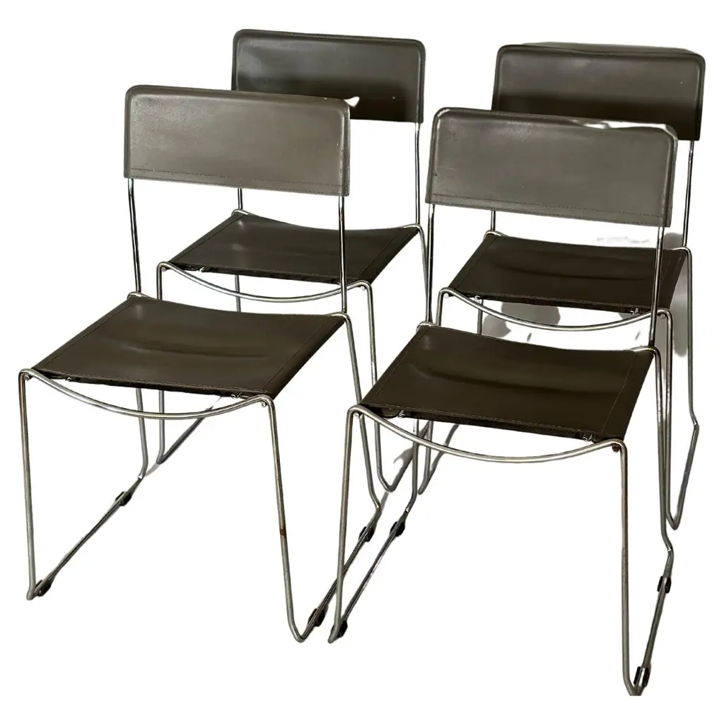 This is an Ona Plaza Stacking Side Dining Chair, initially designed by Jorge Pensi for Kusch & Co. in Germany in 1996. These examples date to 2013. Their minimalist design features a chromed-steel frame having 4 legs, and has an elegant high back. These examples are upholstered in grey leather. The listed price includes one side chair, and we have eight available for purchase. Each chair measures 24 inches deep, 23 inches wide, and is 38 inches tall. The seat height is 17 inches, and the seat depth is 18 inches. The upholstery is in very good condition, with minimal wear. The legs have some minor scuffs and scratches. Overall, these chairs are in very good condition with light wear. Please see photos.