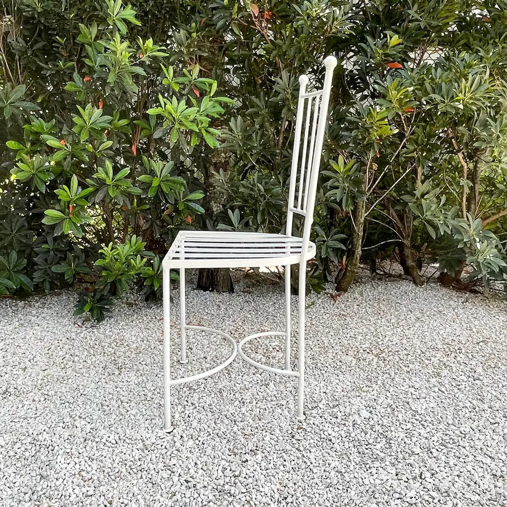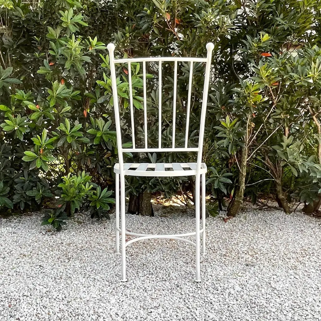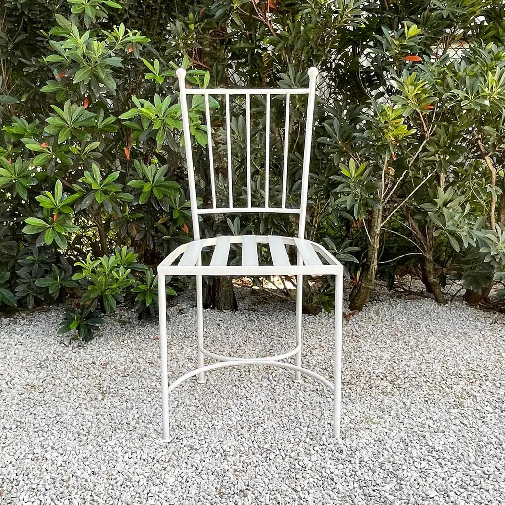 A French side chair inspired by the charming European garden furniture of the 19th/20th Century. The upright back is topped by spheres and the wide metal seat slats have a white washed patina in a rust resistant paint. The powder coated wrought iron chair has a cushion.Seat 18" H